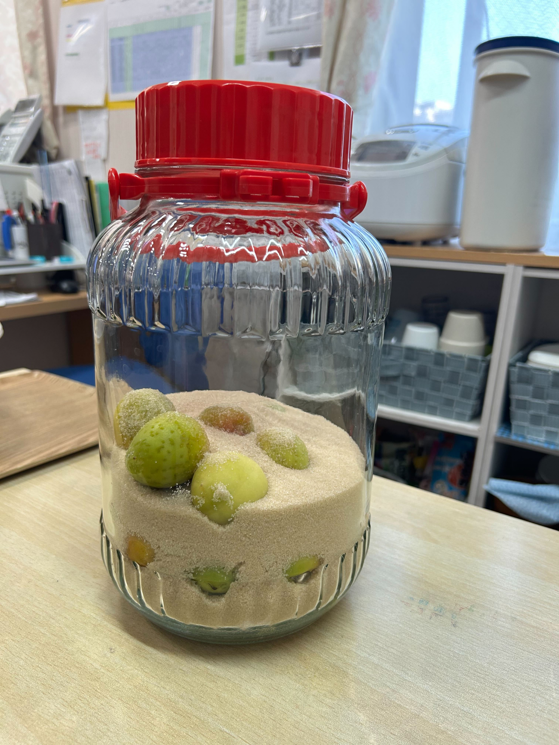 梅にフォークで穴をあけて、エキスが出るようにして、それをお砂糖と共に瓶に入れておくと、1か月後に完成するとのことです!!