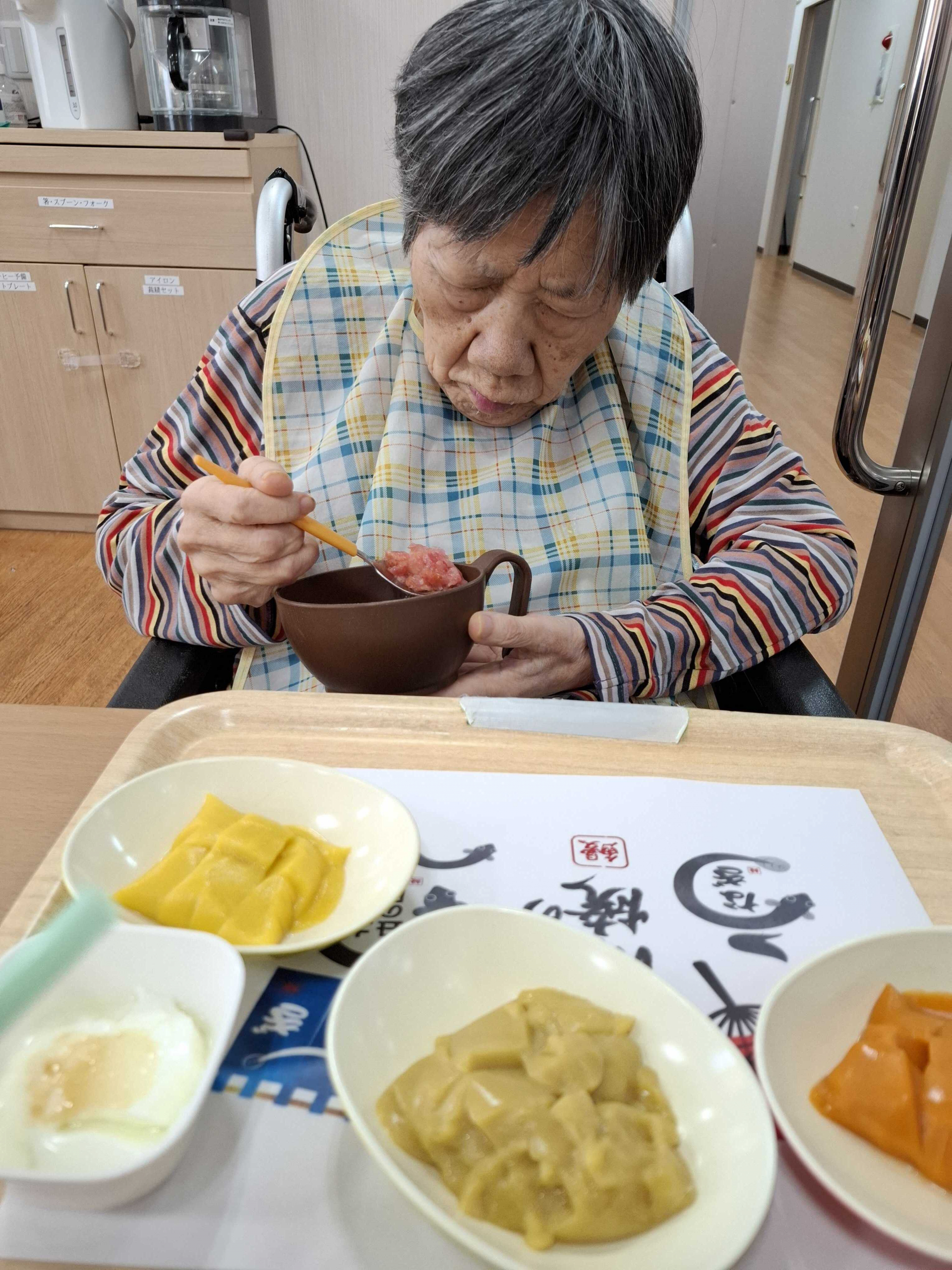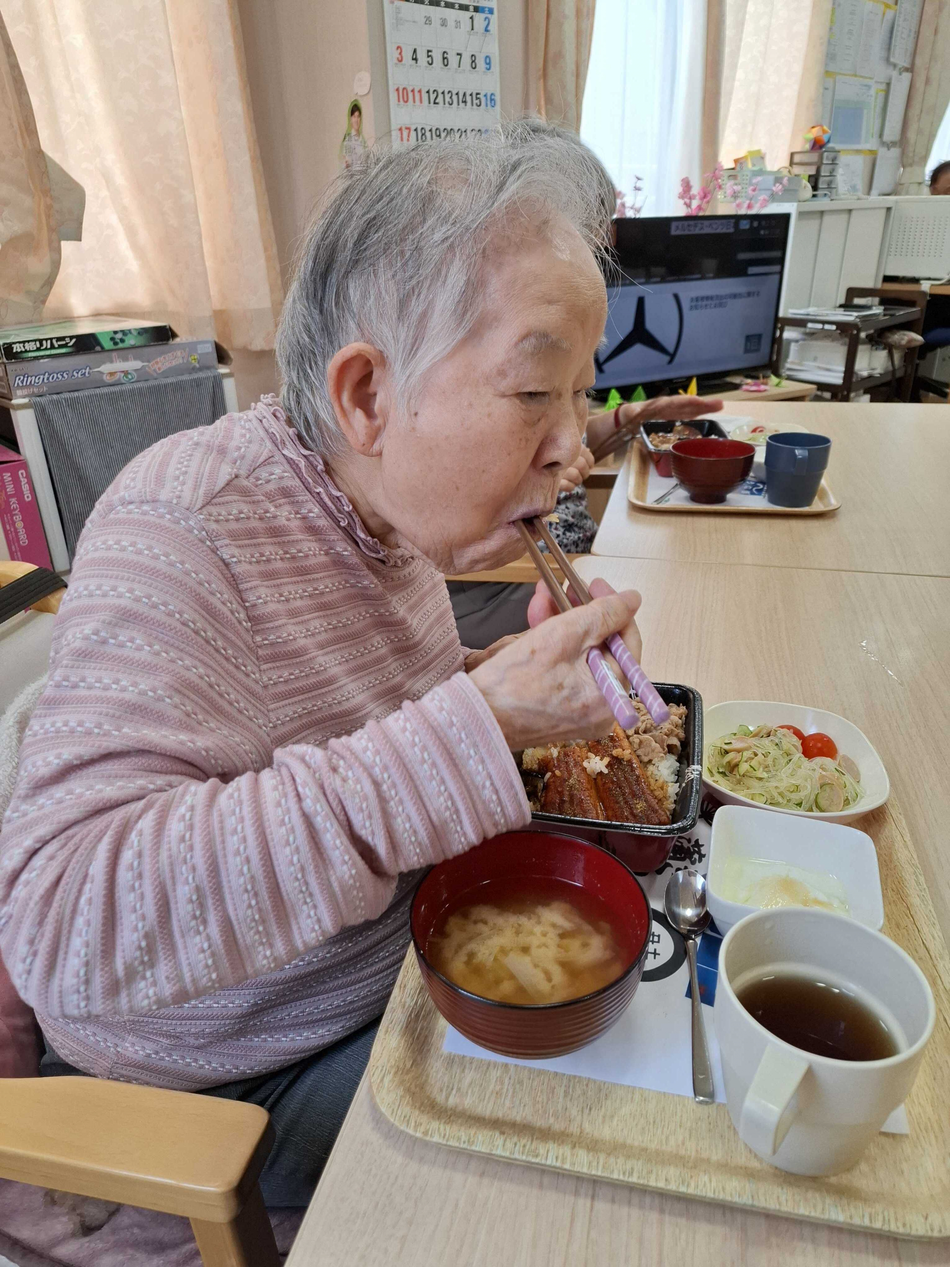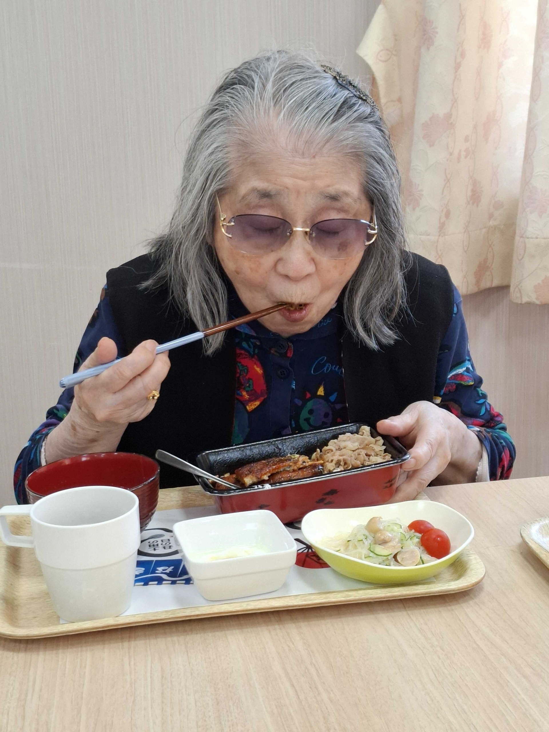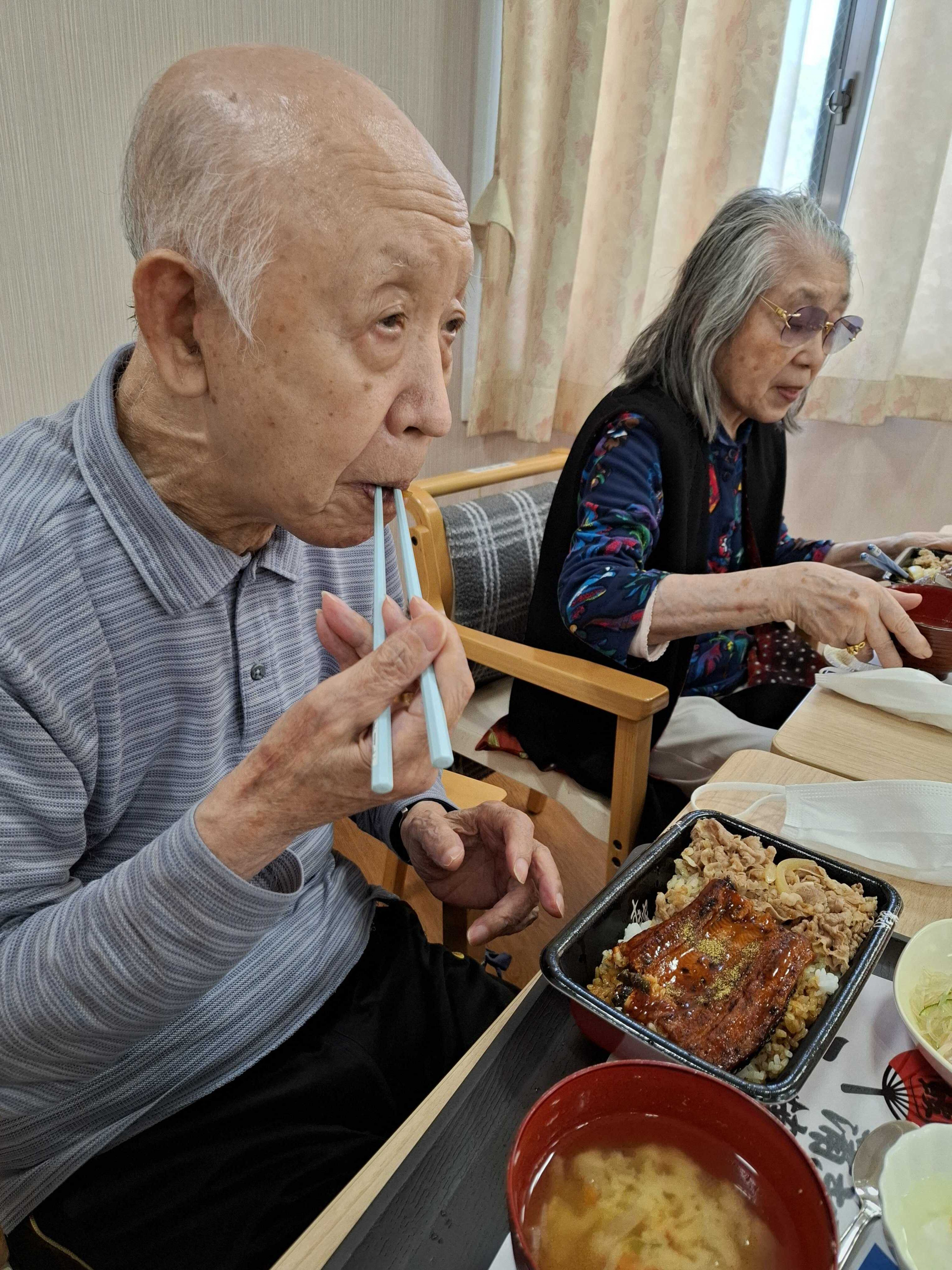 うなぎを食べたことがないという入居者さんもいましたが、「山椒かける?」等と和気あいあいと会話しながら召し上がっていました!