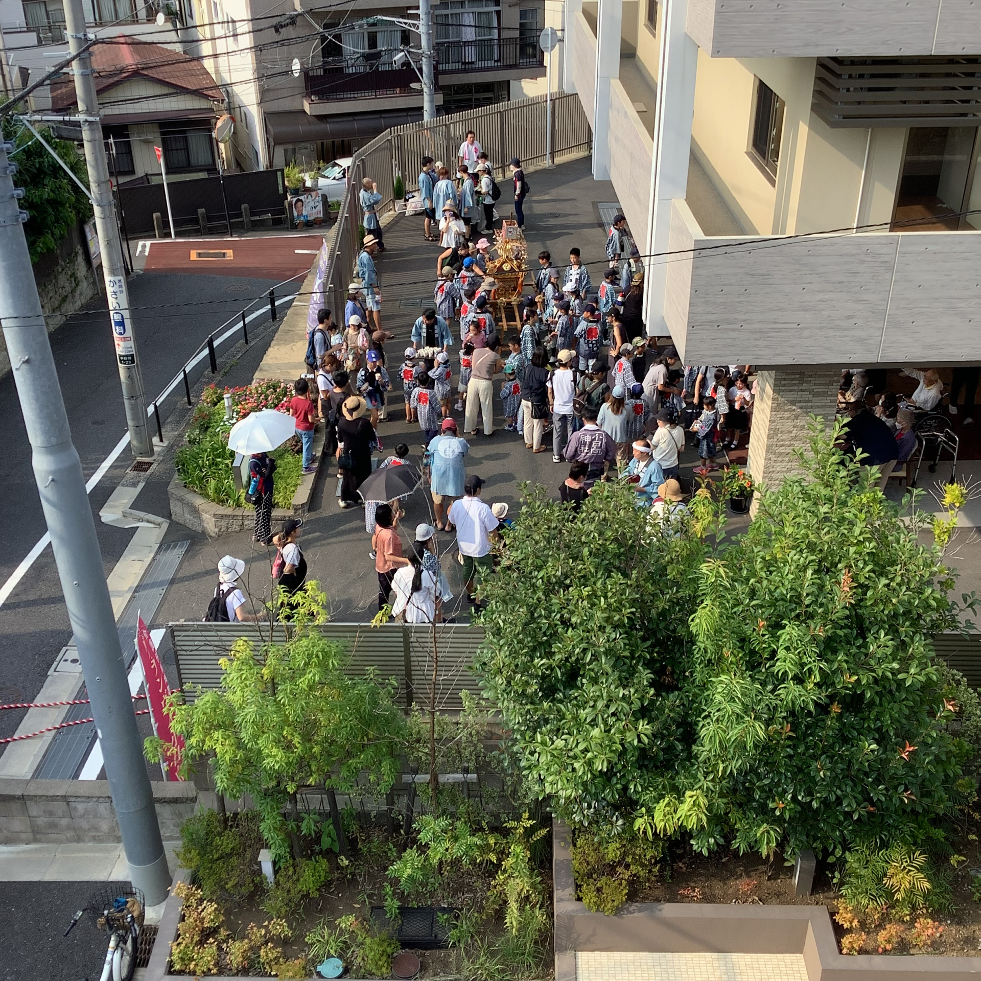 地元のお祭りです。賑やかな声が聞こえてきました。施設の前を子供神輿と山車が通ると聞いて見学です。