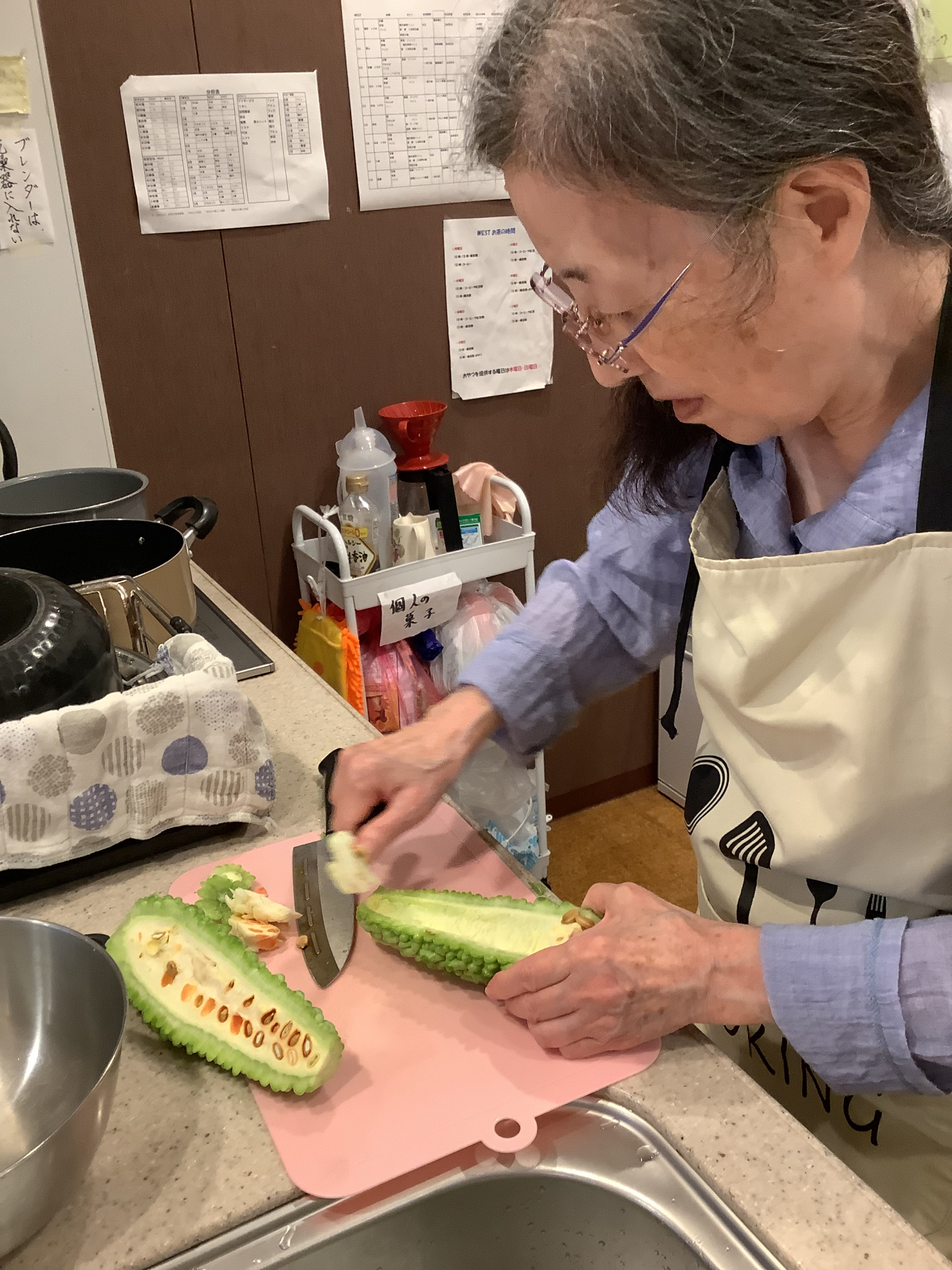 届いたゴーヤを調理。何にしようか相談してゴーヤサラダに。苦みをとる下処理が大変です。