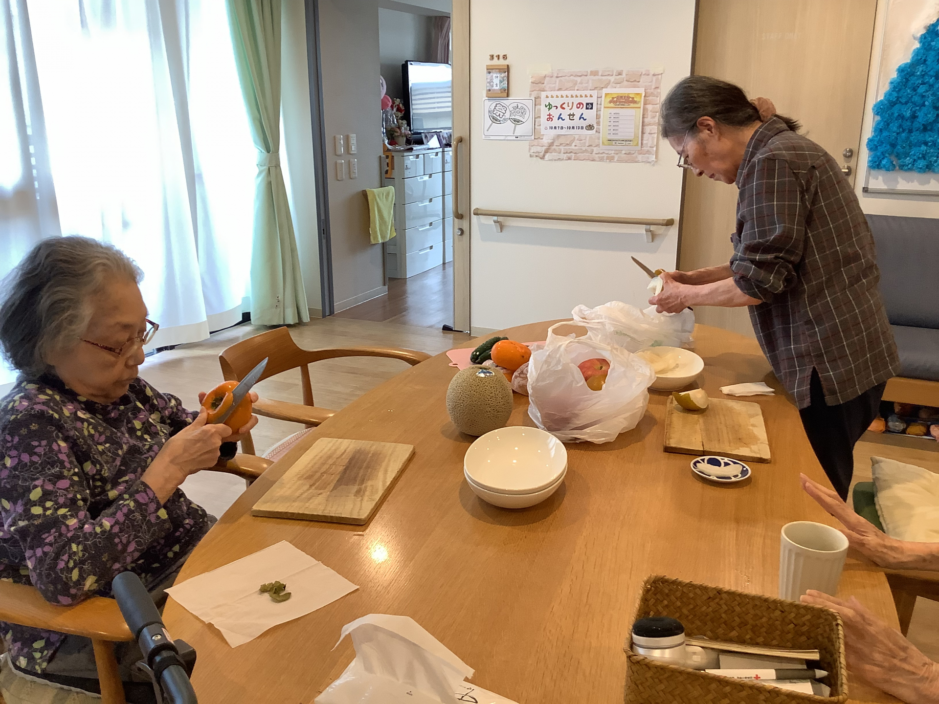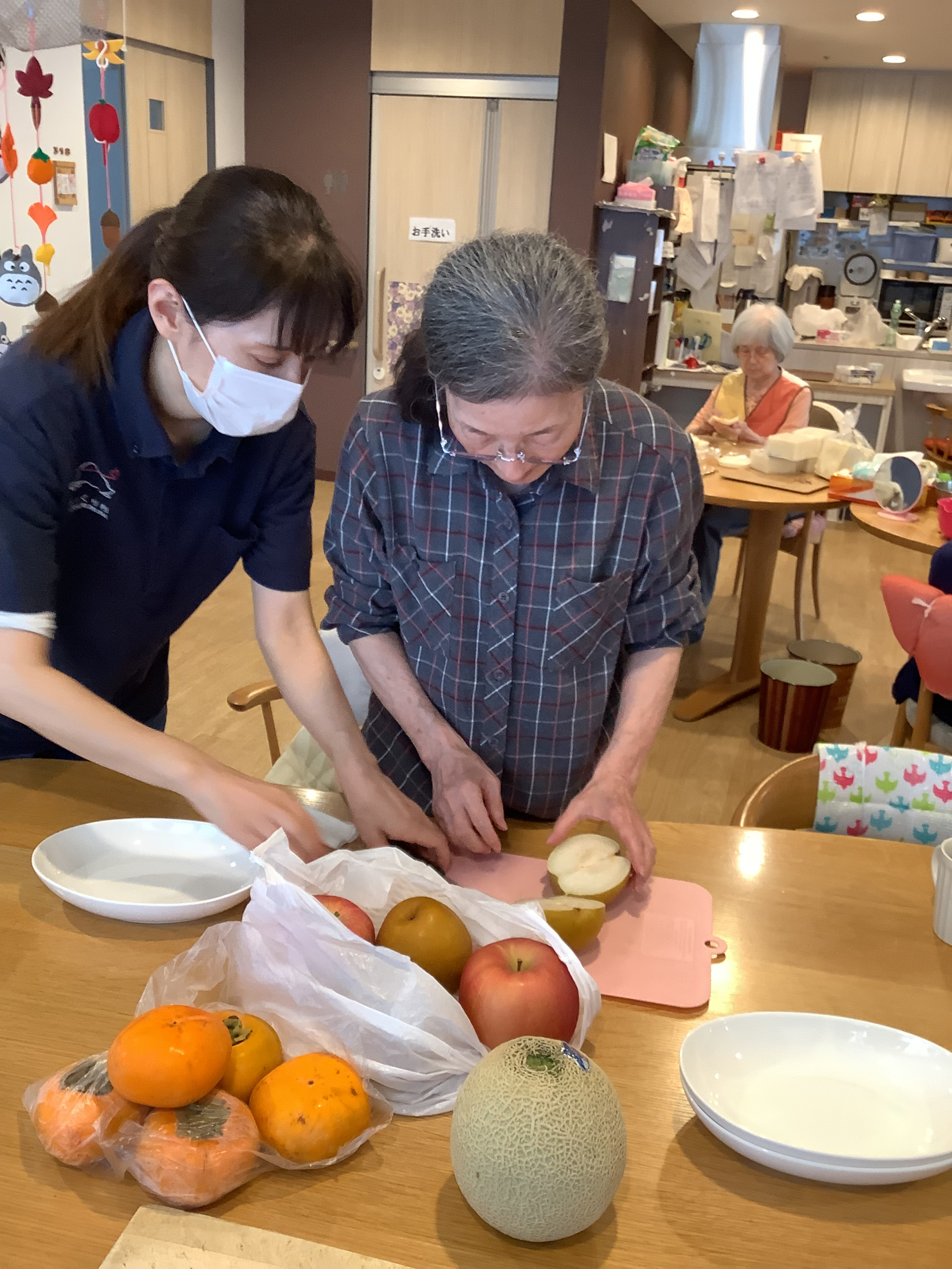 こちらのテーブルでは果物カットを・・りんご・梨・柿・メロン・巨峰・マスカット‼