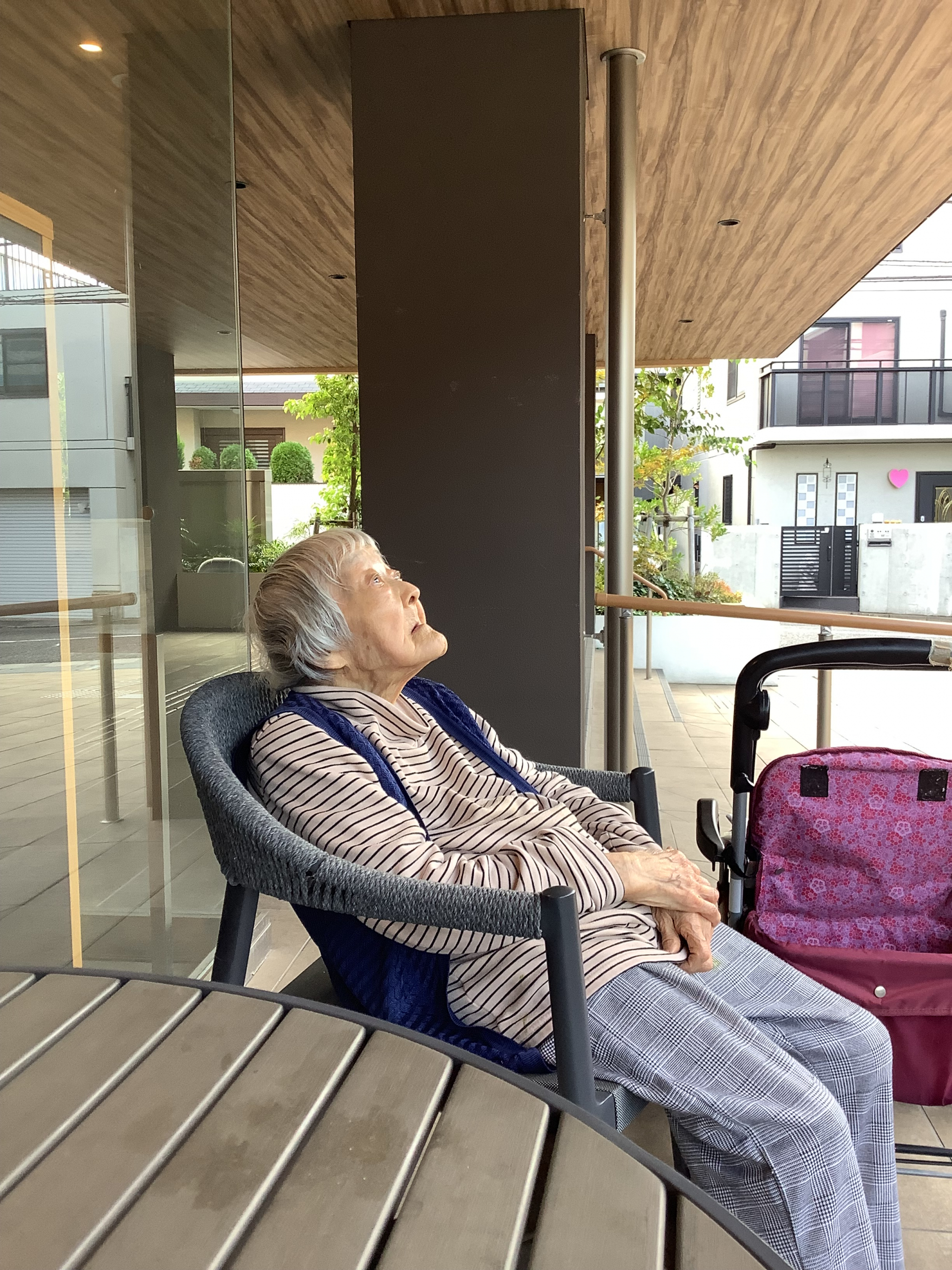 K様は久しぶりにベランダ散歩。外の空気はおいしい、、と。私もK様の笑顔が嬉しい。 小日向GH 秋羽