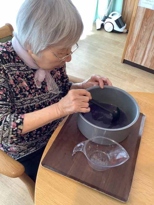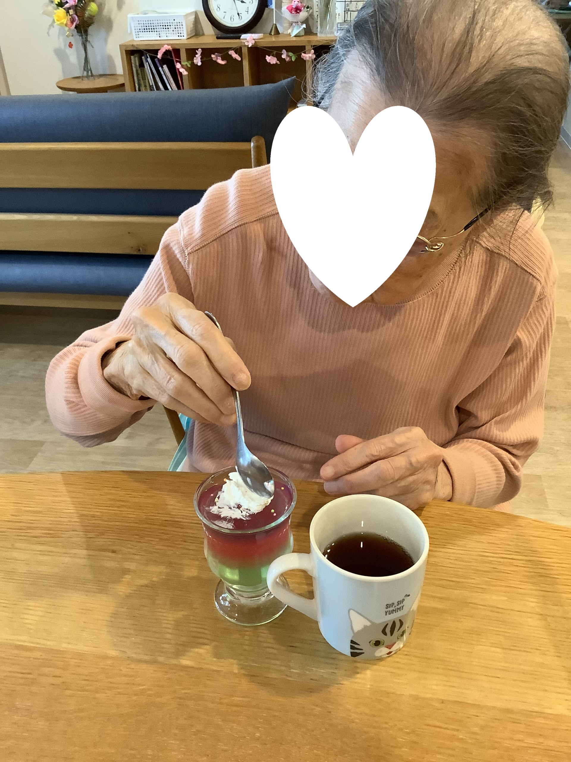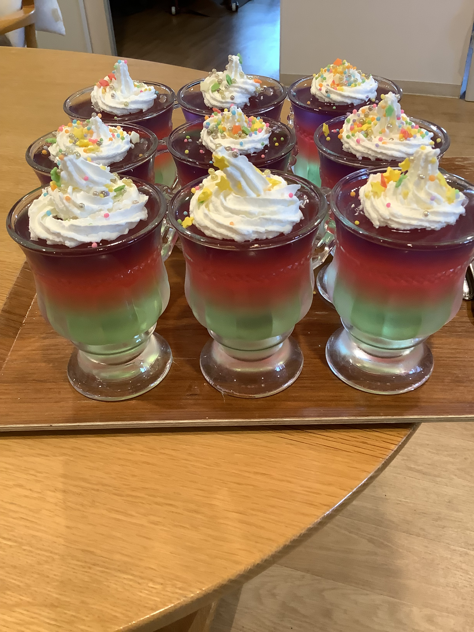 冷やしたプリンにワイプクーリムとキラキラ飾りをのせます!