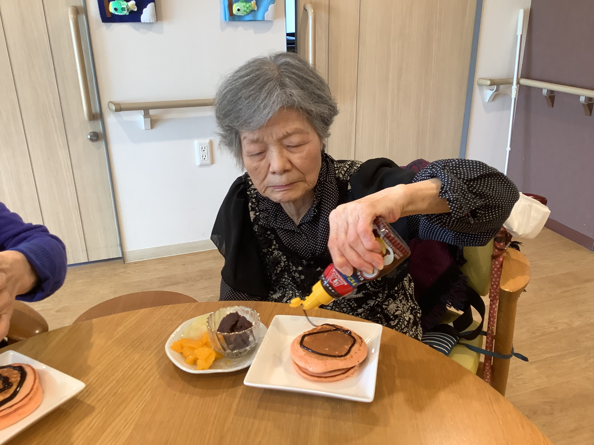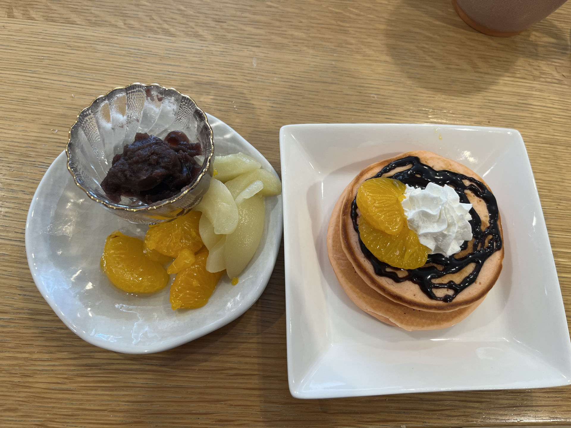 パンケーキにはチョコソースや黒蜜をかけ果物やあんこなど好きなようにトッピングします♬
