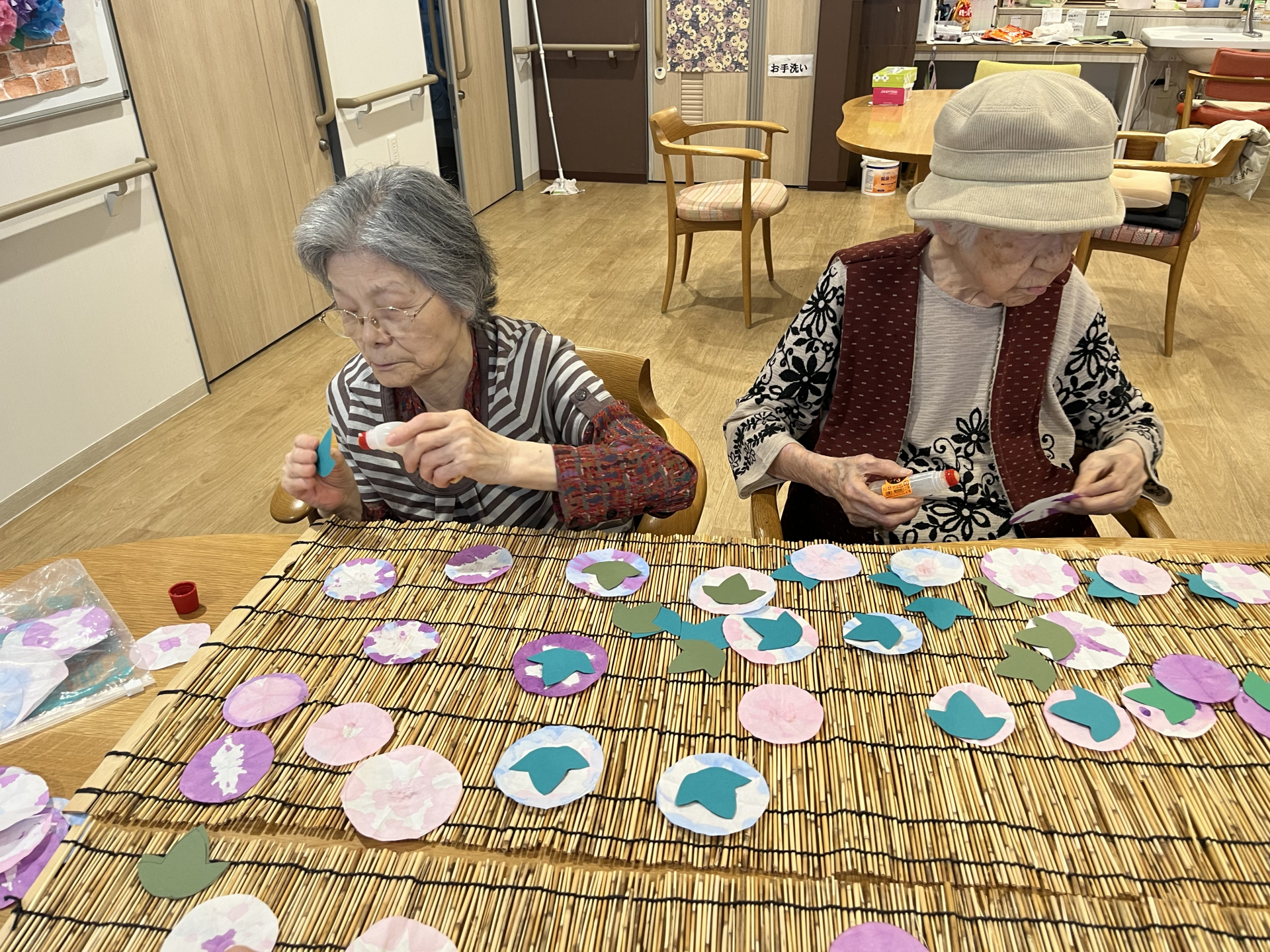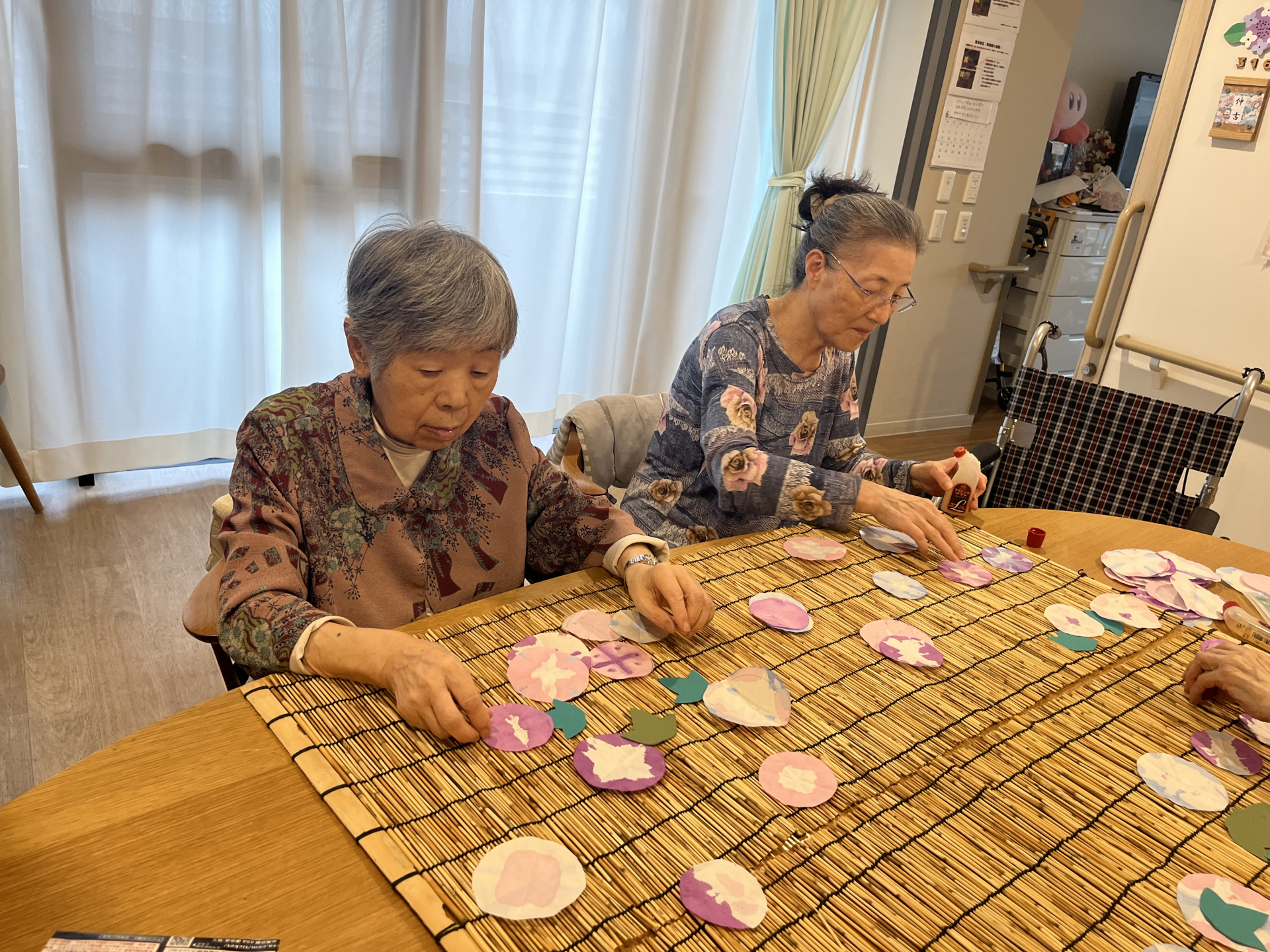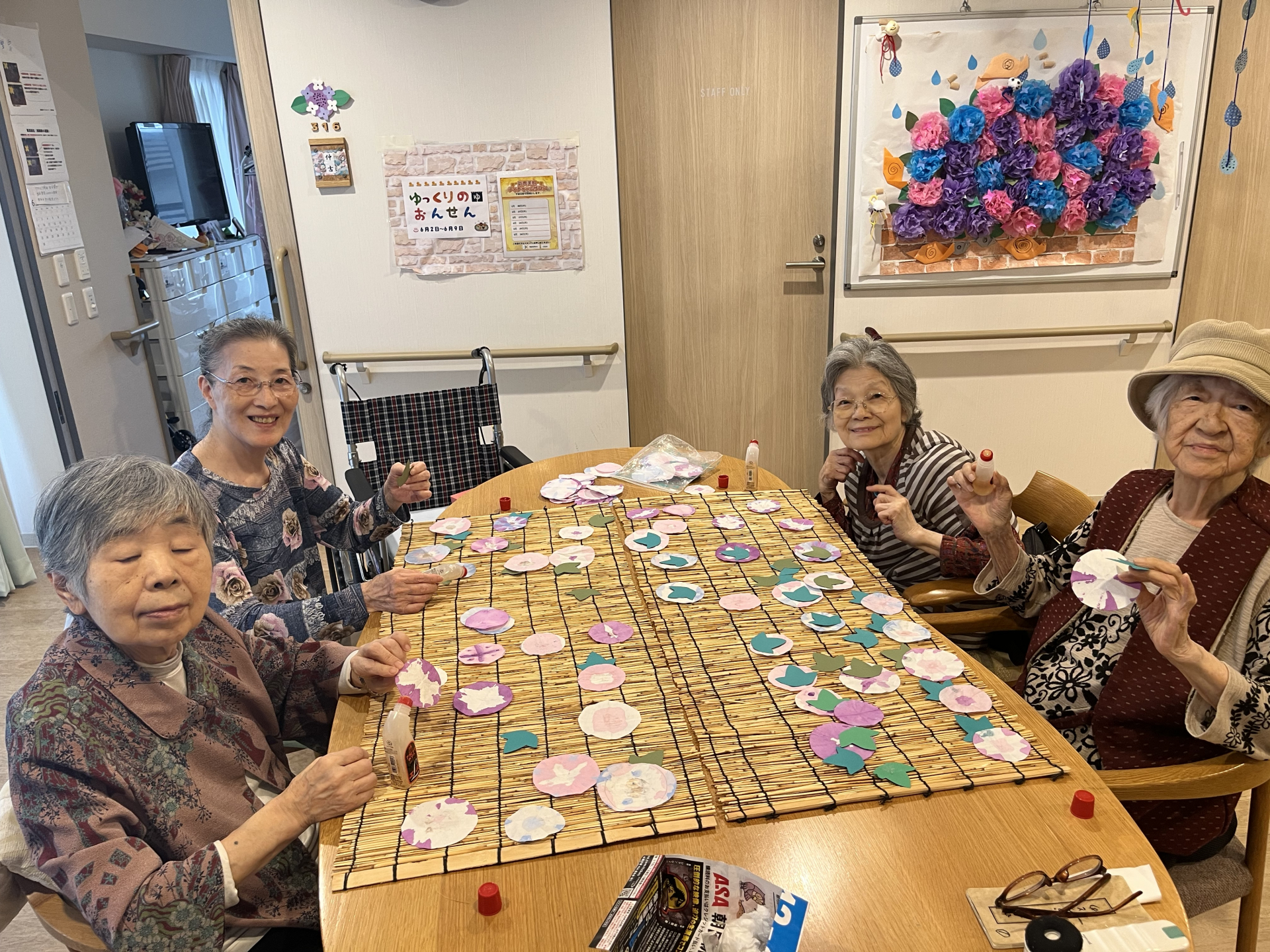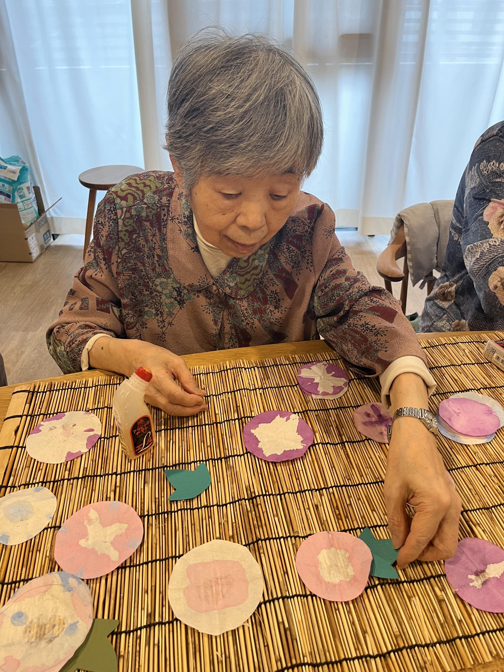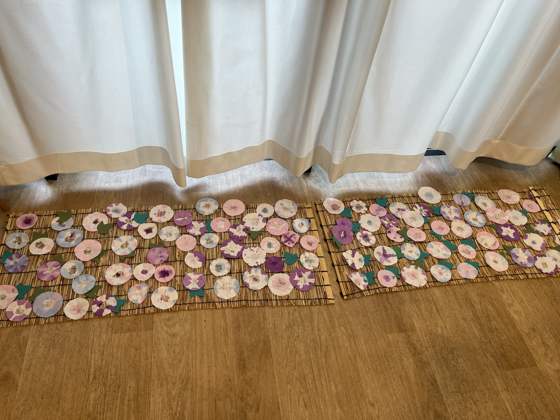 障子紙で作成した朝顔をすだれに飾っていきます♬