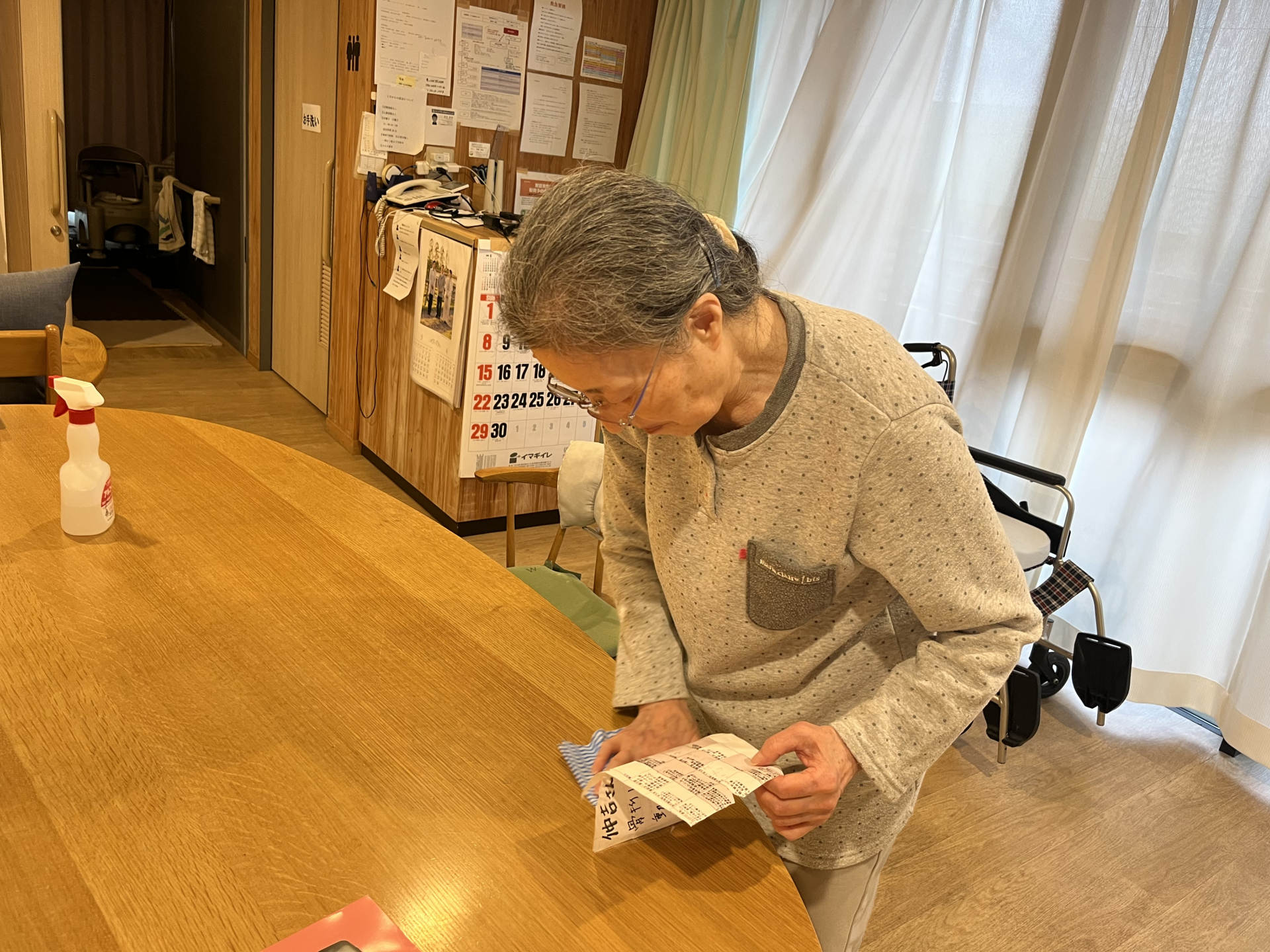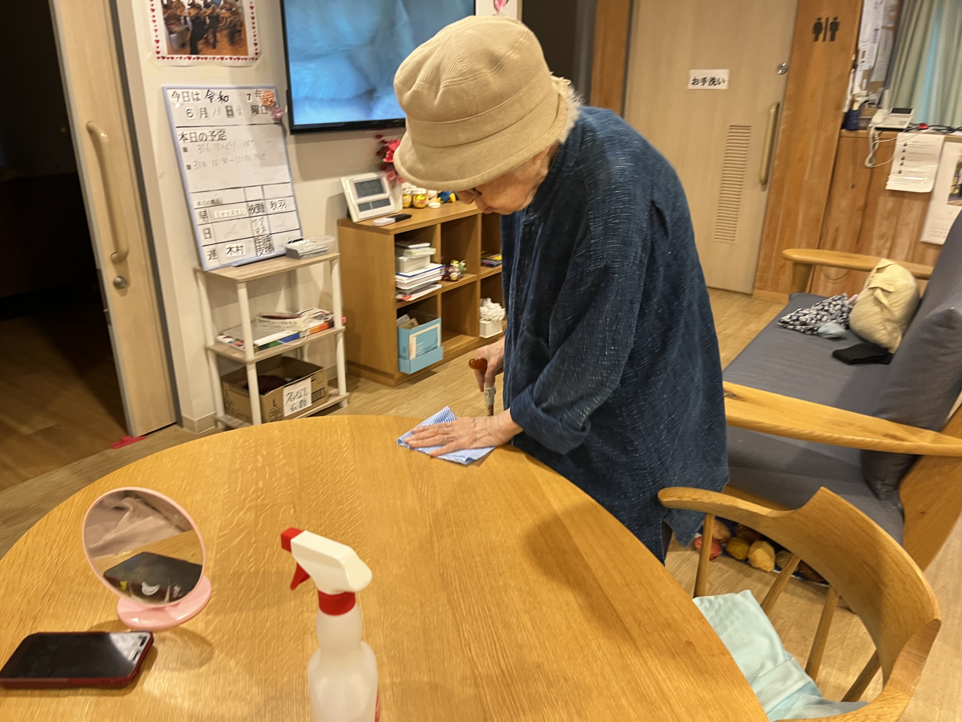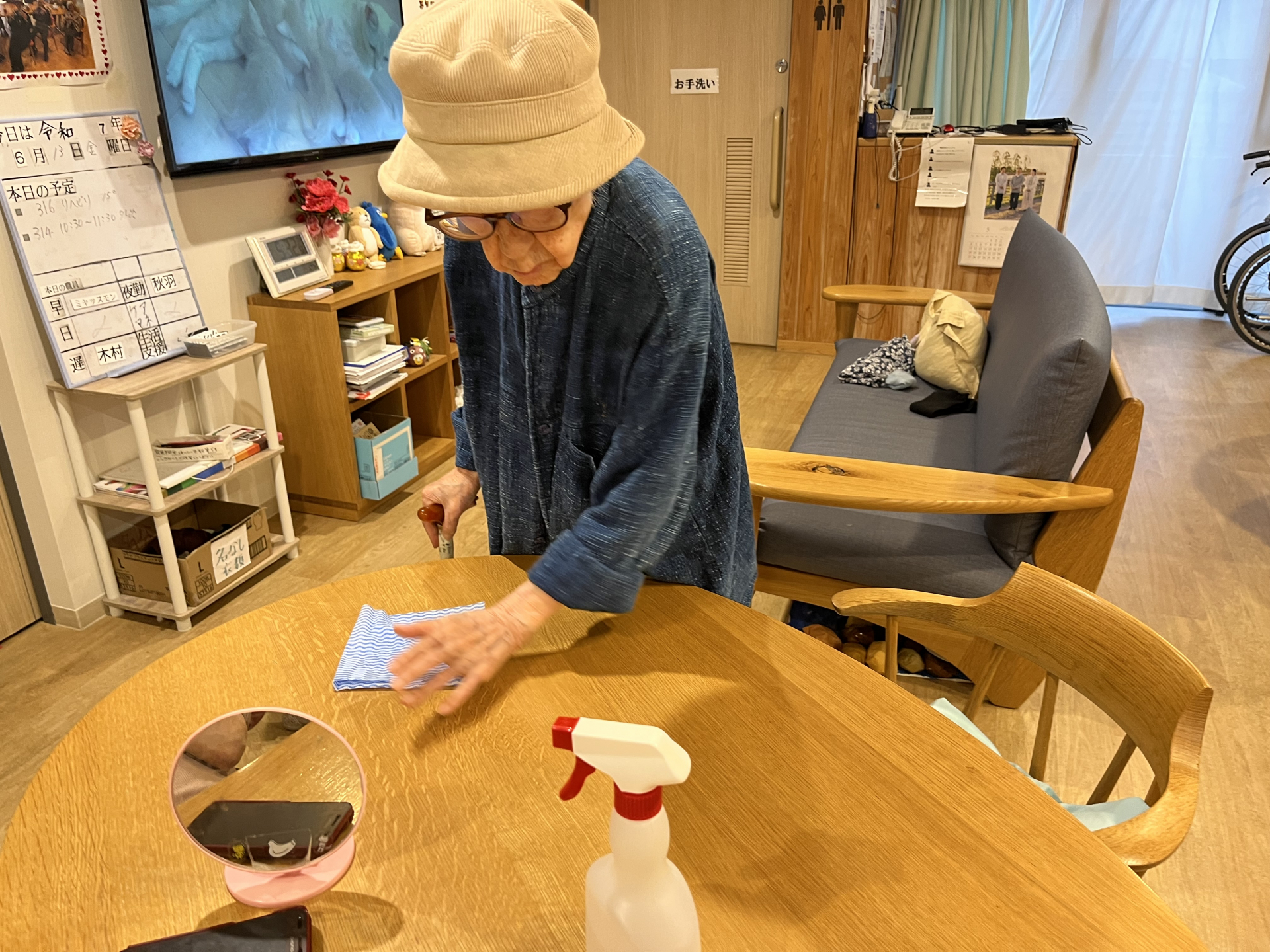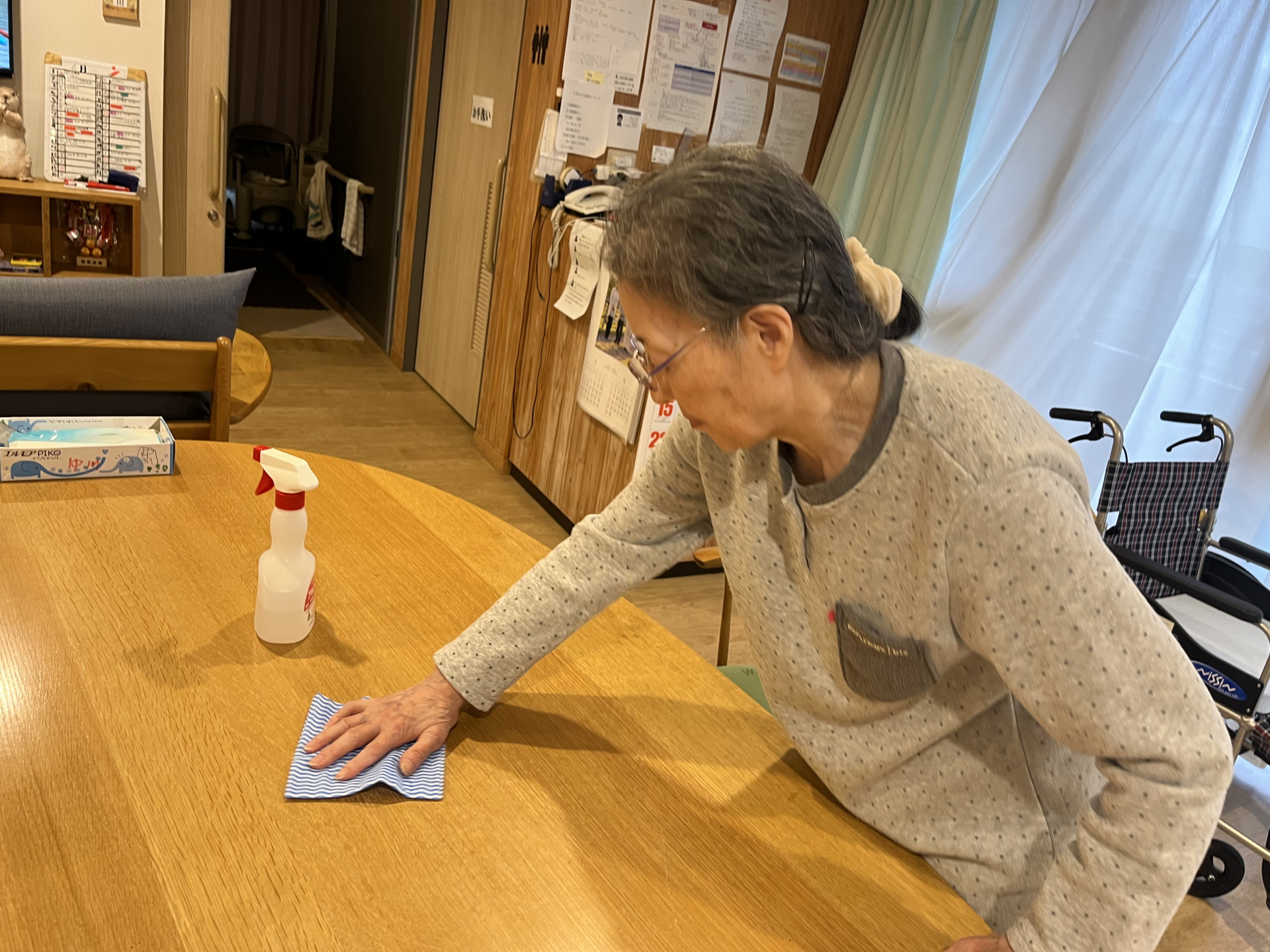 3つのテーブルを手分けして拭きます。