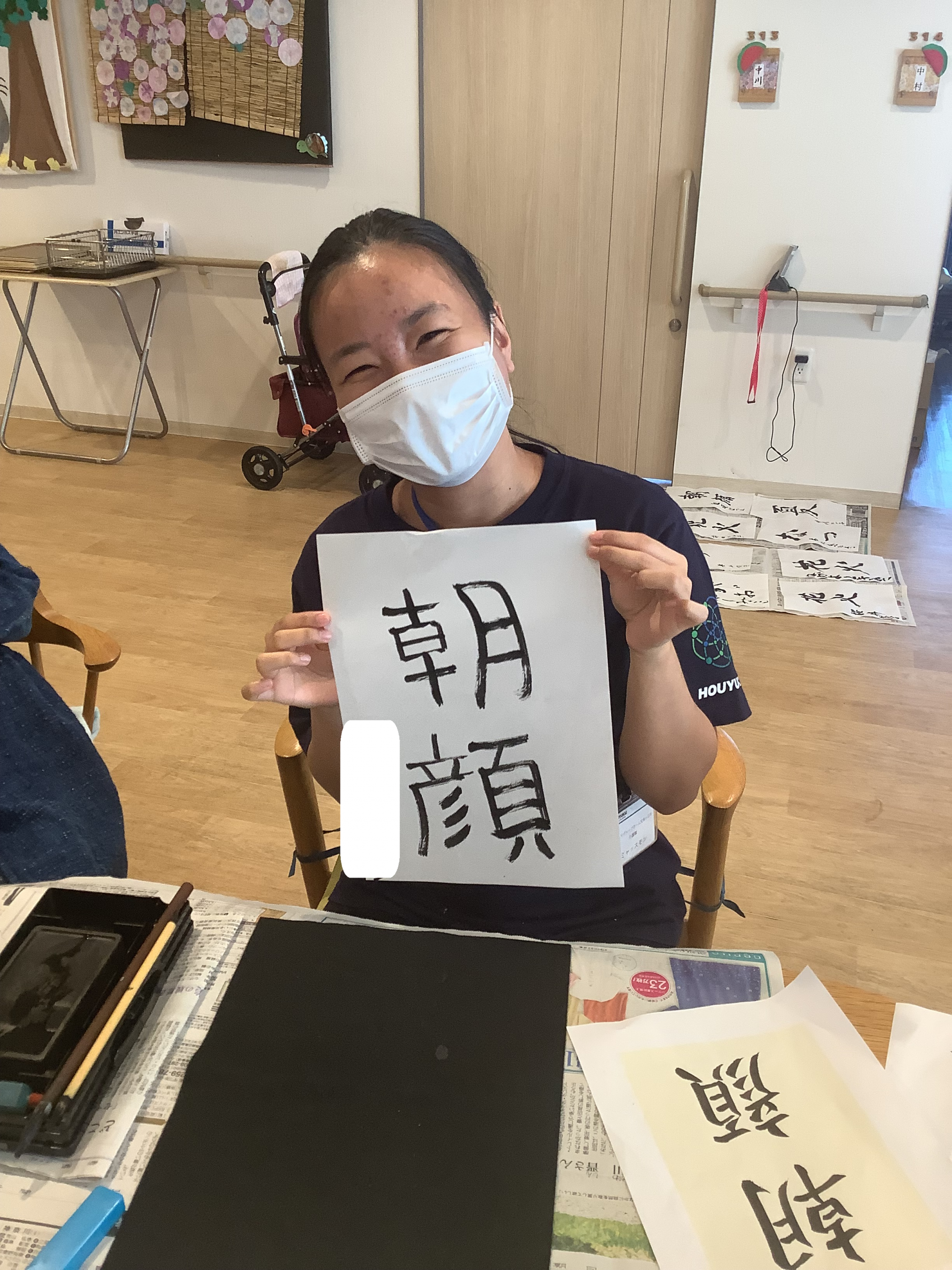 皆様が見守る中「朝顔」の字を選び・・初筆(#^.^#)