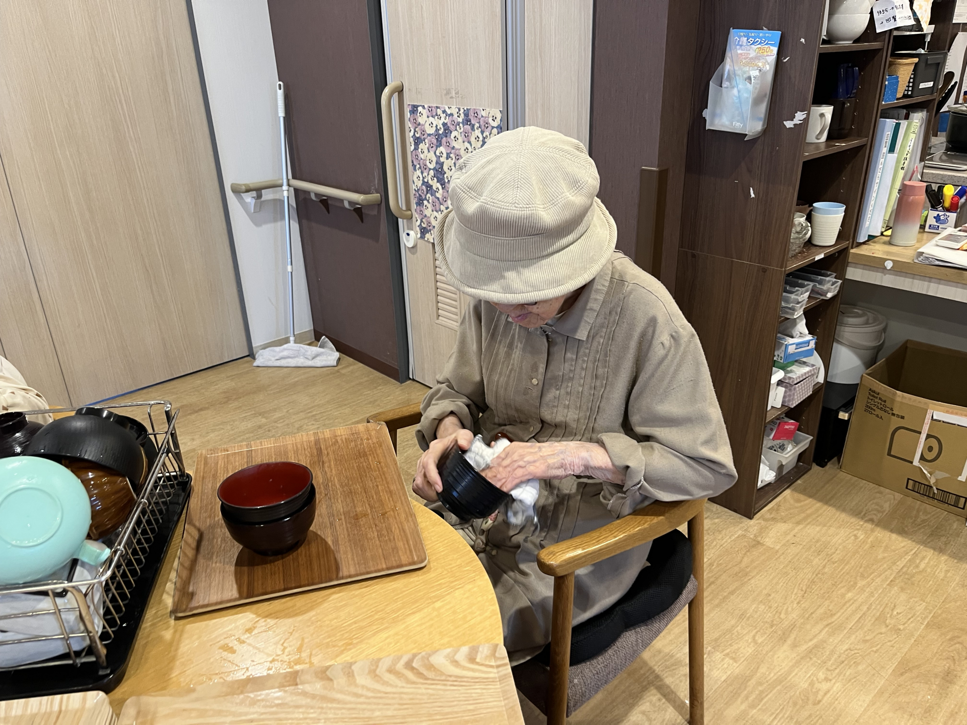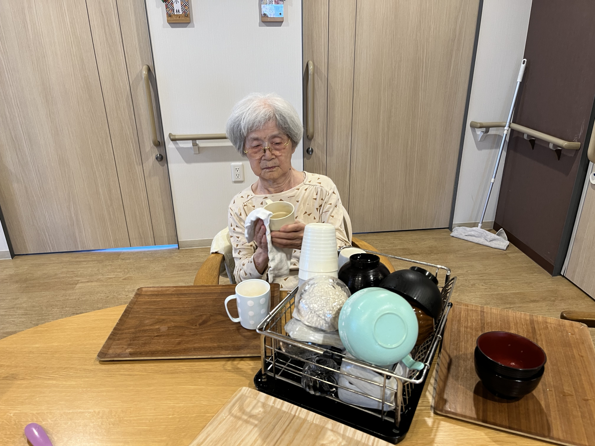 協力して食器を拭いたりトレー拭いたり・・