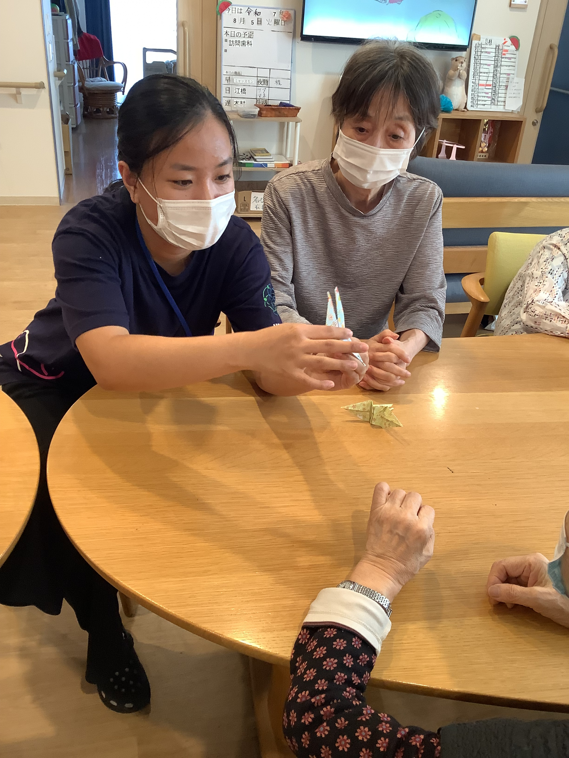 外国の職員さん「難しいそう~」と仰りながら皆様と「鶴」を折ってみました!