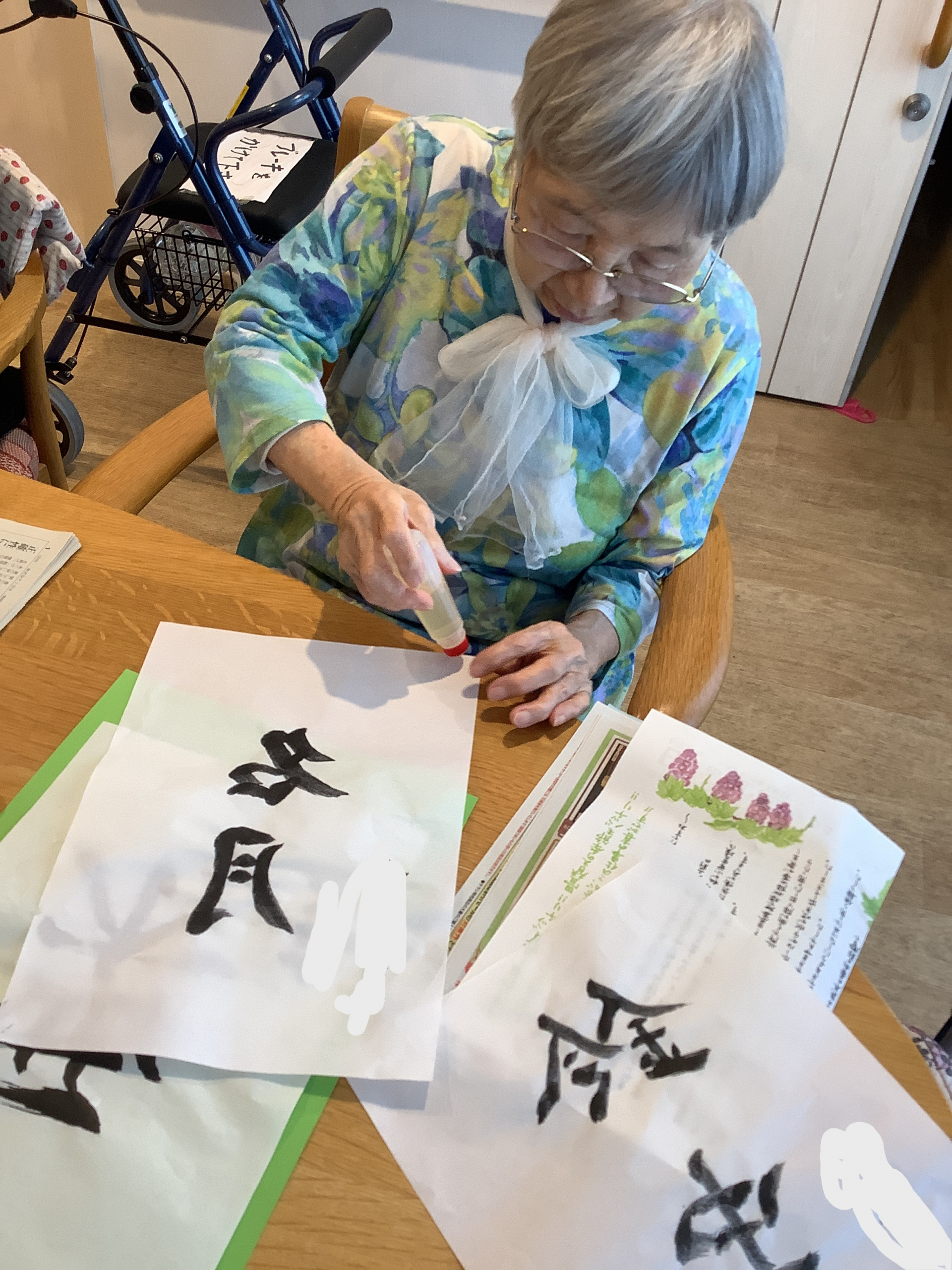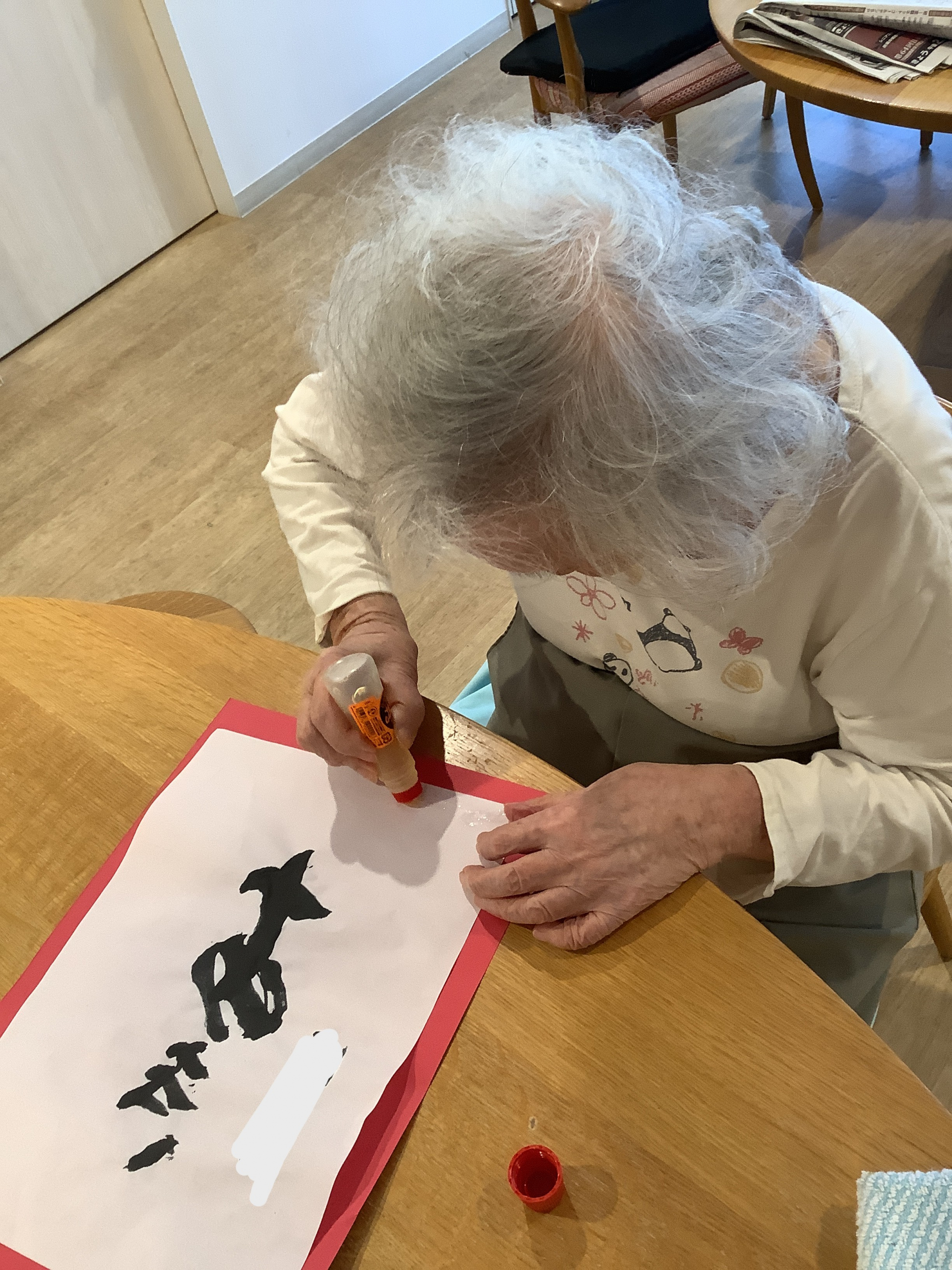 選んだ画用紙に、昨日書いた習字を貼っていきます。