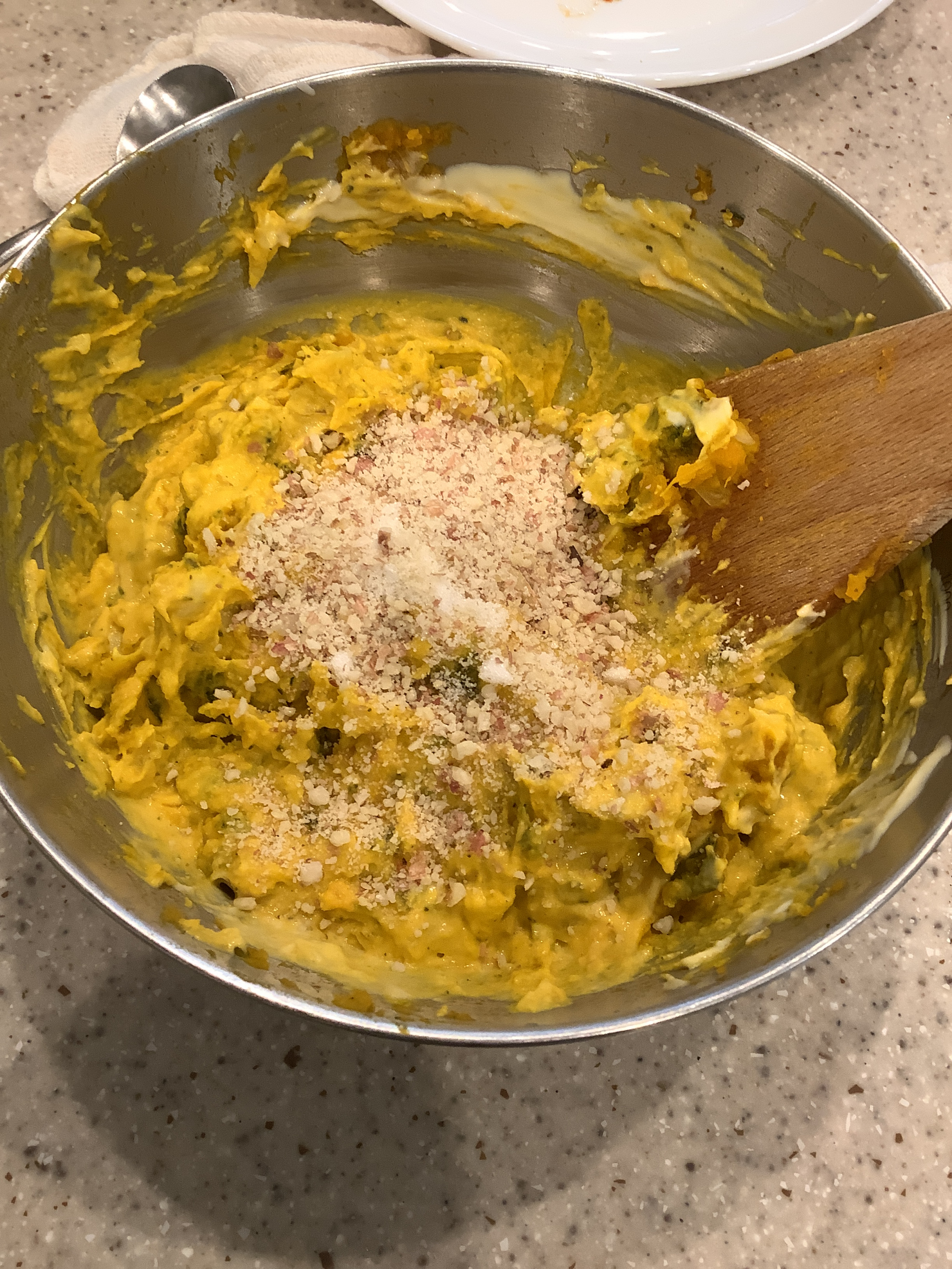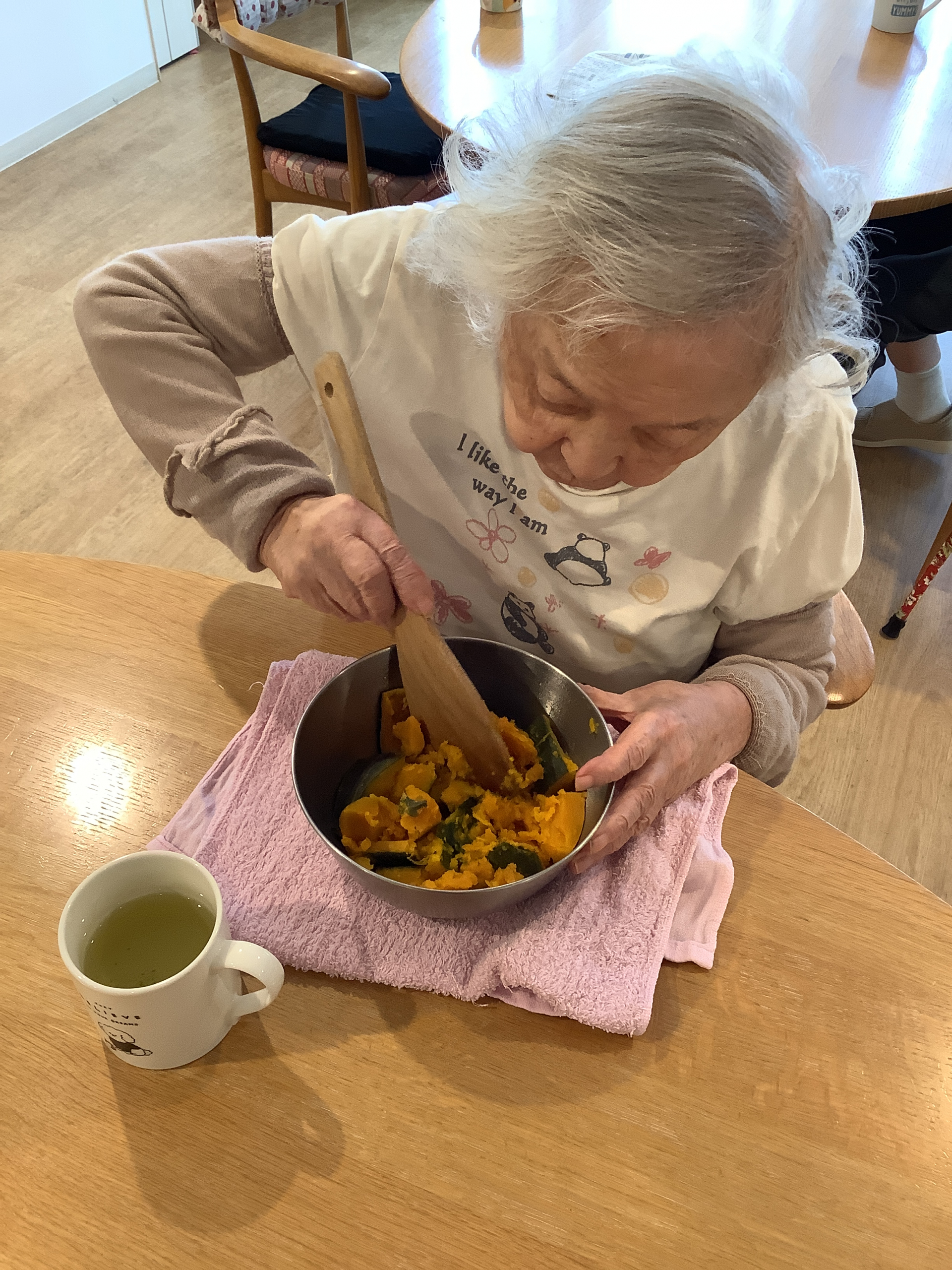 茹でたカボチャを熱々のうちに潰し、粗熱をとります。
