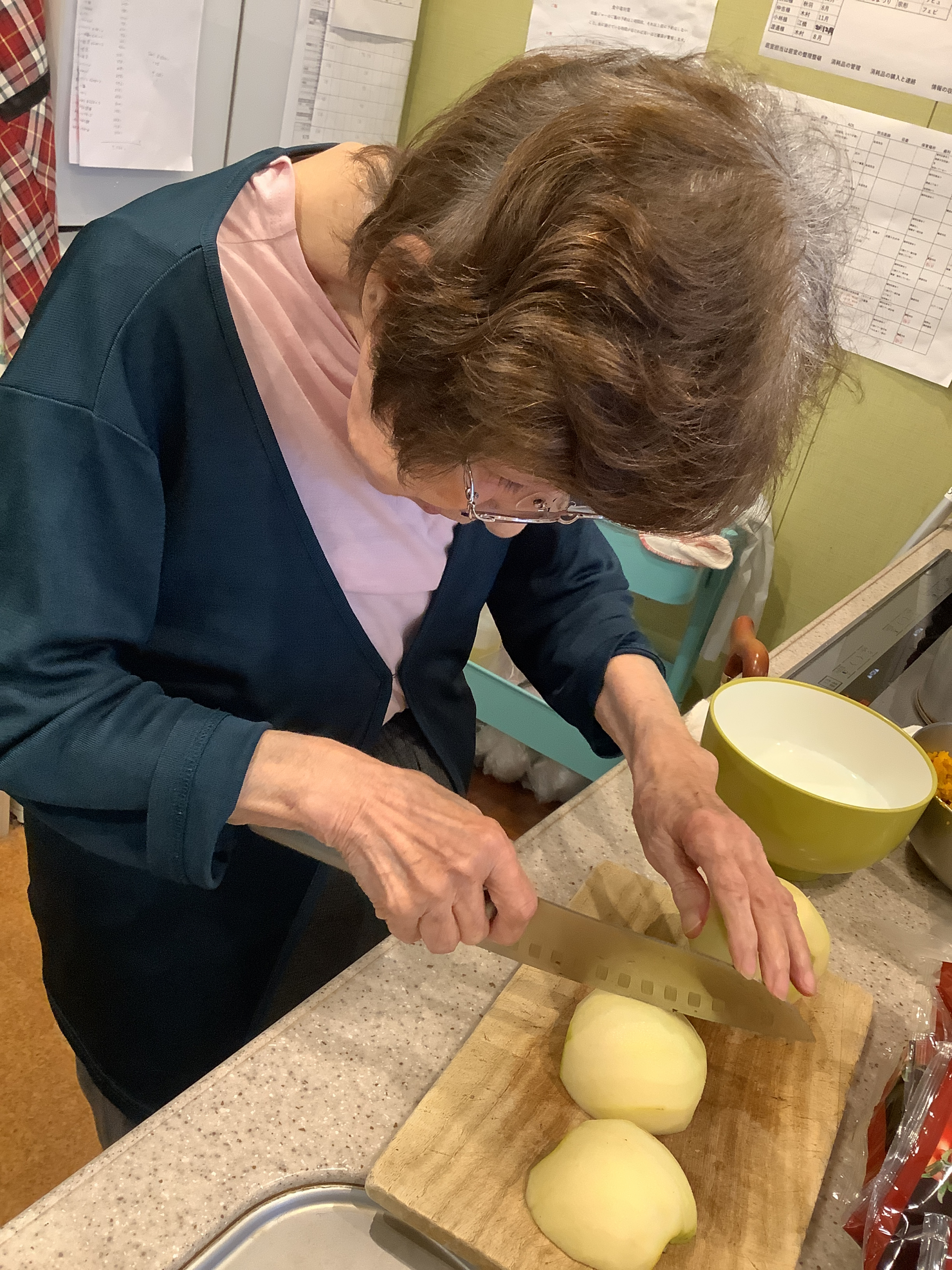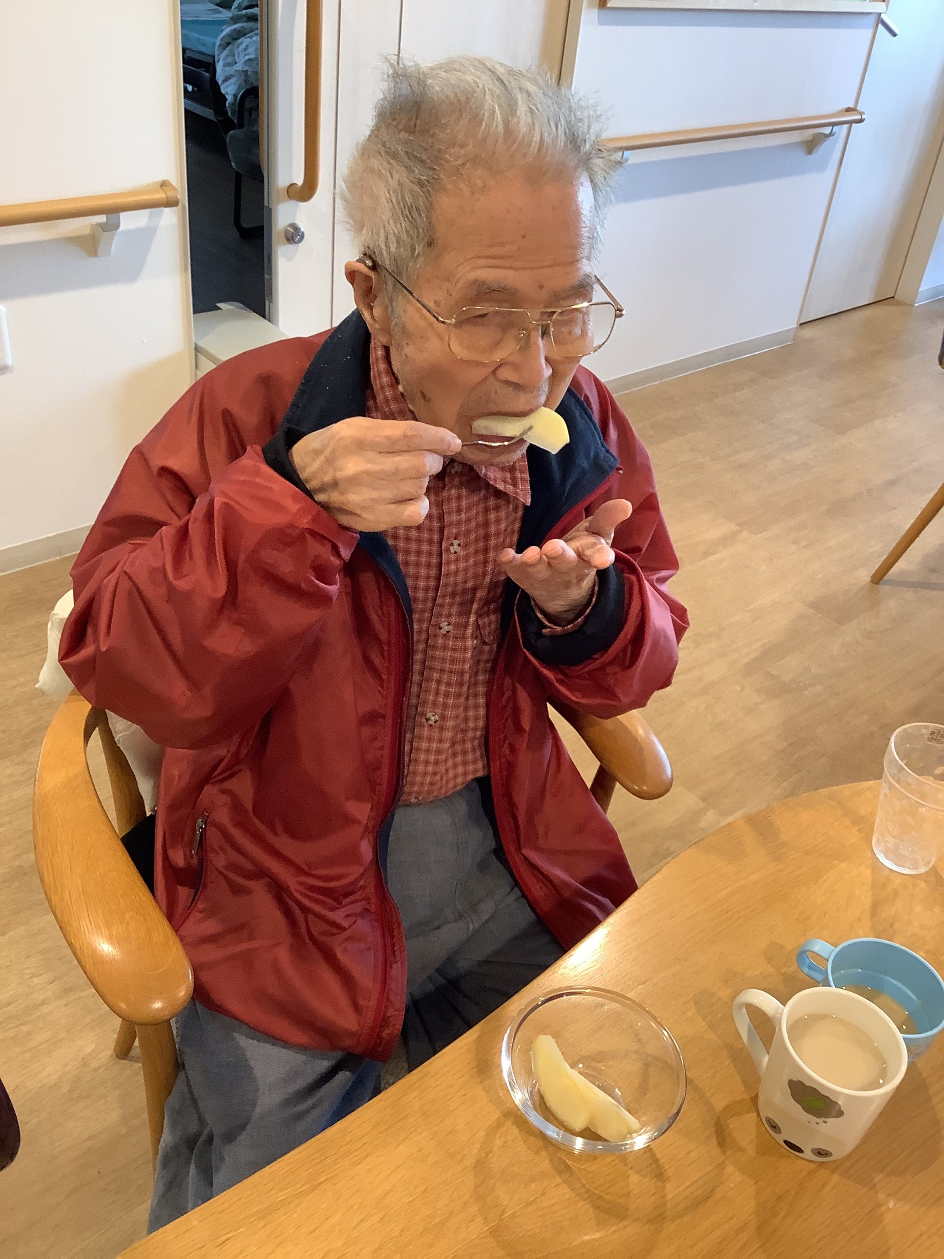 「リンゴなんて久しぶり!これ甘いね~」とお話しされるF様。