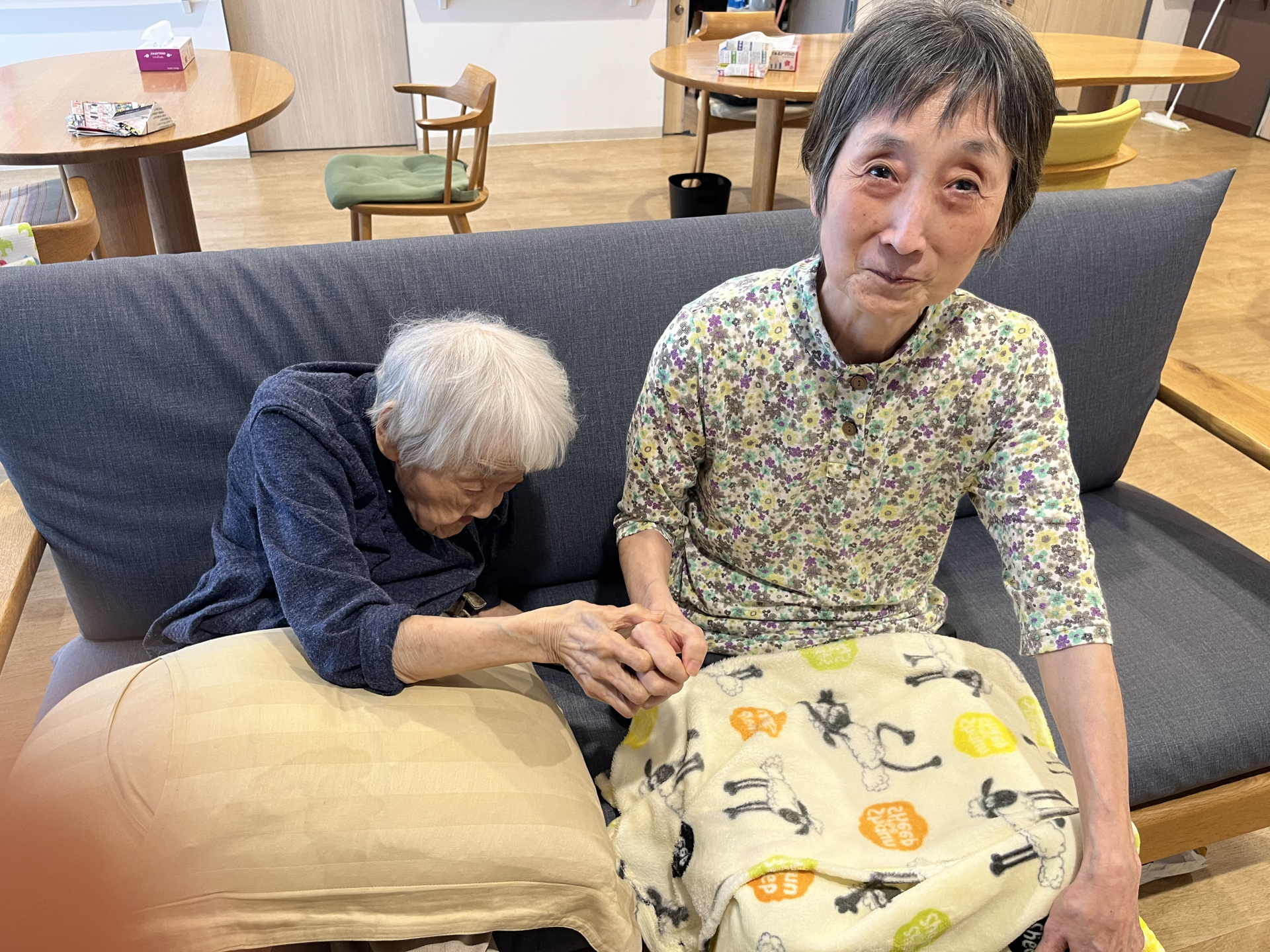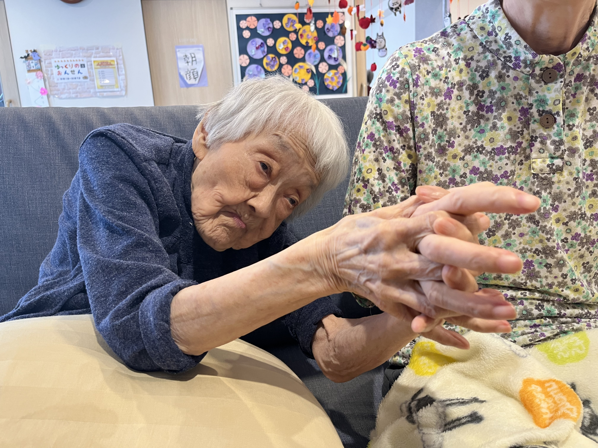 「もみもみマッサージだよ」と」言いながらN様の手をマッサージするM様