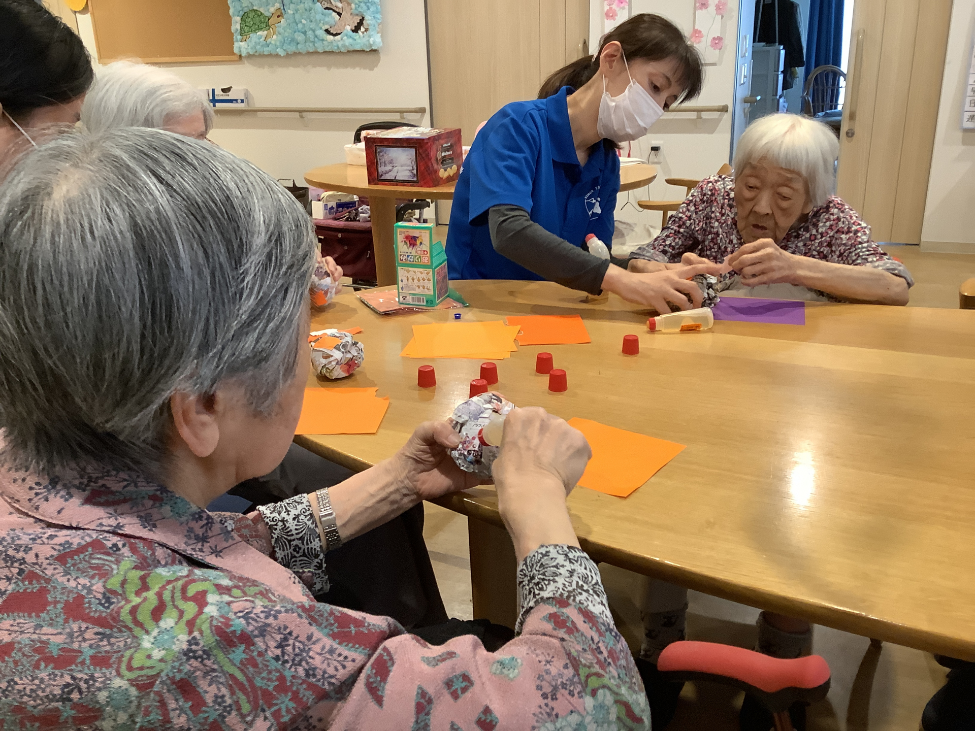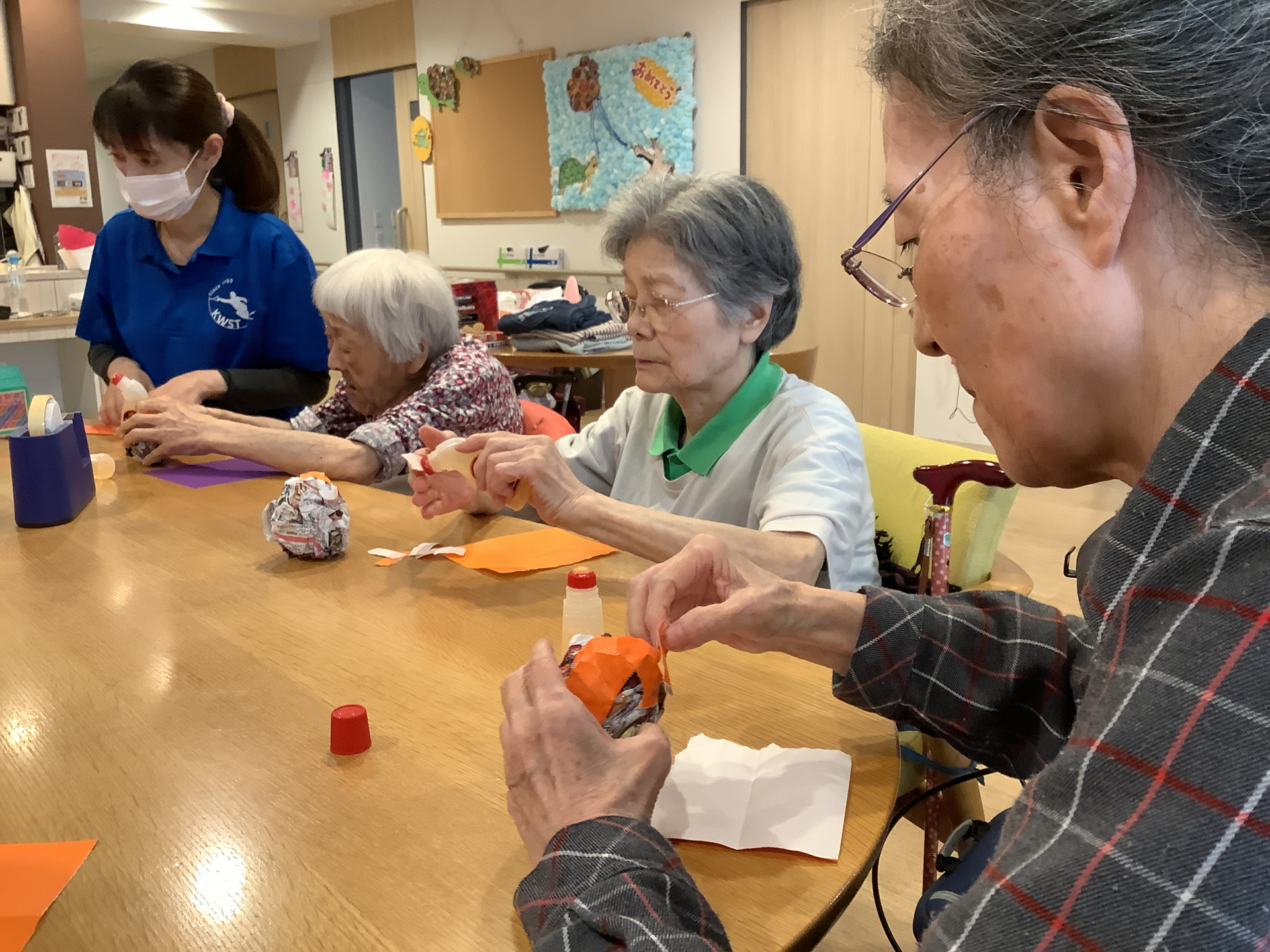 新聞紙を好きな大きさに丸めオレンジの折り紙をちぎり貼っていきます♬