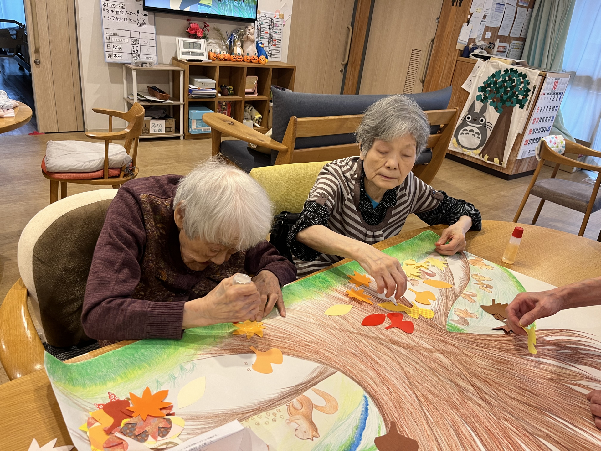大きな木に紅葉やイチョウを貼っていきます・・