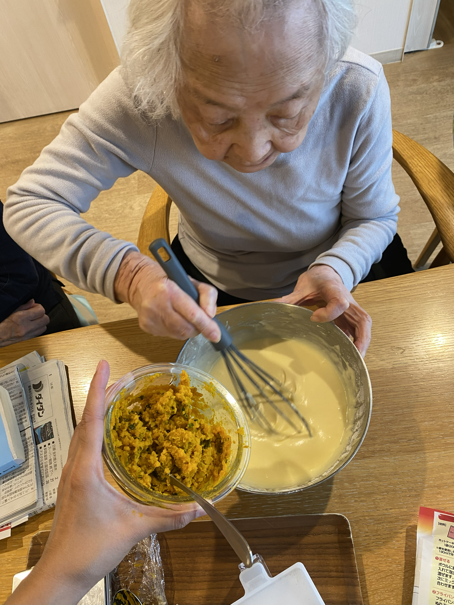 作った焼きたてのカボチャマフィンと他の甘いものを一緒に召し上がり,笑い声たくさん聞こえて楽し時間になりました