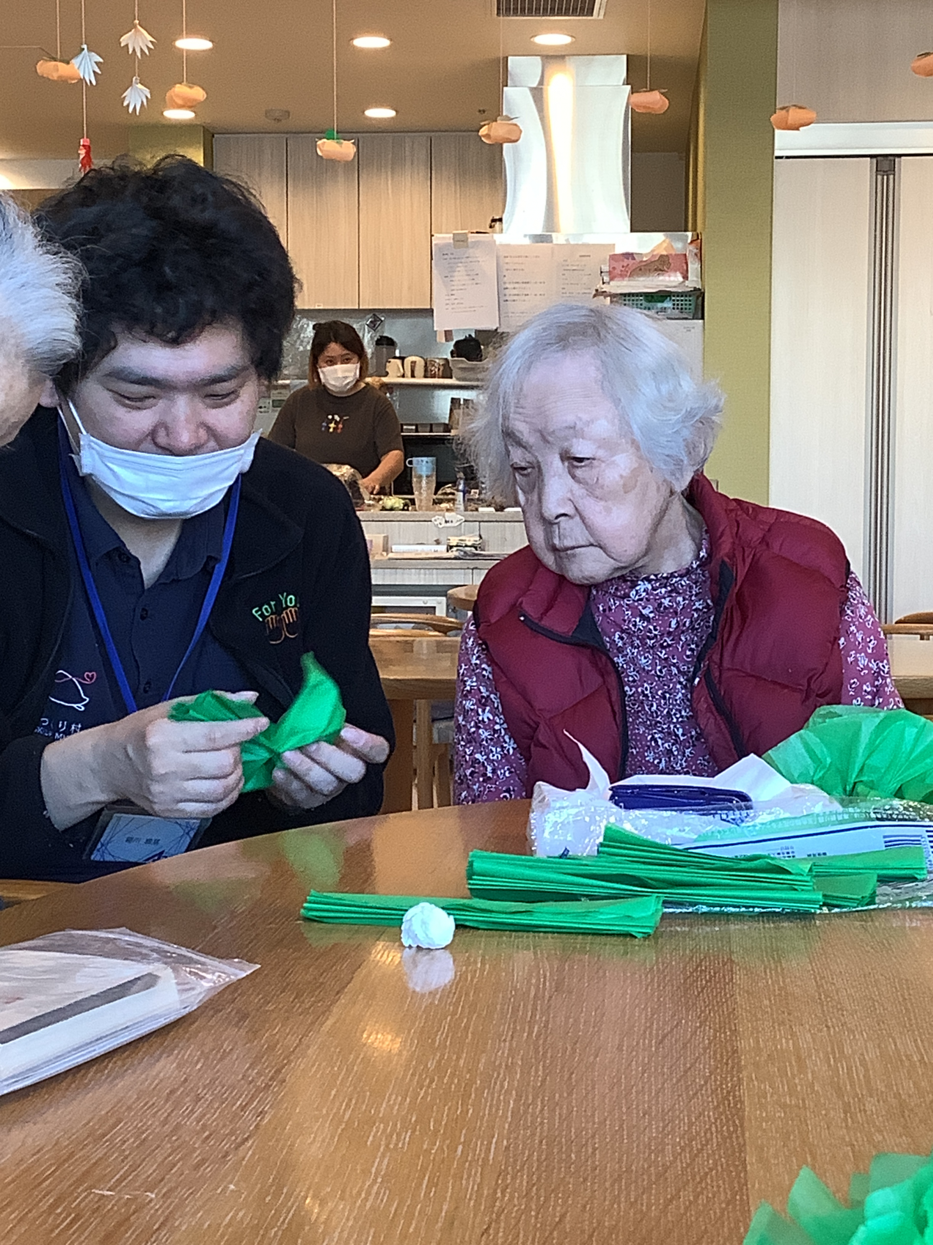 2025.11.28 活動報告 グループホームEASTフロア 壁面作り途中 Tweet シェアする 今日はグループホームの壁に貼る壁面作りの途中経過の様子です クリスマスツリーの枝の部分になる部分をペーパーフラワーで作成中です 小日向GH 稲川 前の記事 2025.11.28 活動報告 ☆WAST☆ いざ勝負です! 次の記事 2025.11.27 活動報告 ☆WAST☆ 季節を楽しむ会【クリスマスカード編④】 一覧へ戻る