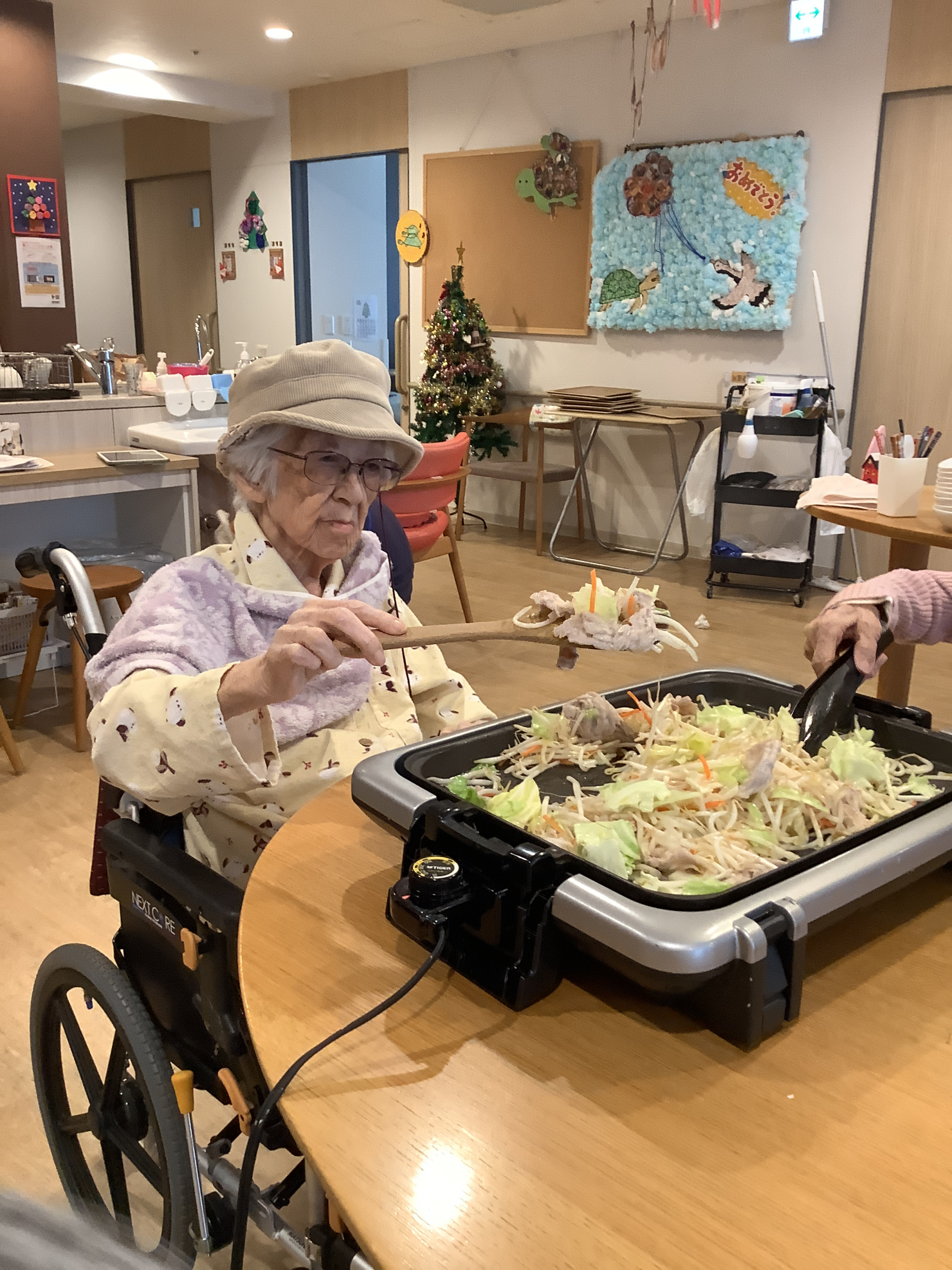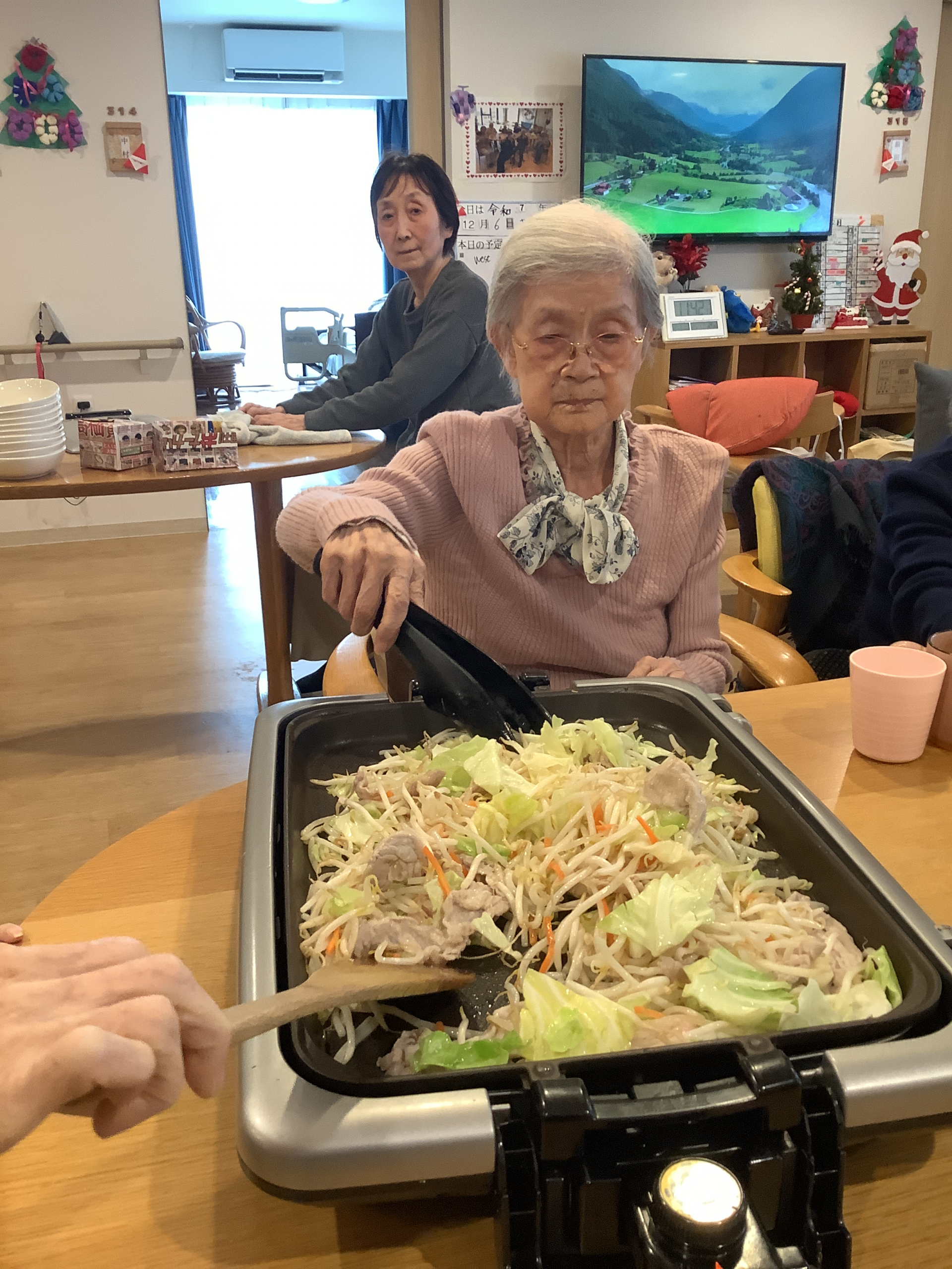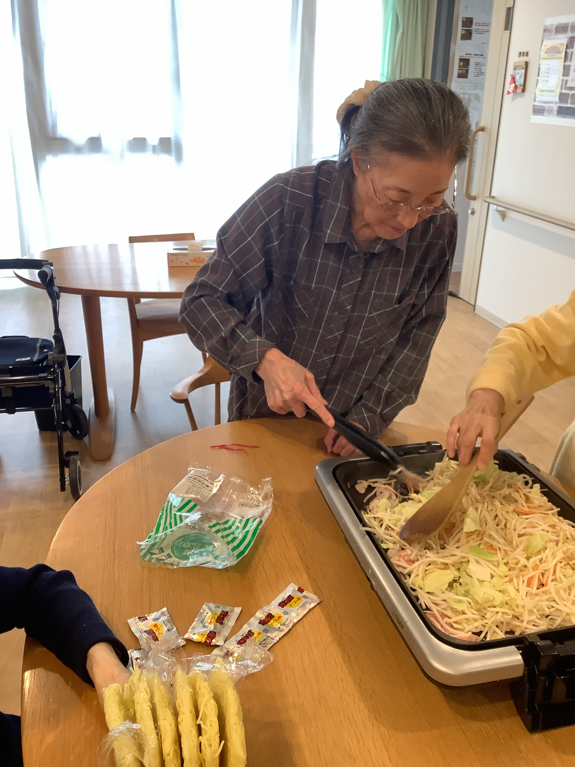 みんなで協力してお肉や野菜を炒めていきます。。
