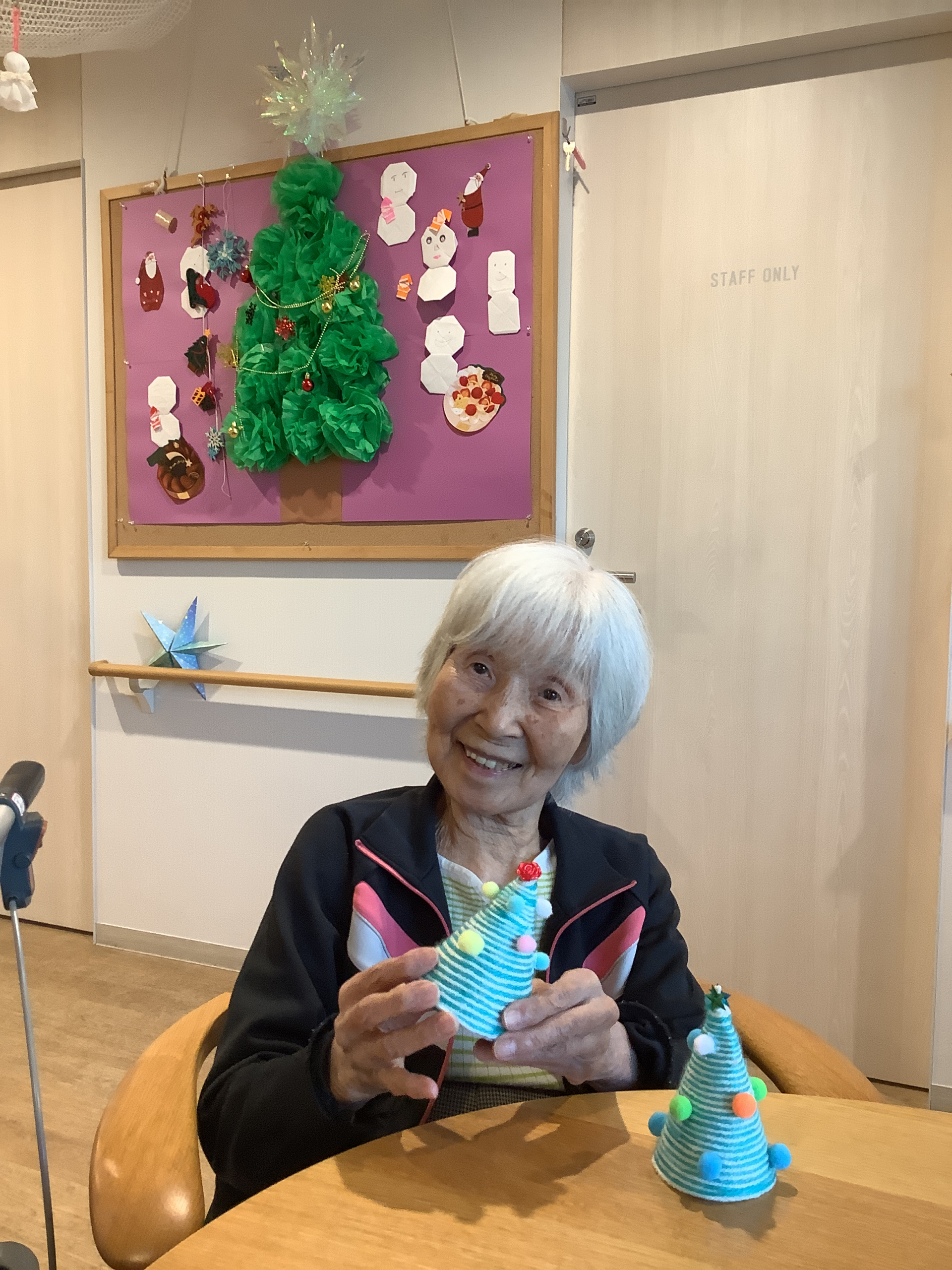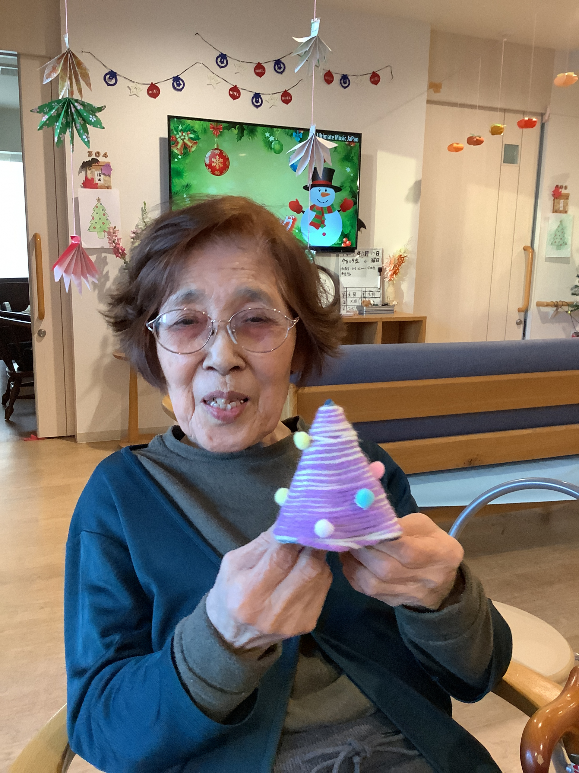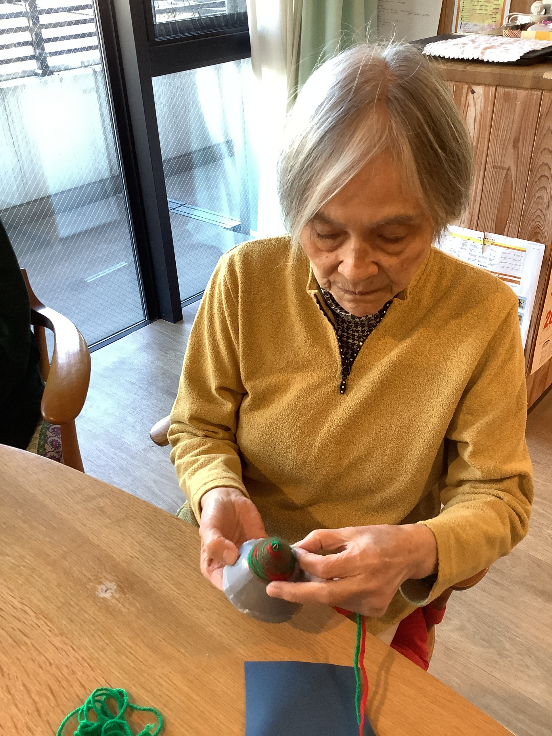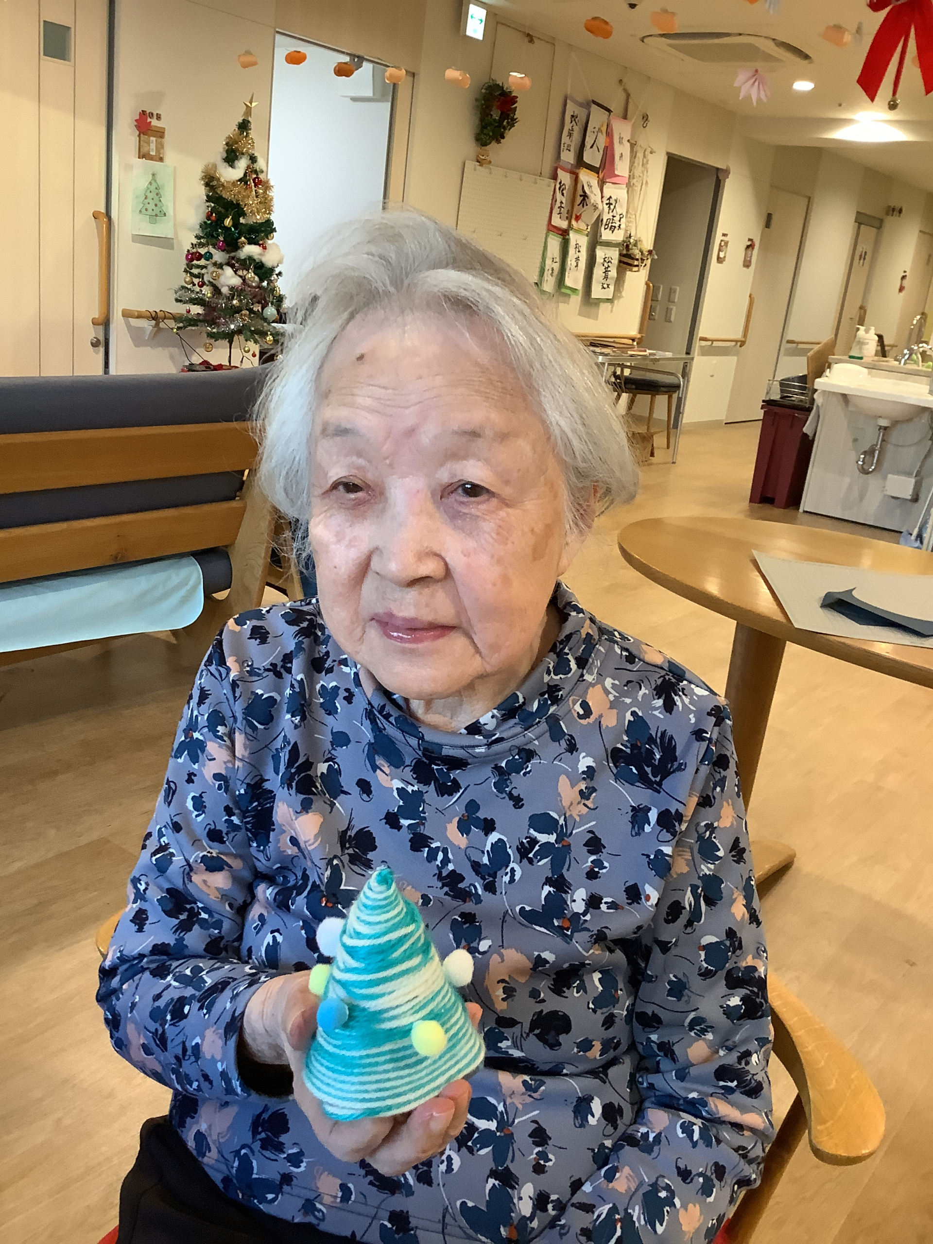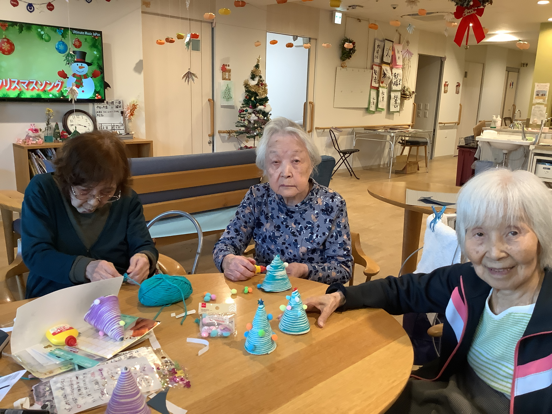 本日のレクリエーションは,毛糸を使ってミニクリスマスツリーを作りました!