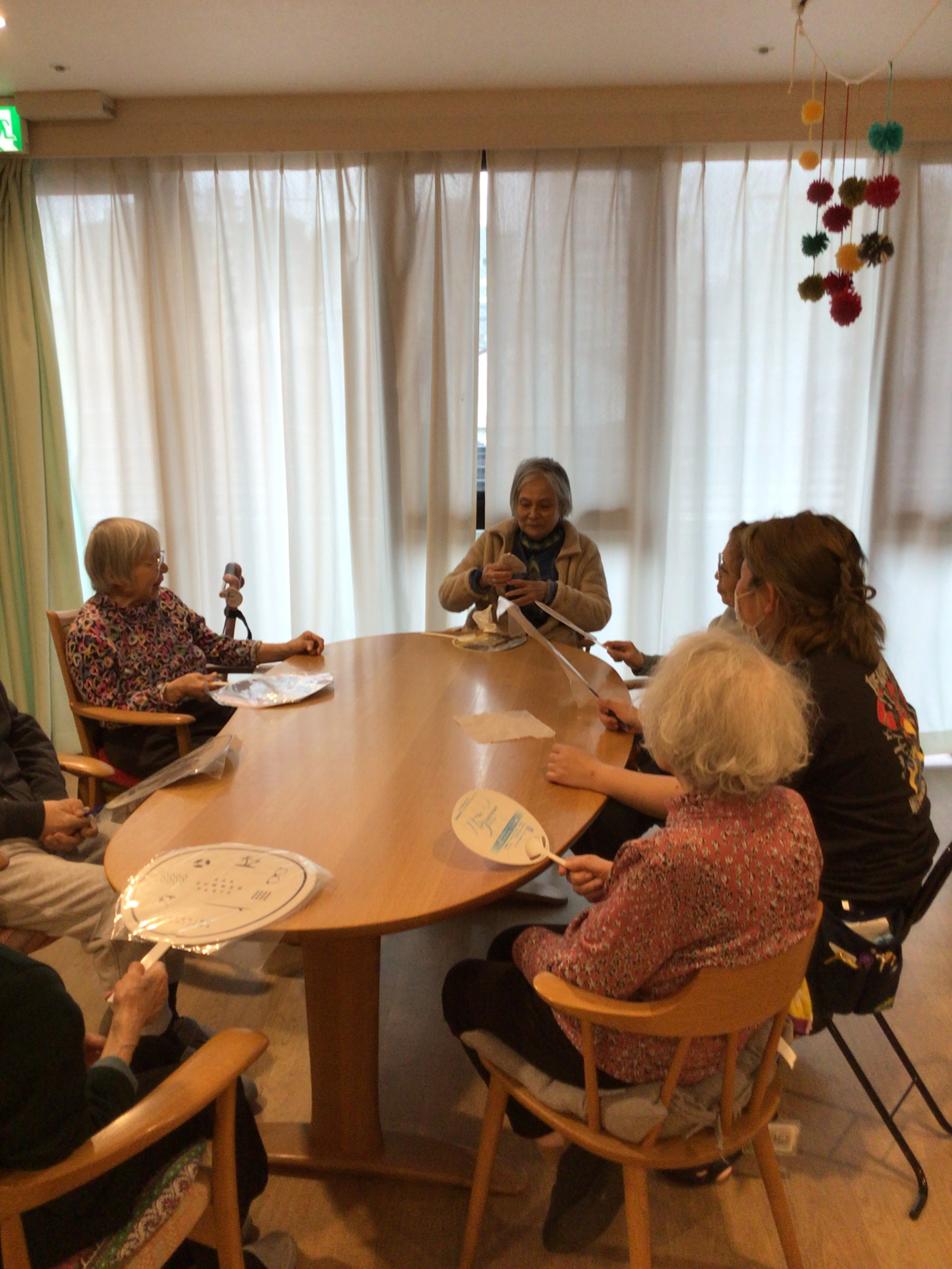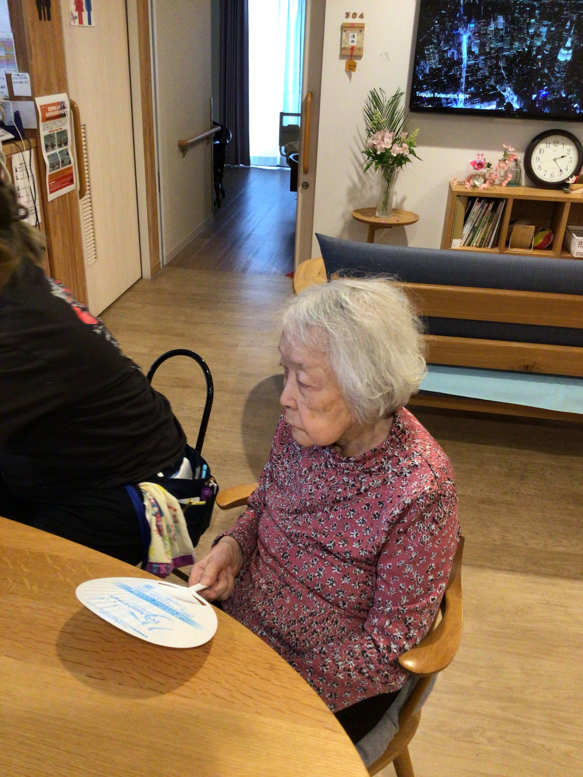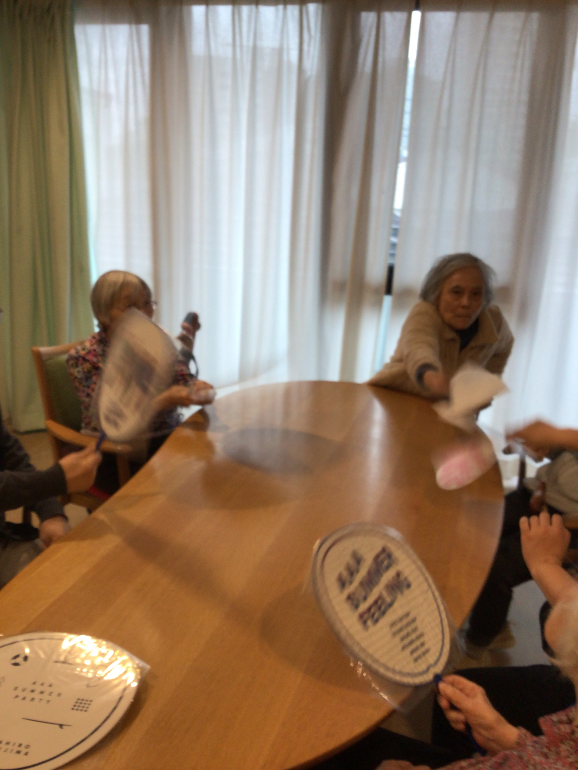 本日のレクリエーションは,『うちわを使って何秒ティッシュを浮かせられるか‼️』です。(レク名募集中)