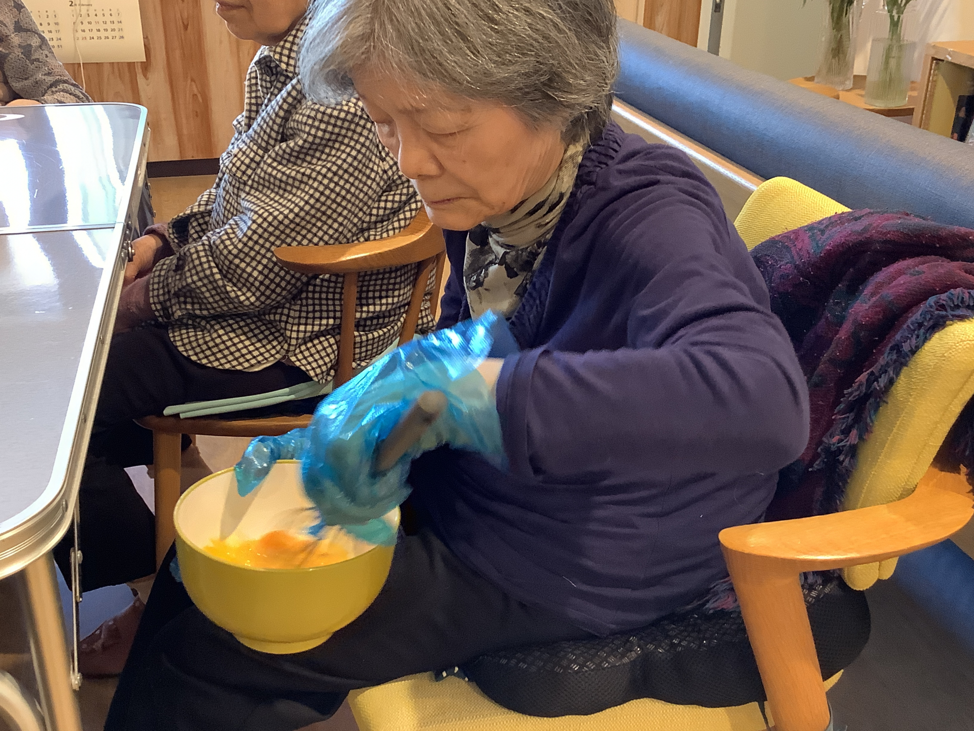 まずは卵を割ってかき混ぜてもらっています