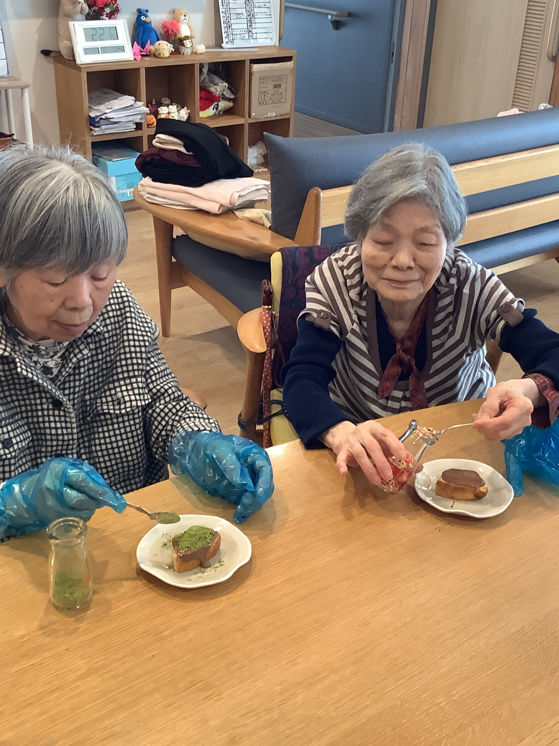 バームクーヘンやプチケーキにチョコや抹茶など好きな物をトッピングしていきます