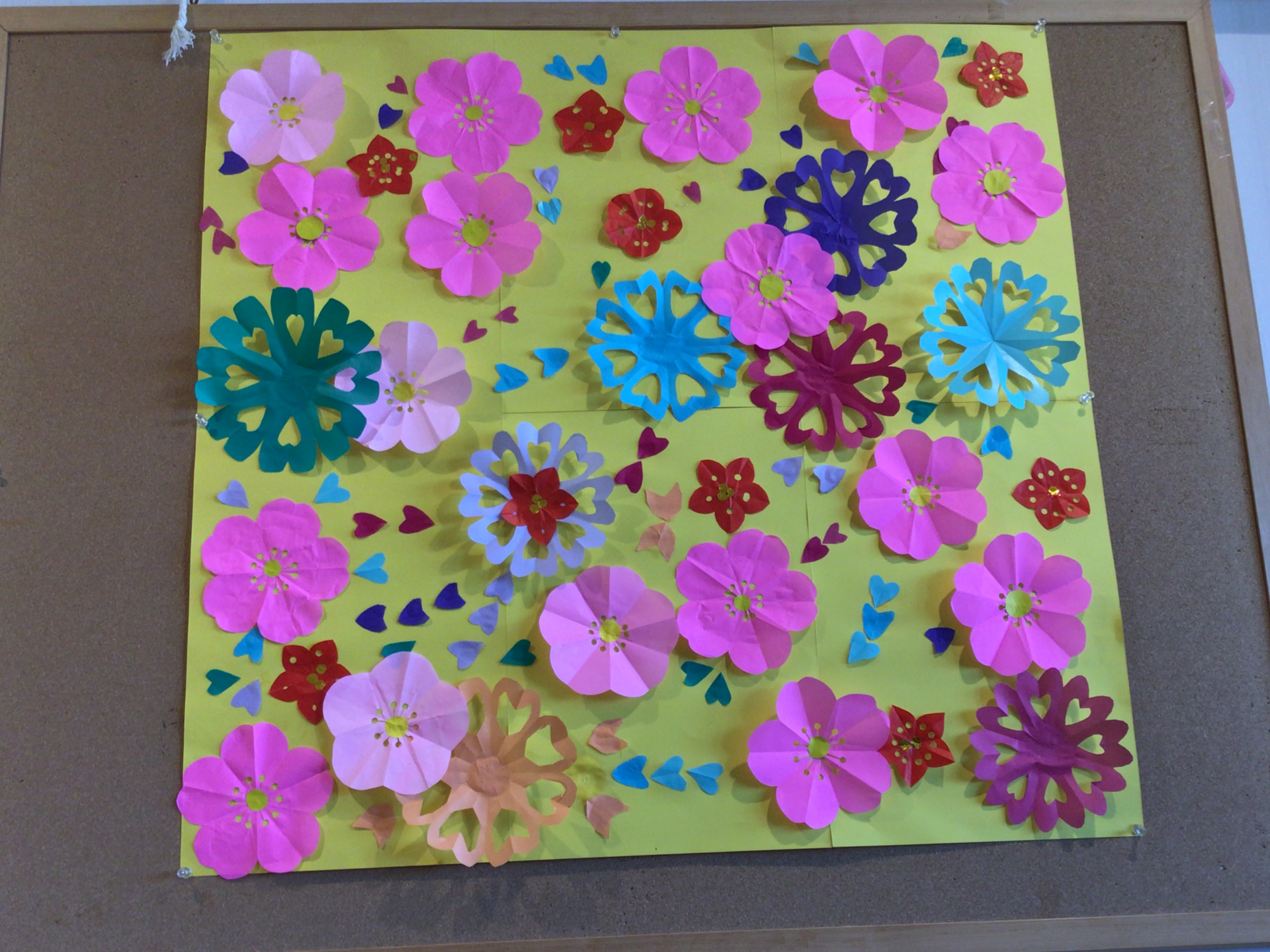 みんなで切り貼りした色とりどりのお花!
