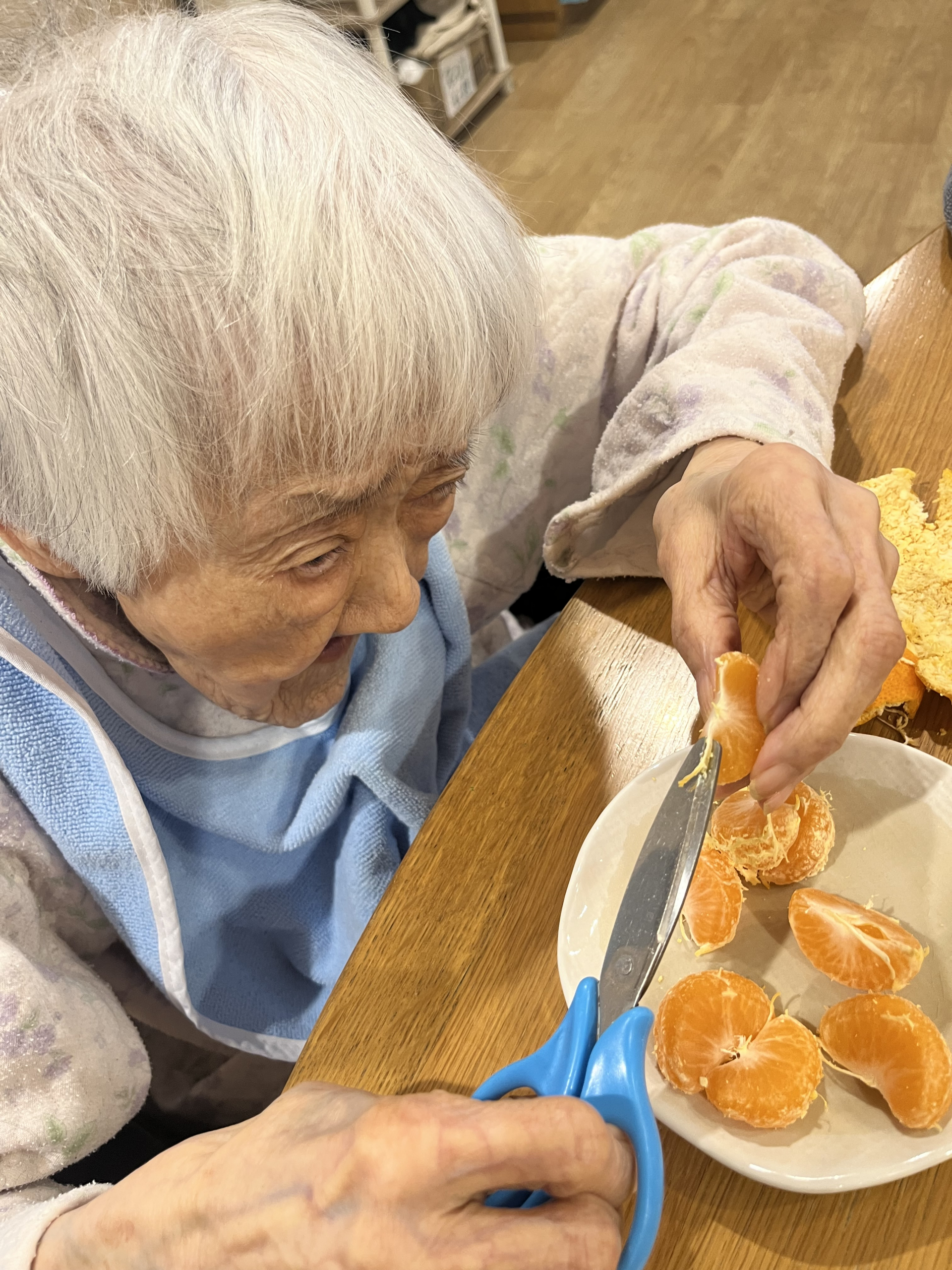 ハサミを使い食べやすいように工夫して食べてました♬