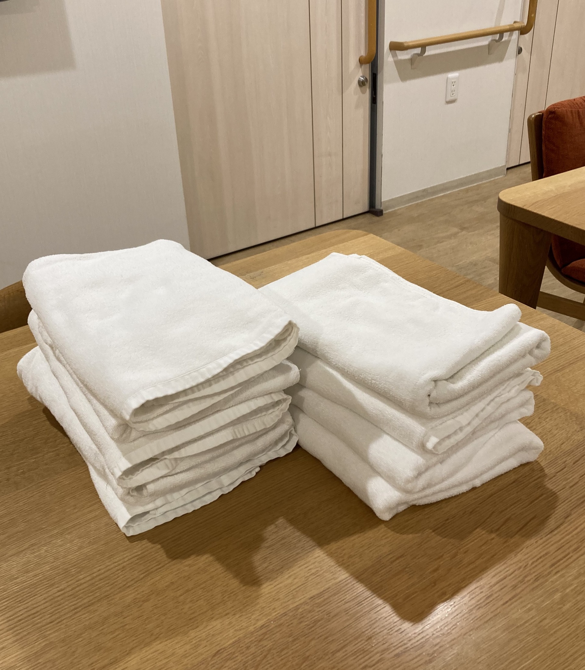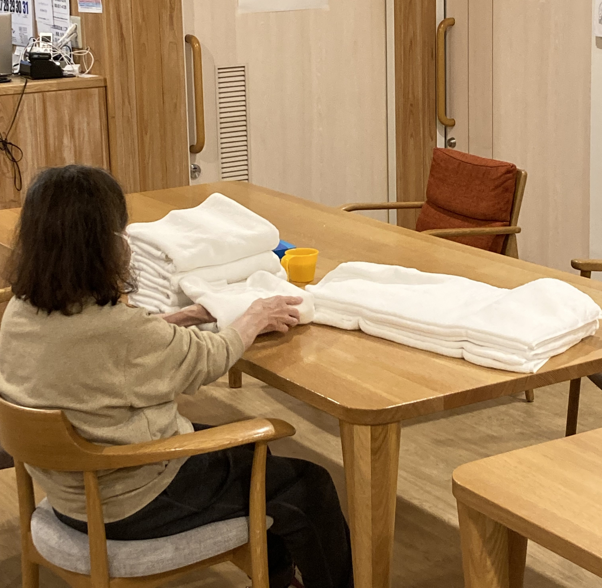 写真のA様、9時前に来所されお茶を飲んだ後タオル折りのお手伝いをしてくれました。