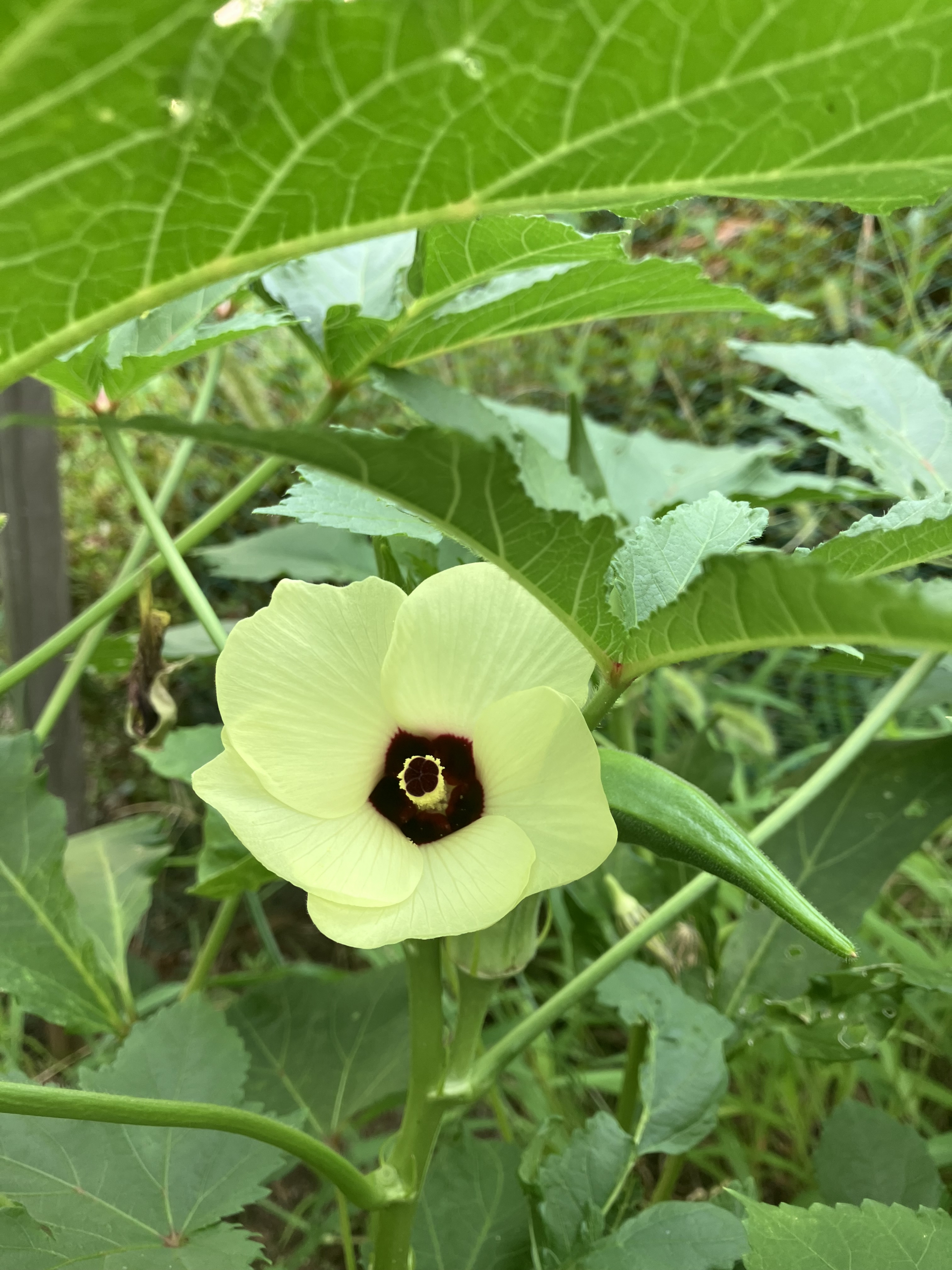 ・・・さて2日ぶりに出勤するとオクラの大輪の花が咲いていました。。