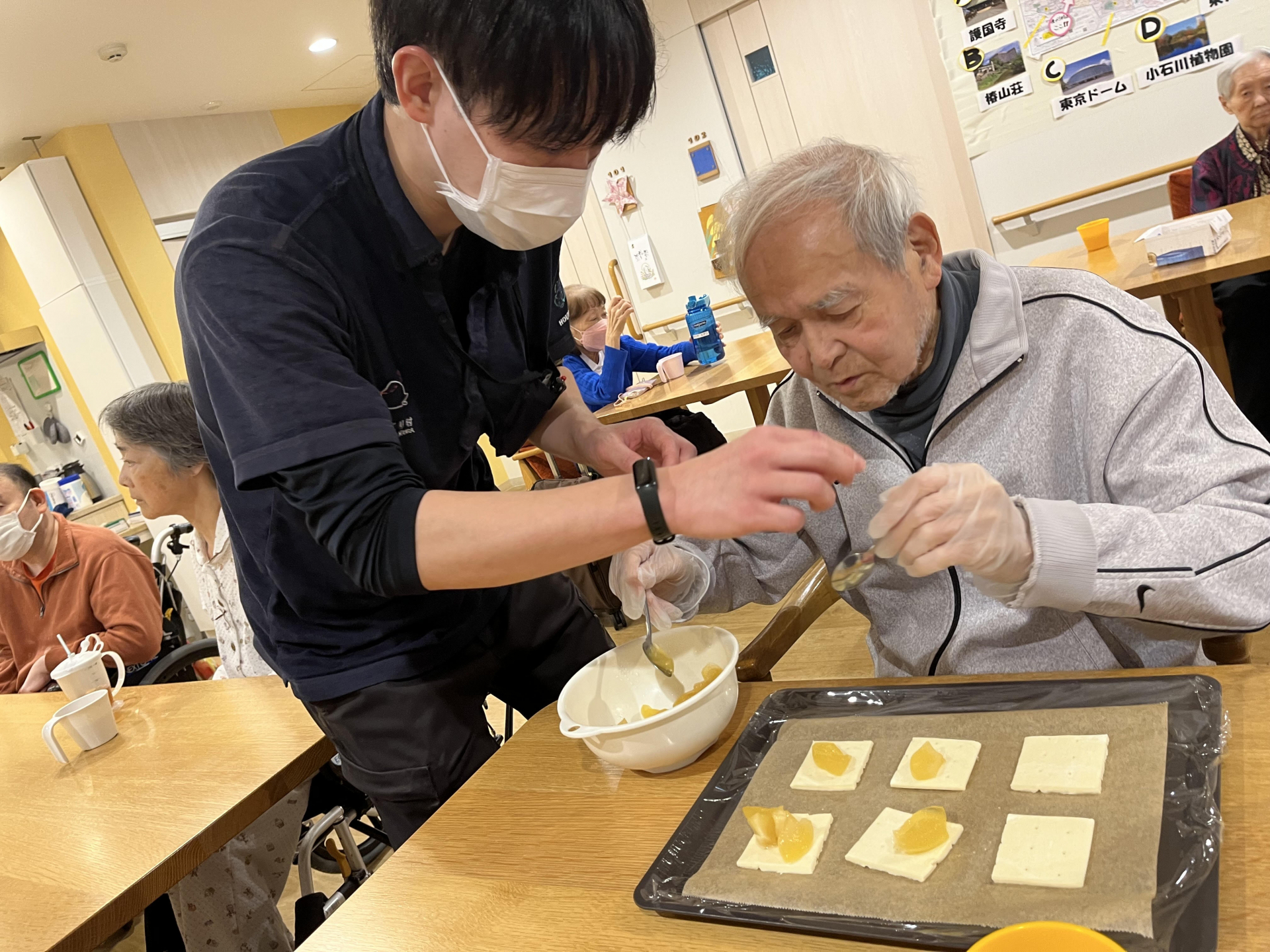 職員と一緒に、集中してリンゴを均等にそして丁寧に並べます。