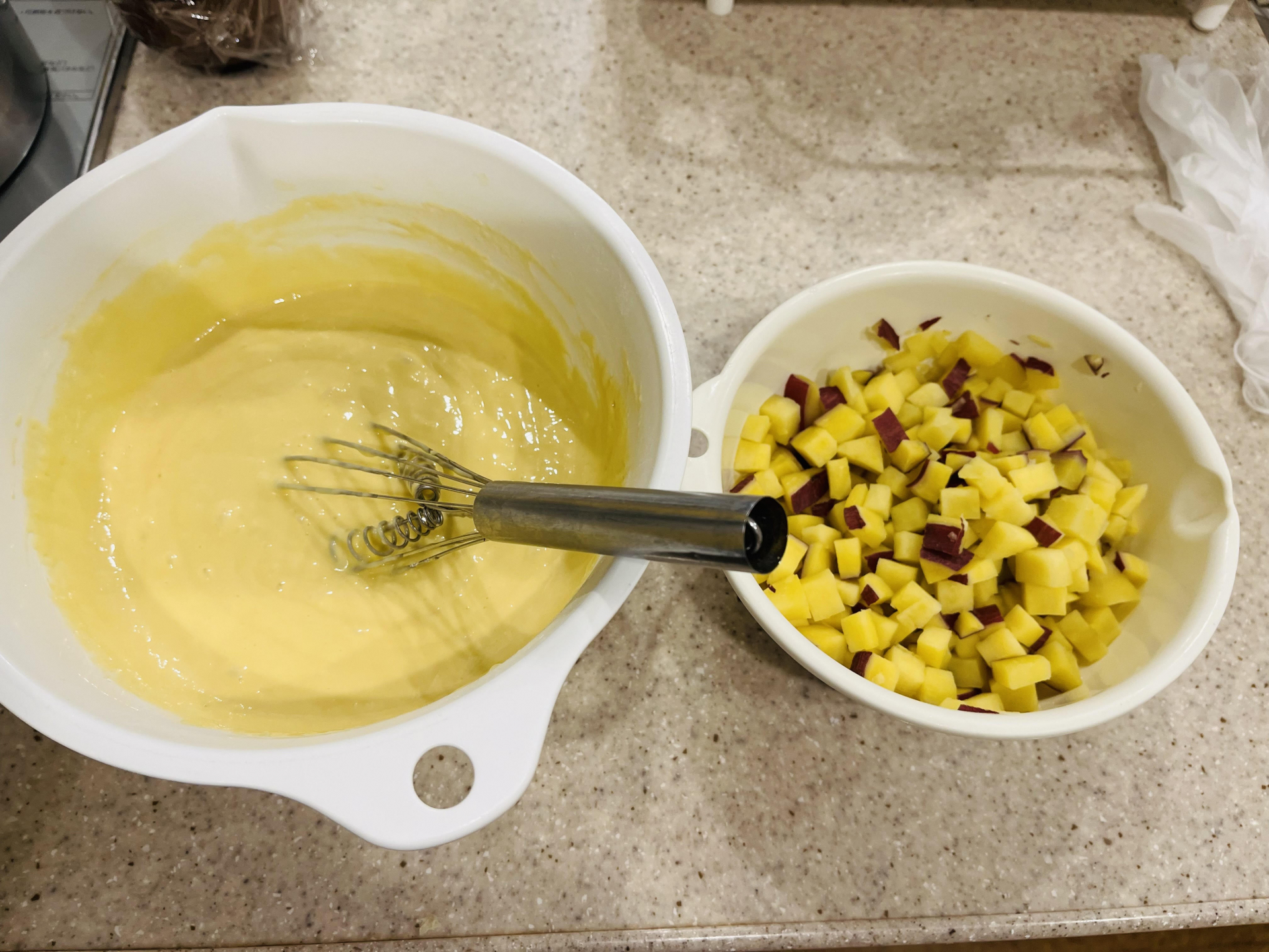 角切りにし水にさらしたさつまいもを電子レンジで温めてから先ほどの生地とミックス!!