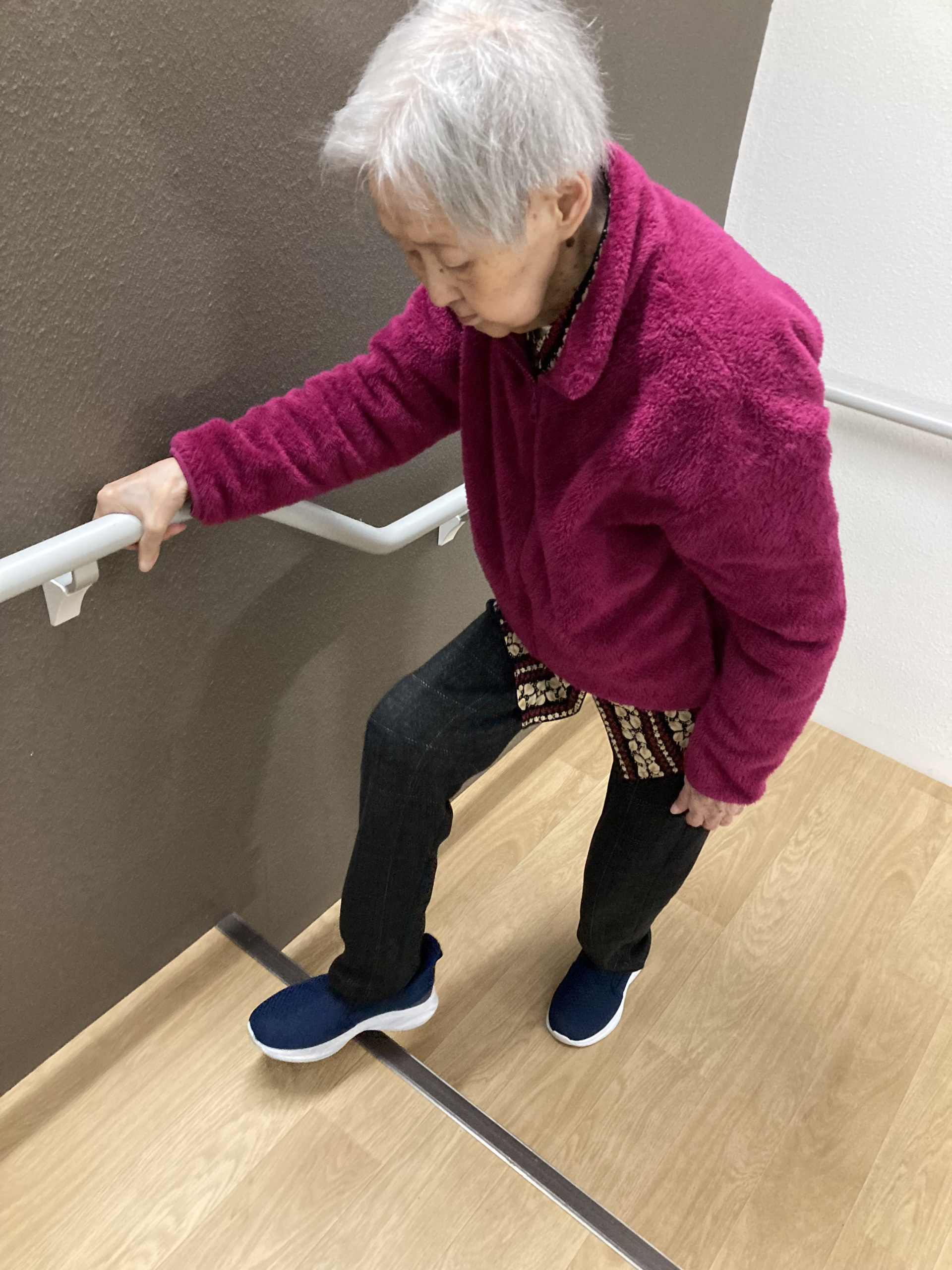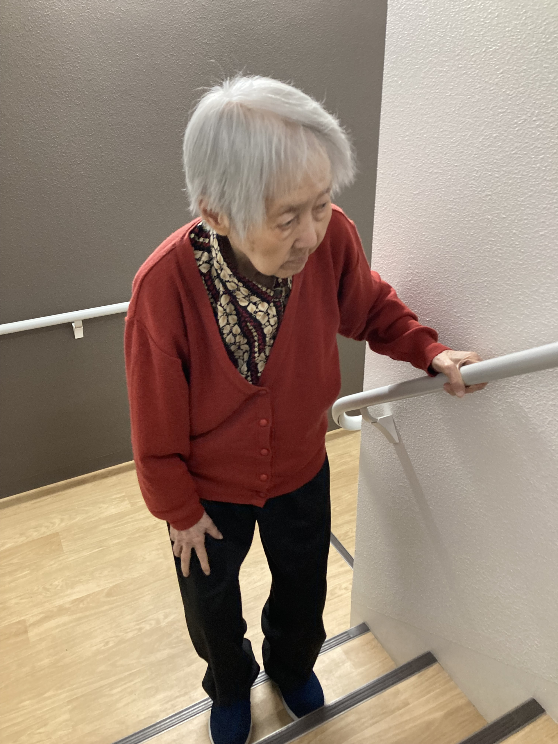 いつもの歩行練習の後に階段上りです。