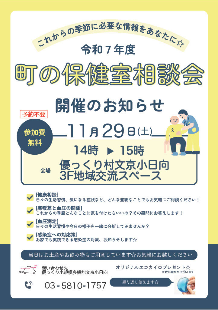 2025.11.10 ニュース 「町の保健室相談会」を開催いたします Tweet シェアする 看護師による「町の保健室相談会」を開催いたします。 健康や感染症対策などについて、気になることがあればお気軽にご相談ください。 ご自宅でできる対策もお伝えします! 【日時】 2025年11月29日(土)14:00〜15:00(入退場自由) 【会場】 優っくり村文京小日向 3階地域交流スペース 当日はお茶とお菓子とちょっとしたお土産を準備してお待ちしております。 予約不要ですので、お気軽にお越しください! 一覧へ戻る