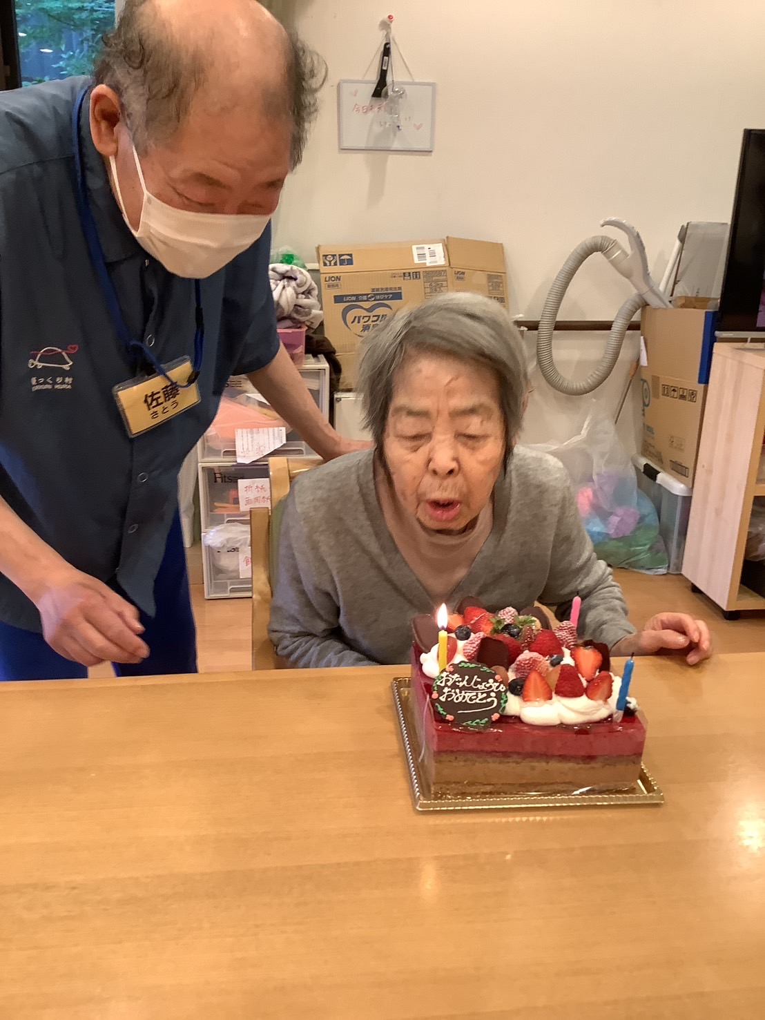 ふーっ!と息を吹きかけてろうそくの火を消しまして、ケーキを切り分けみんなでケーキを食べました~
