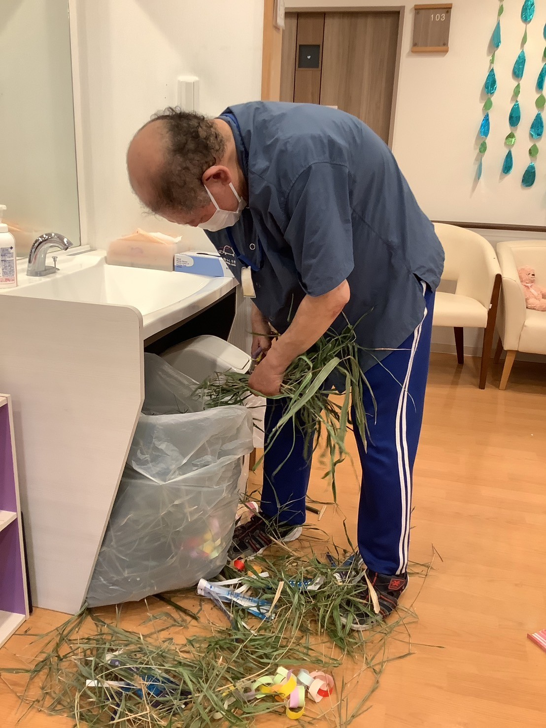 七夕の笹を毎年持ってきてくださる職員さん。七夕が過ぎたこの日は、大きな笹のお片付け中でした(''◇'')ゞ