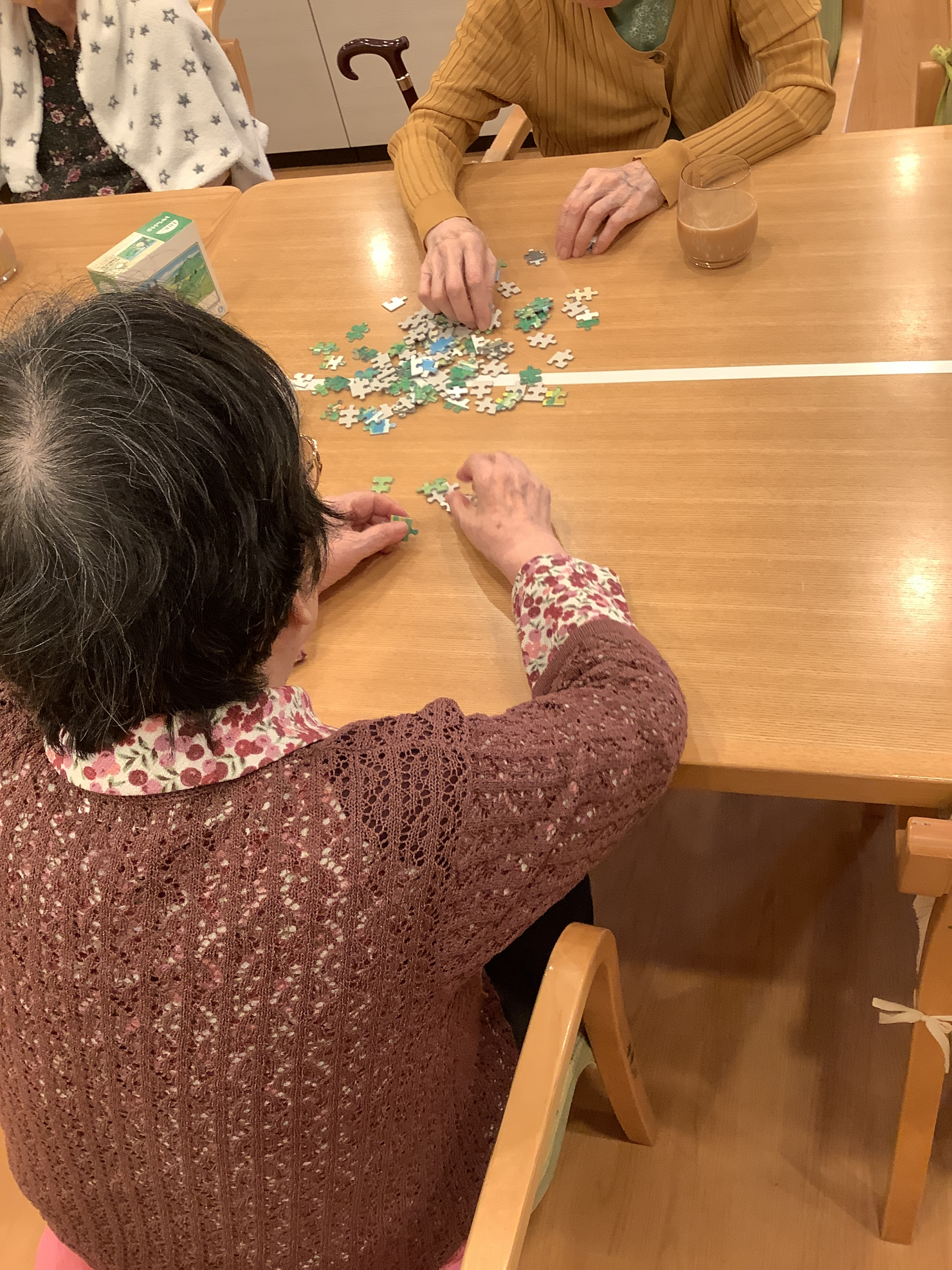 この日はお2人でパズルに取り組んでいらしたご入居者様。ピースが結構小さめのものだったので、かなり苦戦しておられました(>_<)
