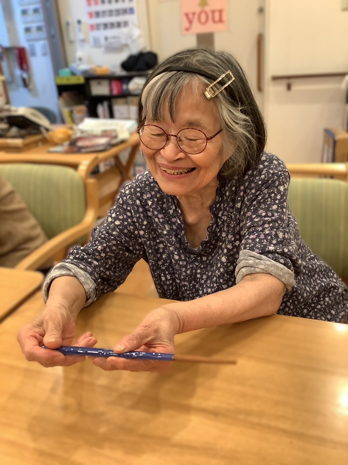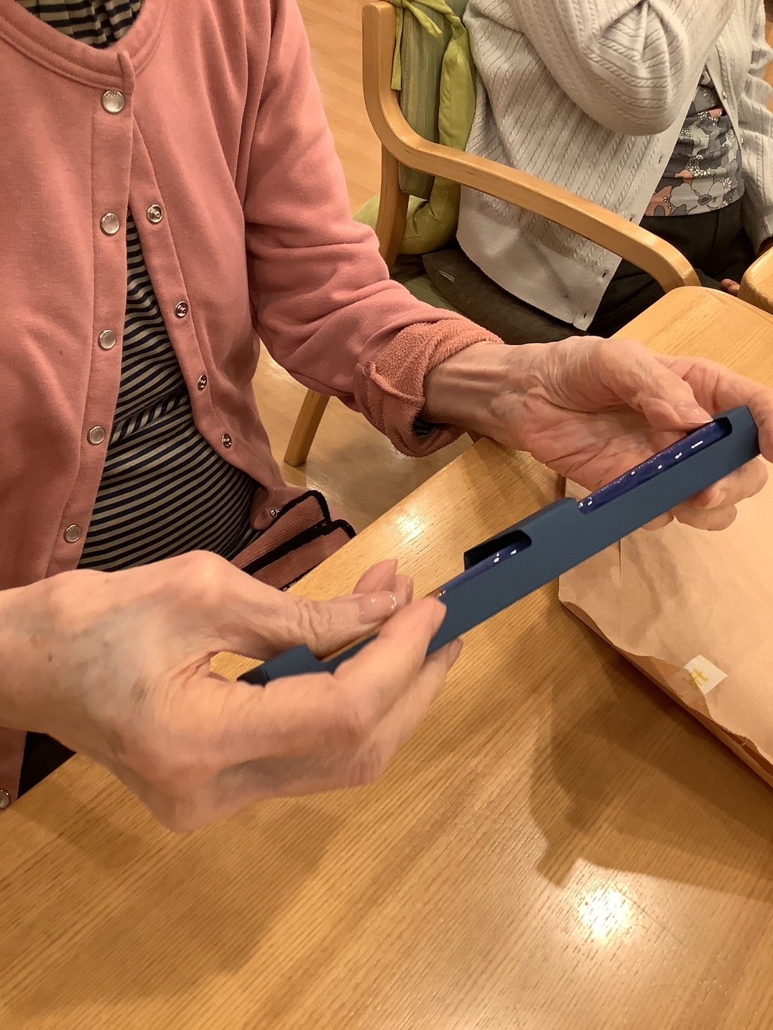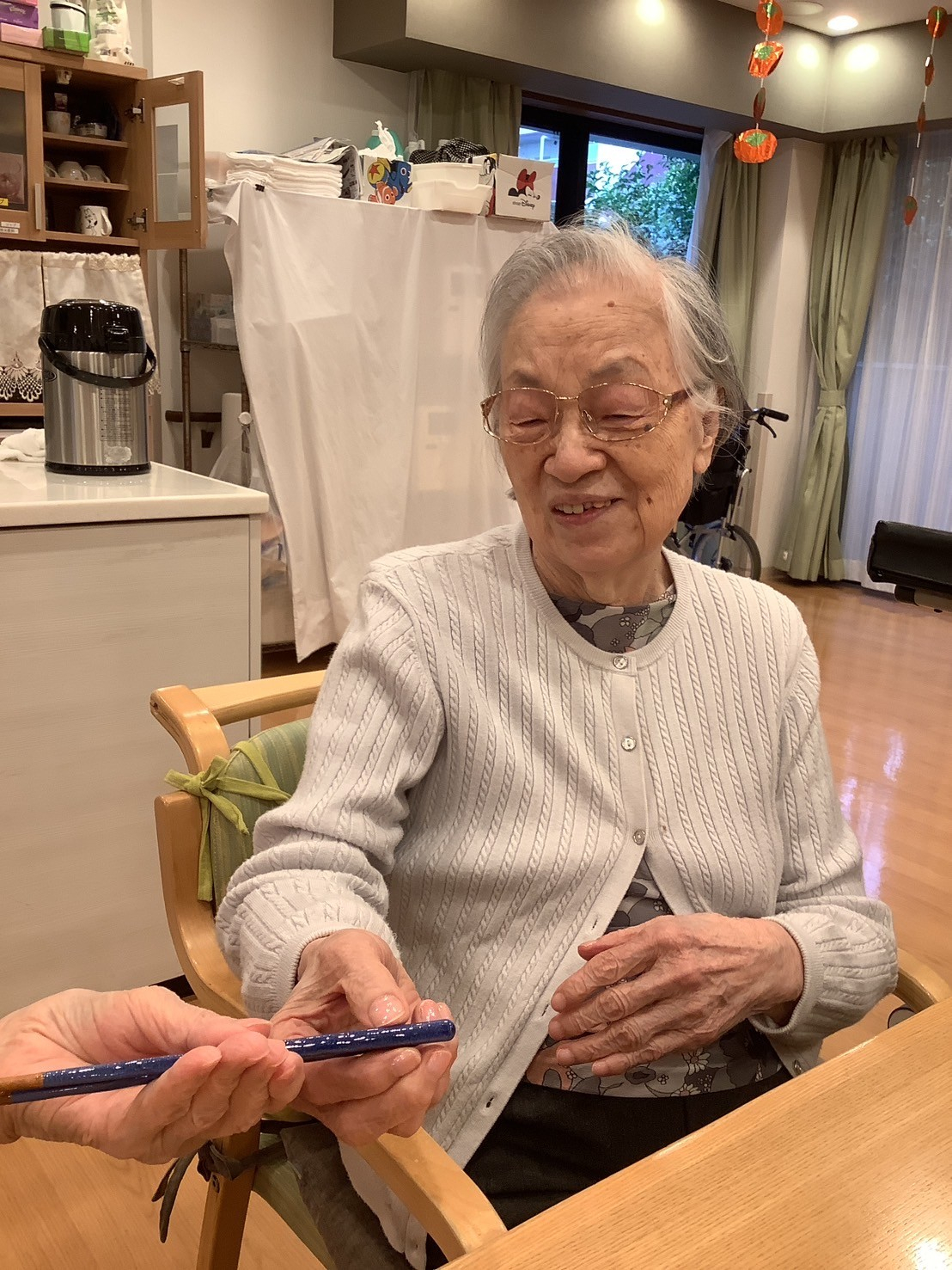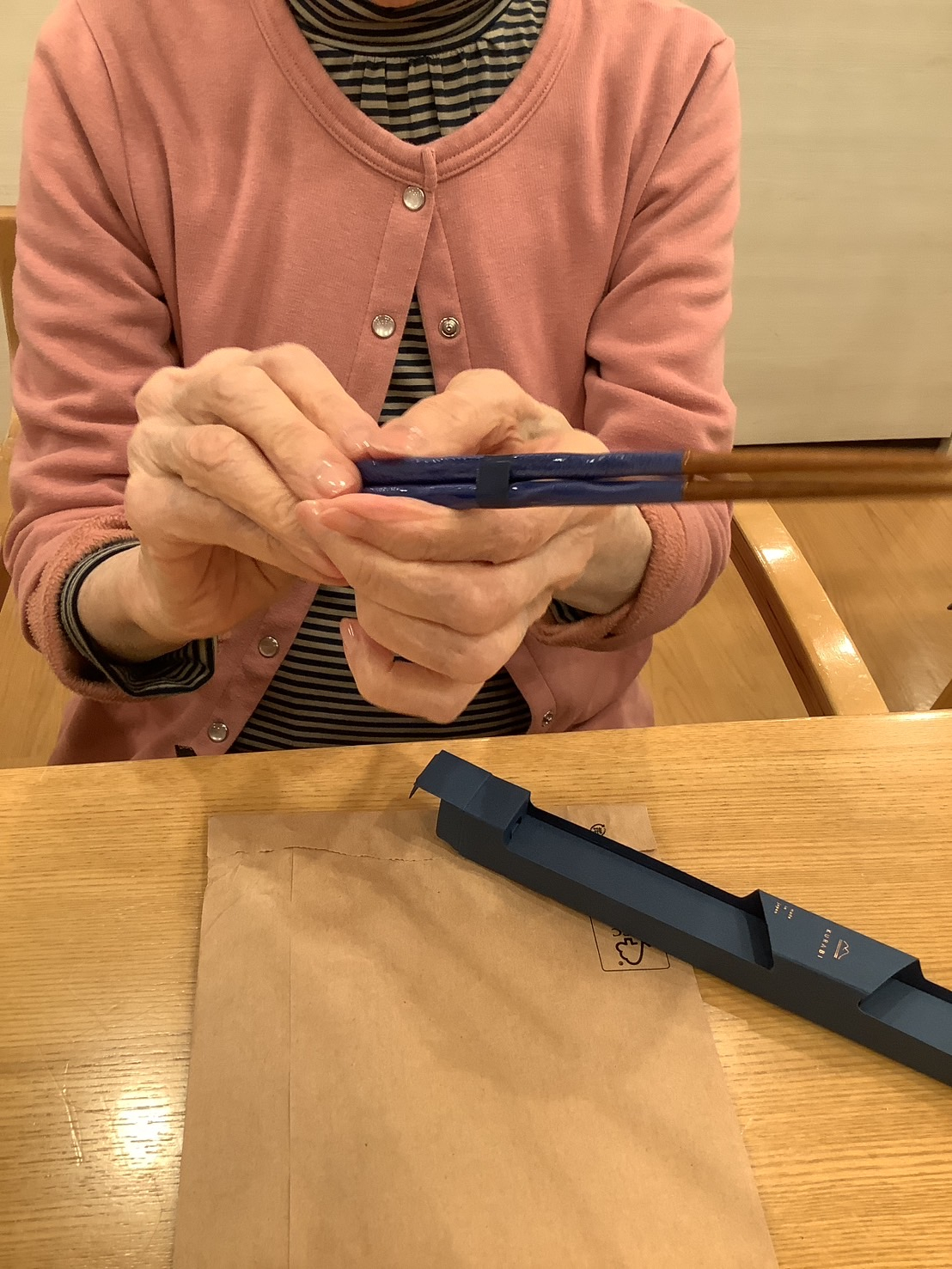 ツヤツヤのお箸です♪せっかくだから…ということで、ほかのご入居者様にも触っていただいていました!