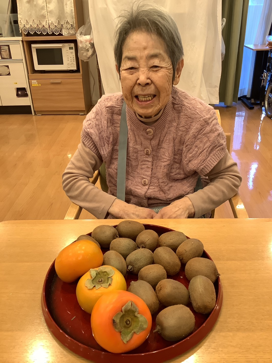 美味しそうな果物を前に、ご入居者様もこの笑顔ヽ(^o^)丿
