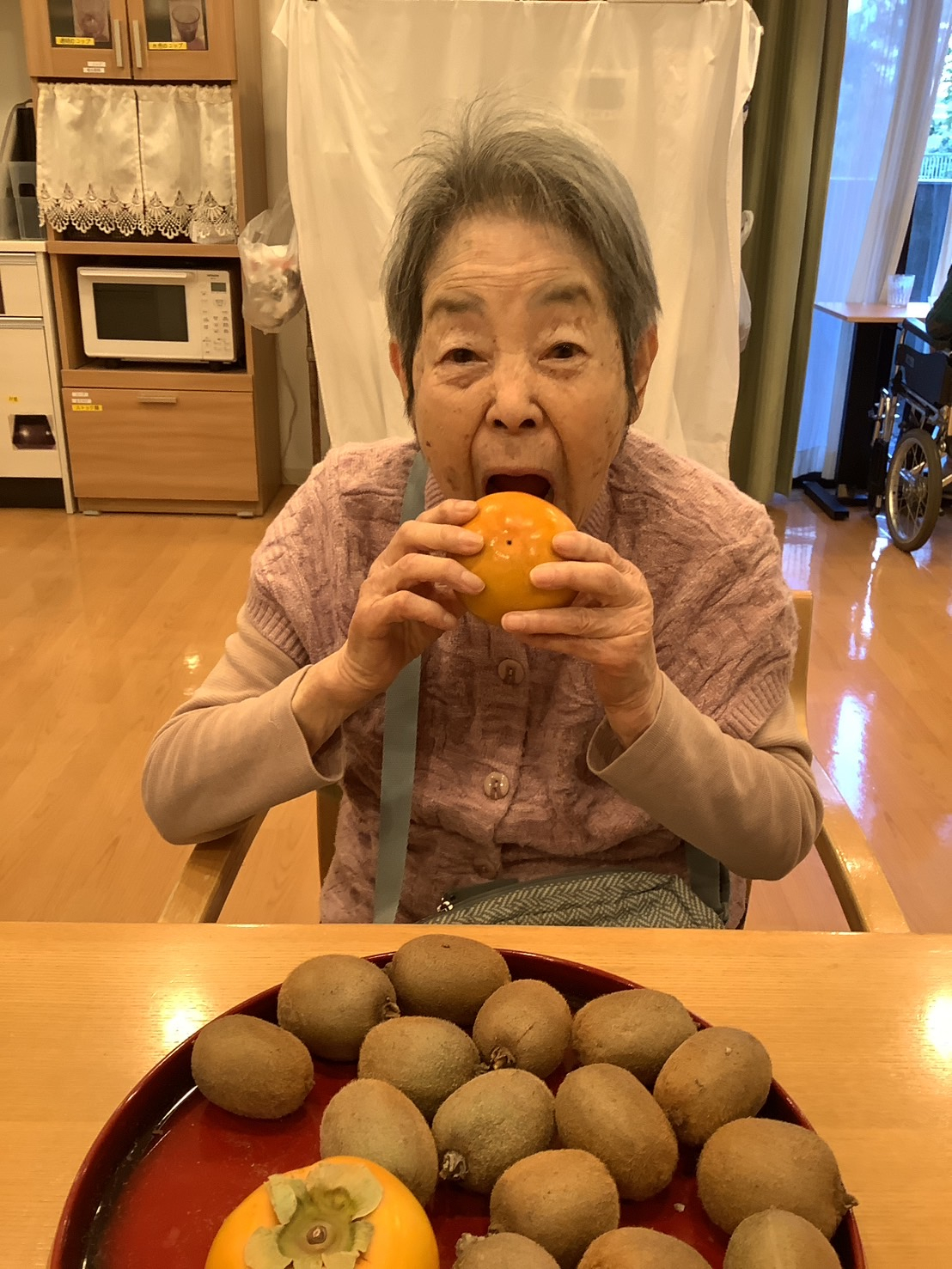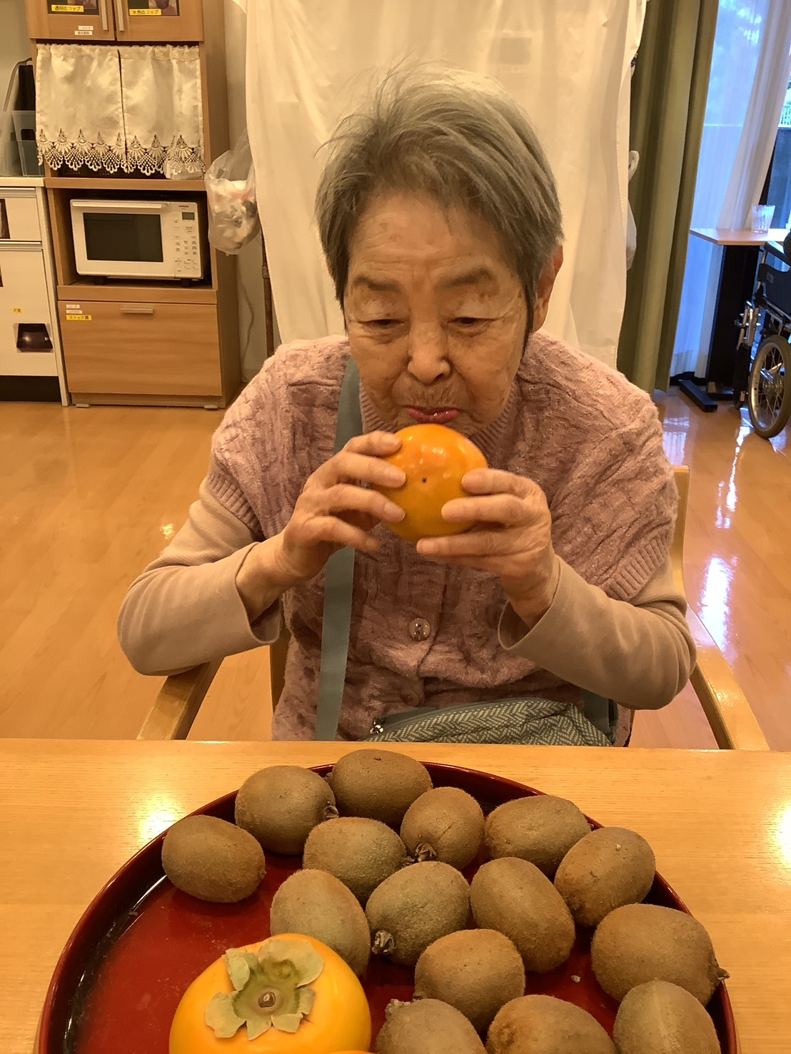 1階ではご入居者様方に季節を感じていただけるよう、今が旬の柿とキウイがテーブルにあります♪