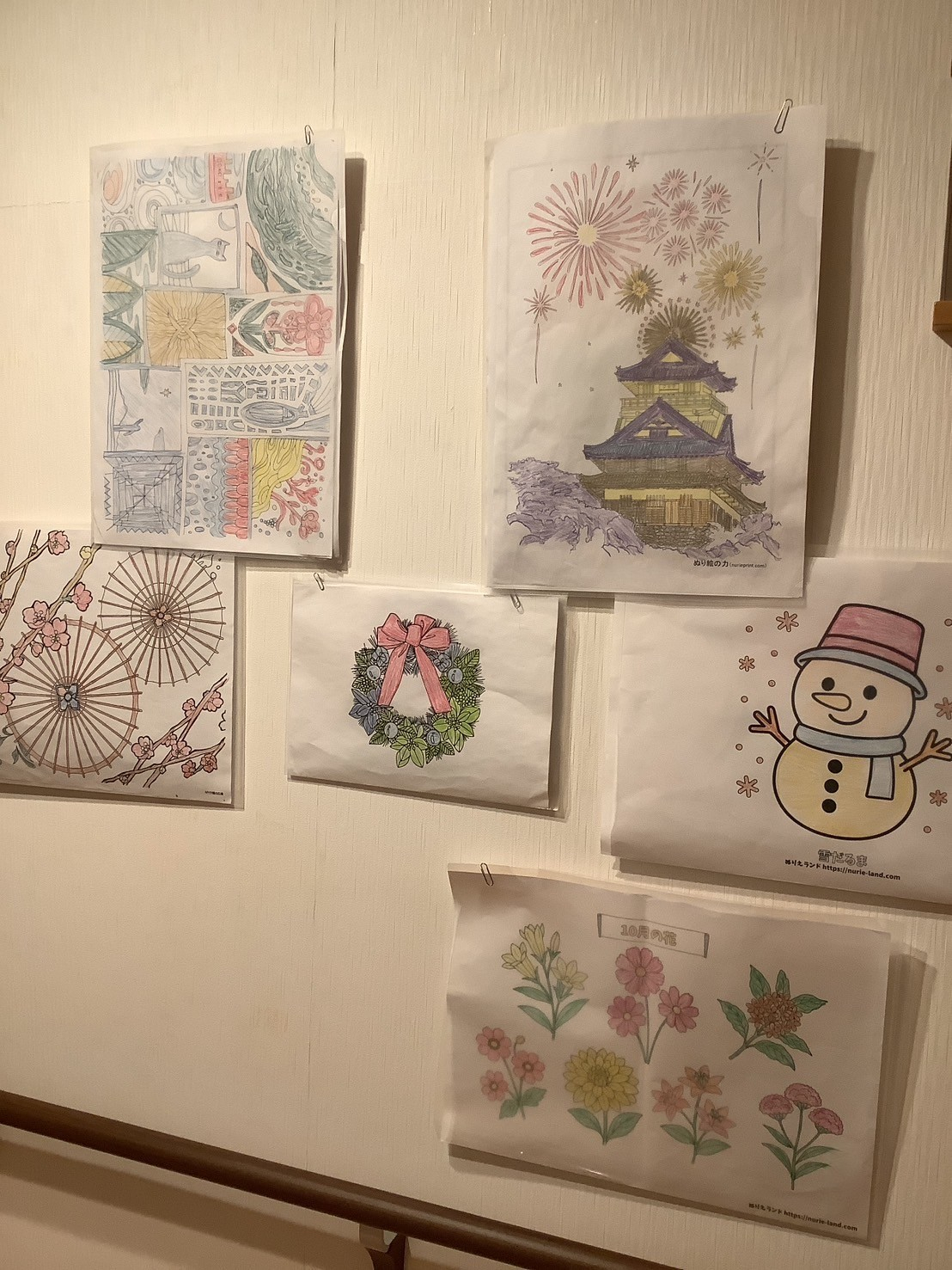 1階フロアには、ご入居者様がレクリエーションとして楽しんだ塗り絵の作品がたくさんあります。