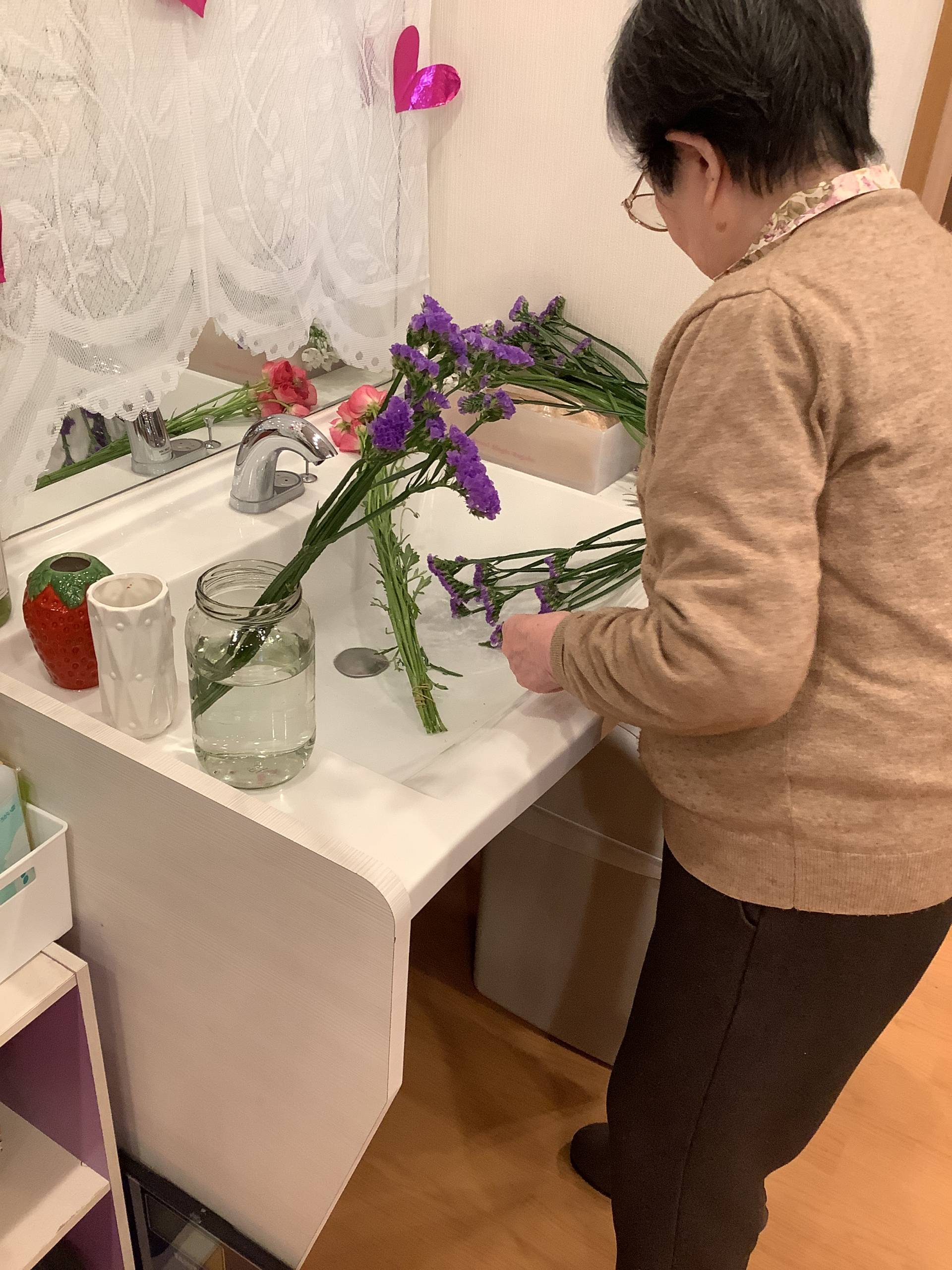 職員からお願いせずとも、ご入居者様が自主的に花瓶の水を交換してくださったり、傷んでいる箇所を切ってくださったりする光景がよく見られております(*'ω'*)