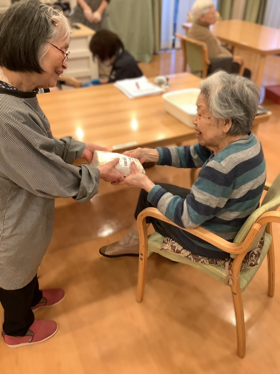 笑顔で手渡されると、受け取ったご入居者様も「ありがとうございます」と嬉しそうなご様子でした。お二人でお話しされる姿からは、温かい交流のひとときが感じられました。