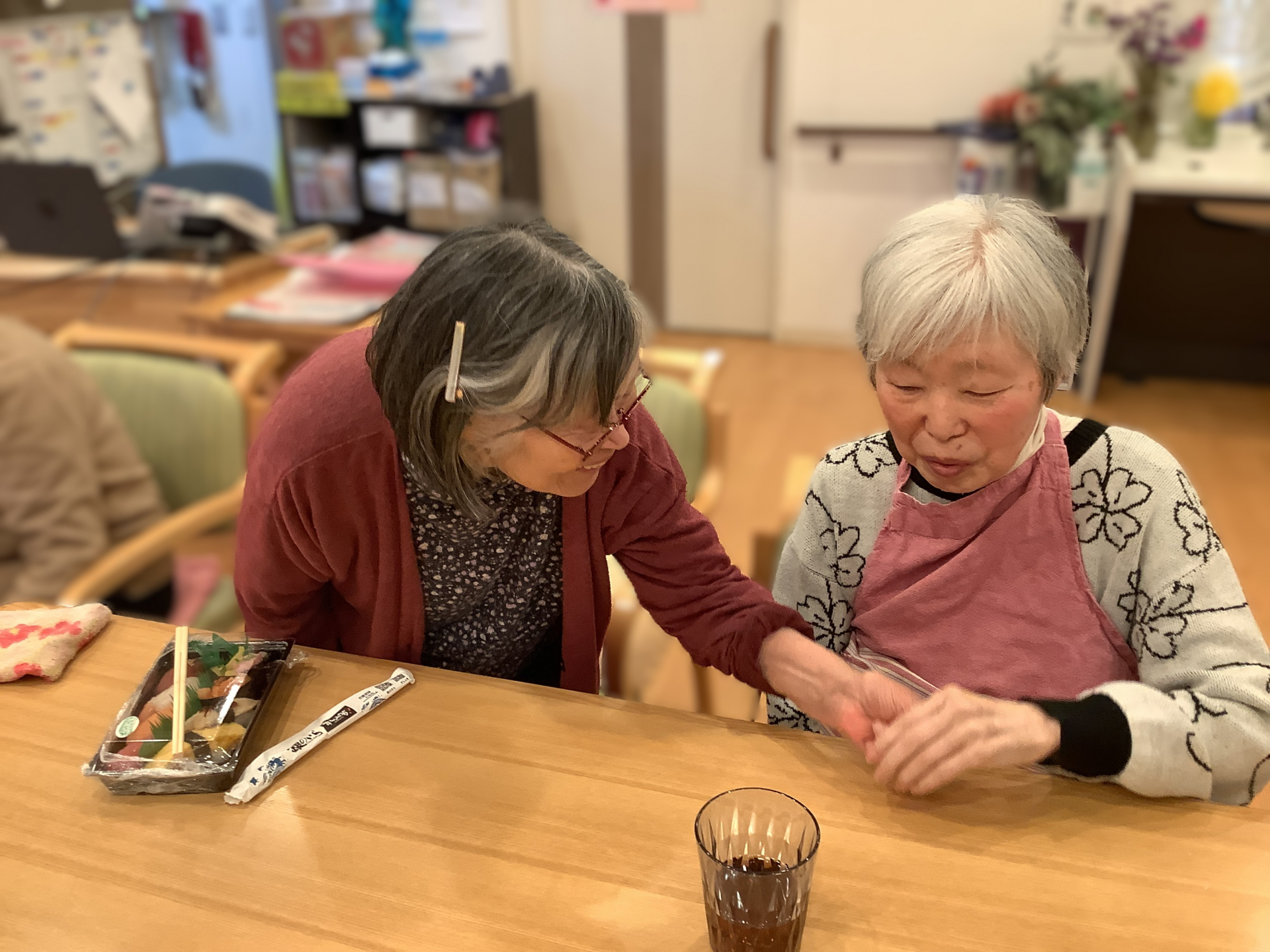 お食事前には、ご入居者様同士の仲睦まじい姿も拝見できました(*´▽`*)
