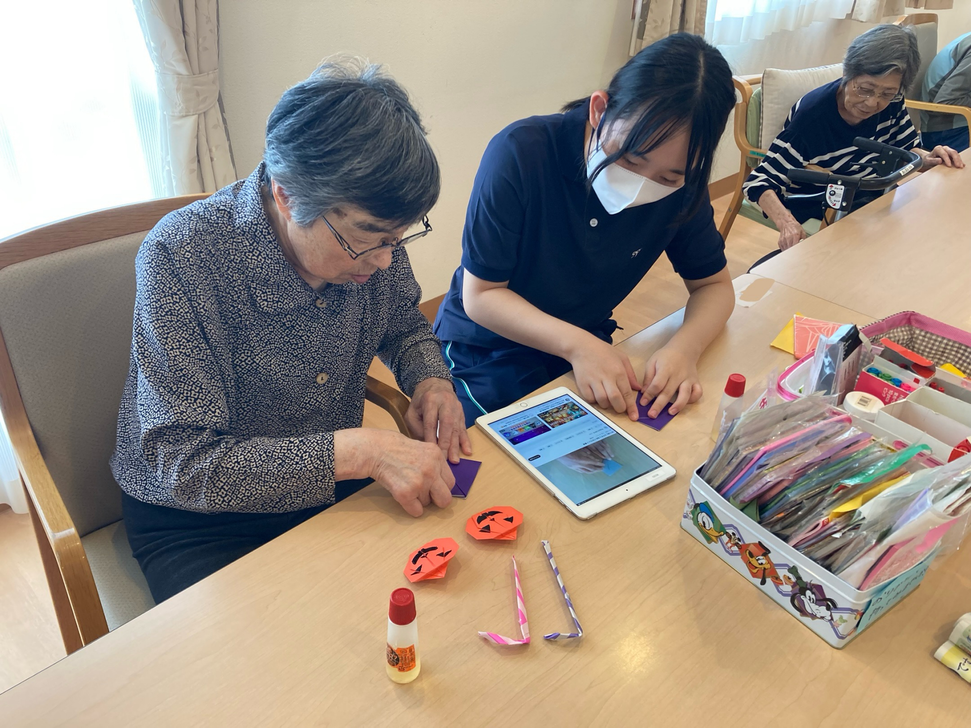 本日は、学生さんと一緒に、ハロウィーンをテーマにした折り紙づくりを楽しみました!