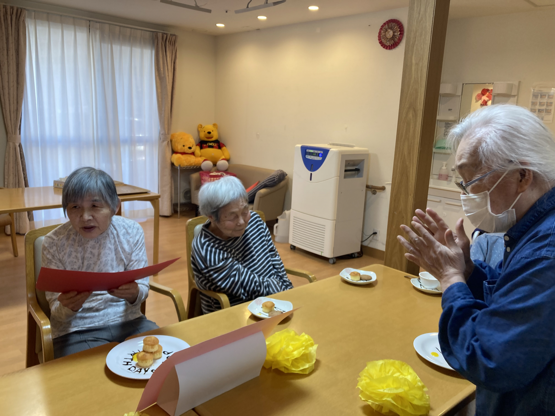 朝からD様はとても穏やかな表情で、職員や他のご利用者様からの「お誕生日おめでとうございます」の声に、笑顔で応えてくださいました。
