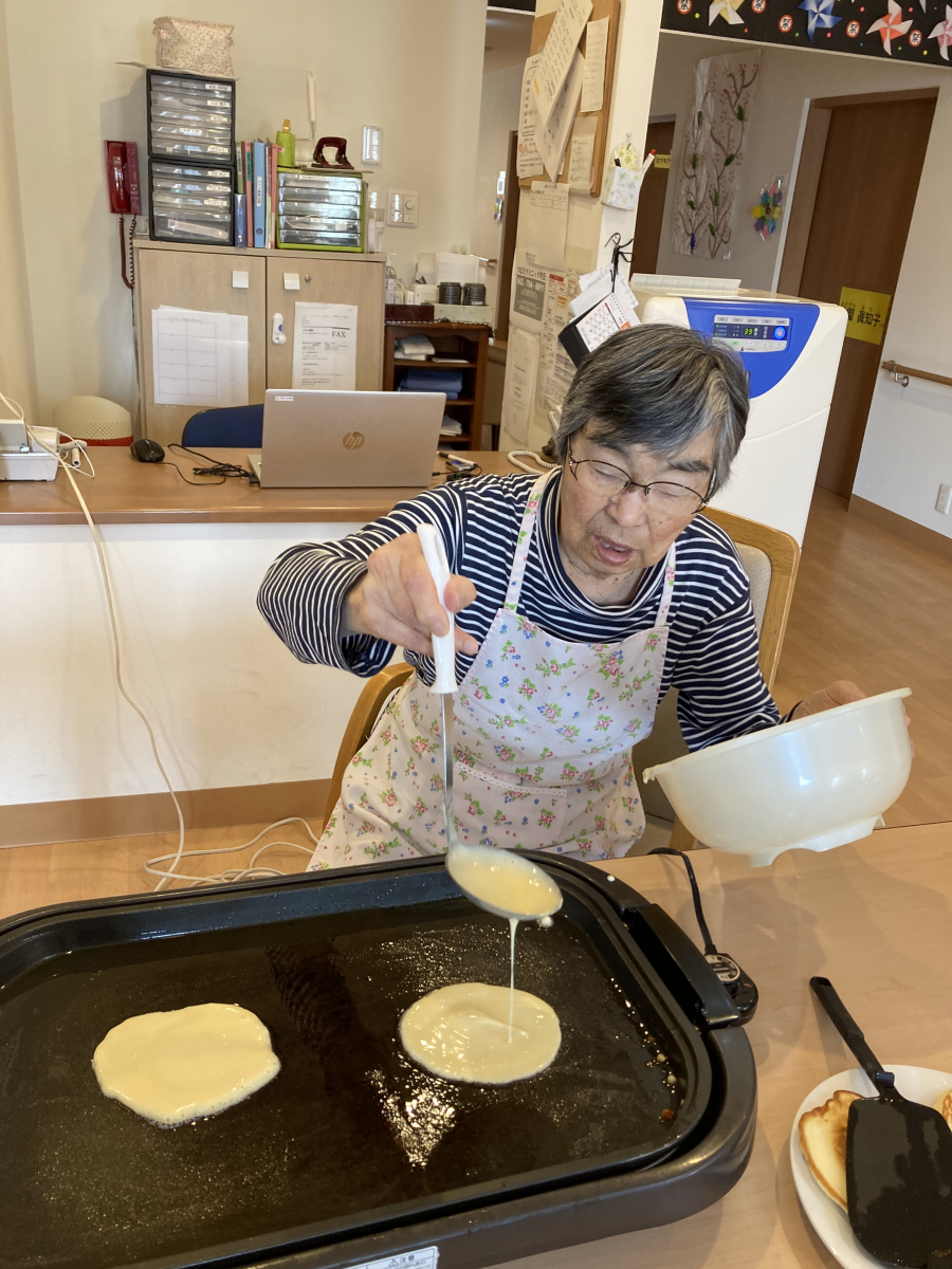 本日のおやつ作りでは、いつものパンケーキにひと工夫加えた 特製パンケーキ を皆さんと一緒に作りました。