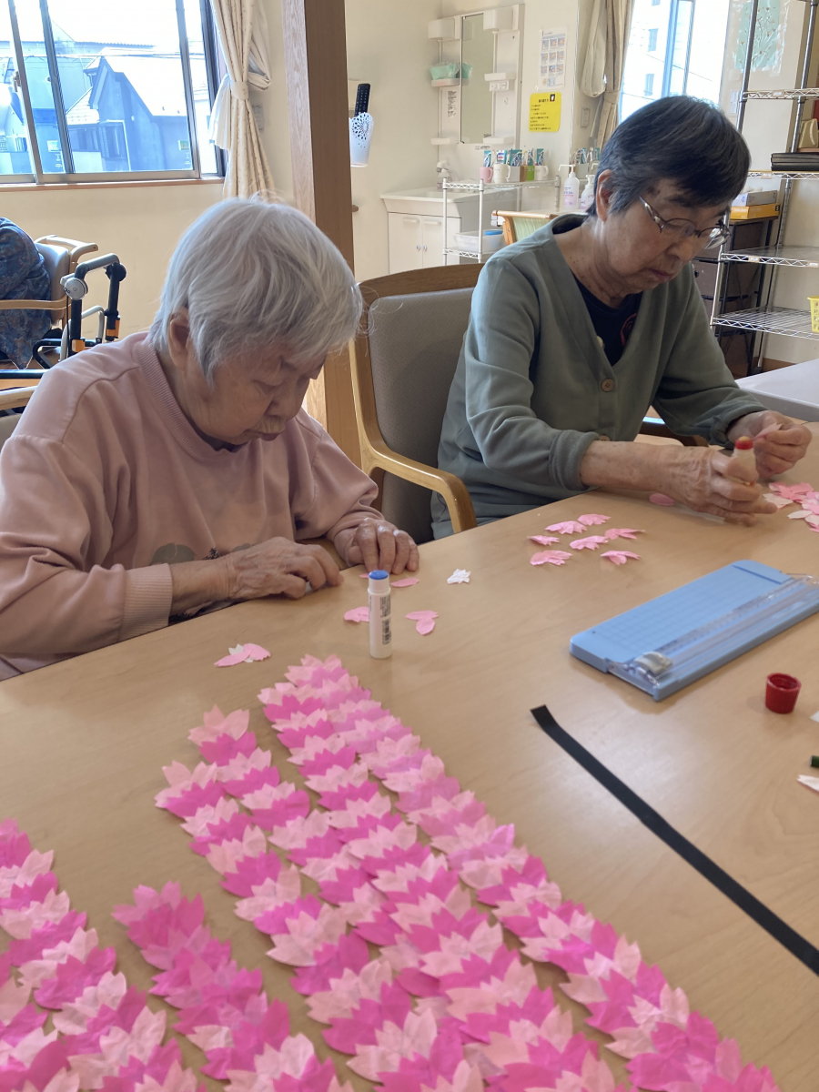 本日、春の訪れを感じていただけるよう「しだれ桜」の壁面飾りを制作しました。