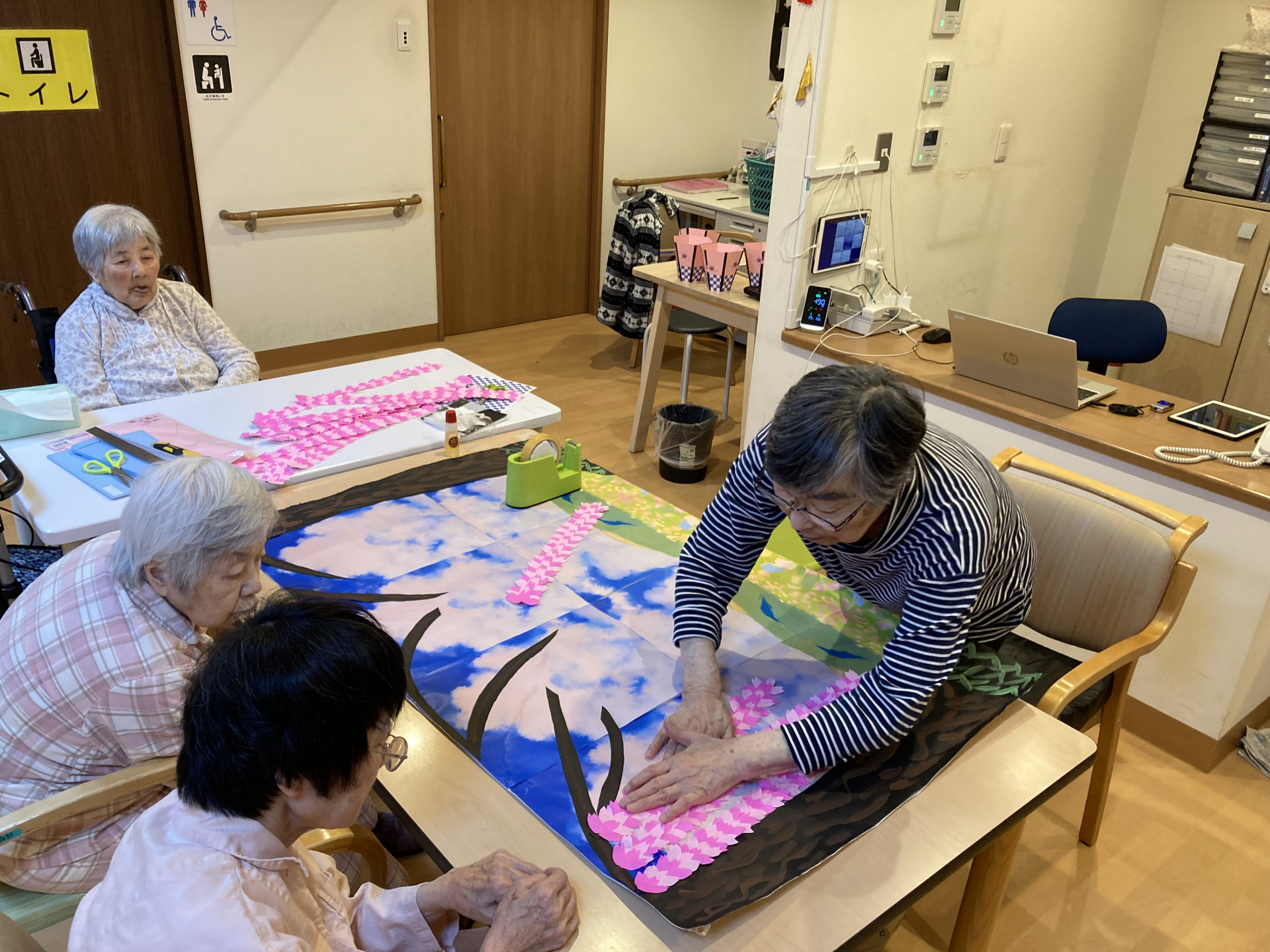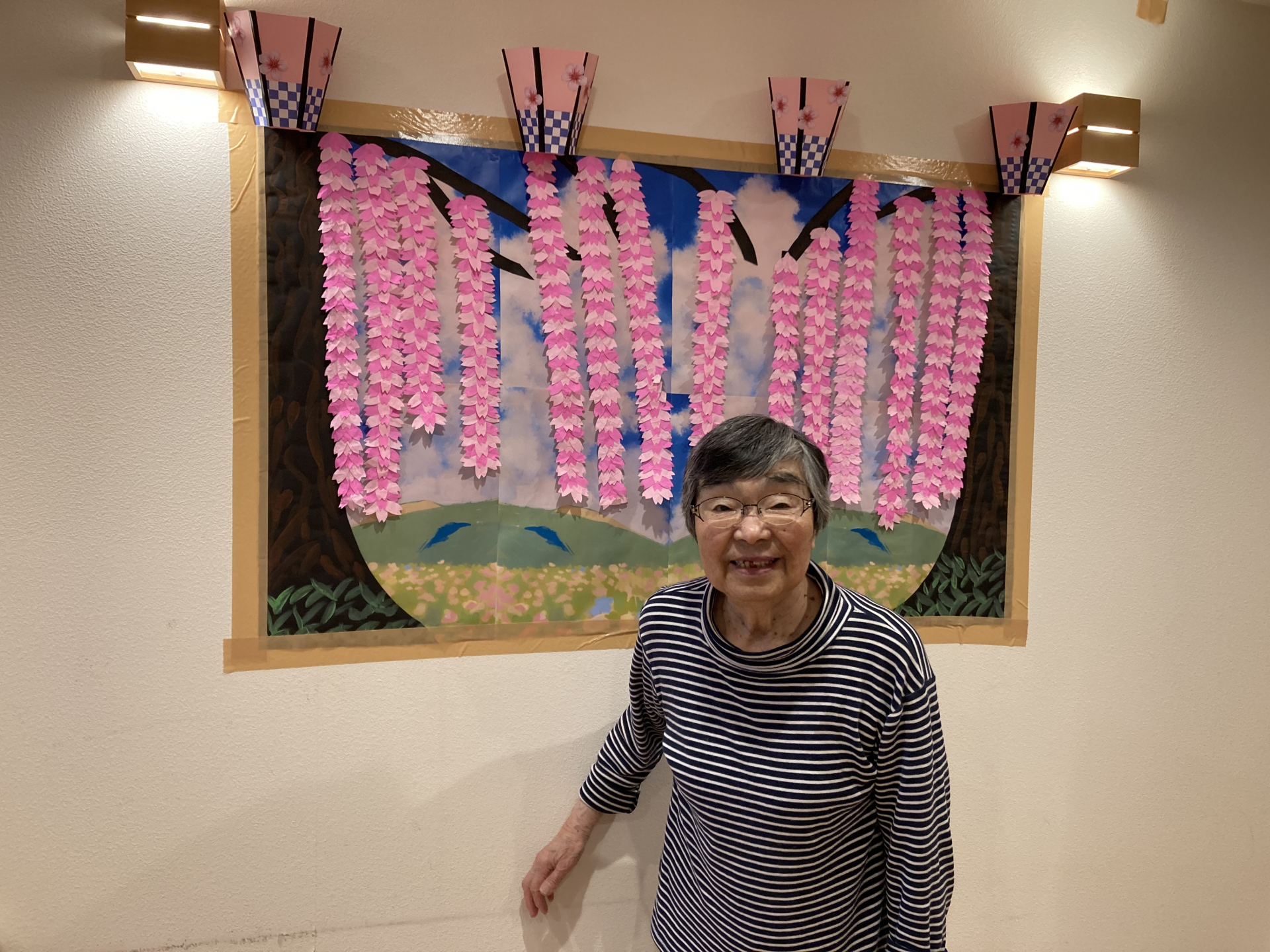 kami membuat hiasan dinding bertema “sakura menjuntai” untuk menghadirkan suasana musim semi di dalam fasilitas.