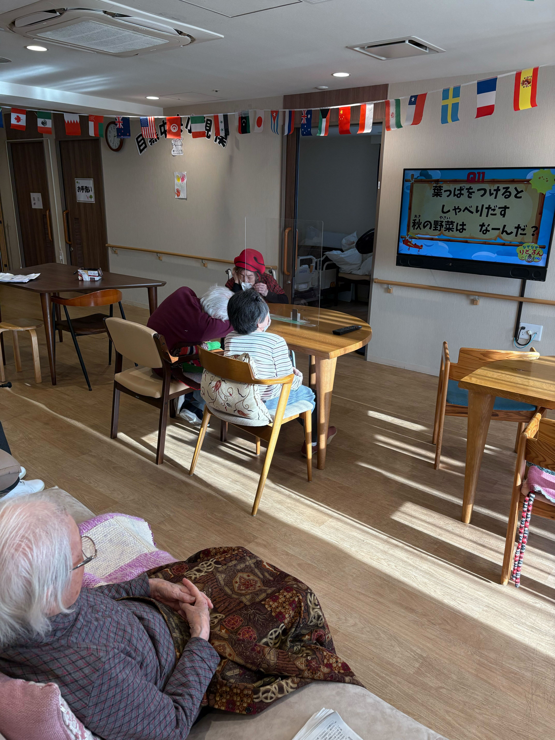この日はいい陽気で、ウトウトされているご利用者様もいれば、クイズに挑戦しているご利用者様もおられ、のんびりと過ごされております。